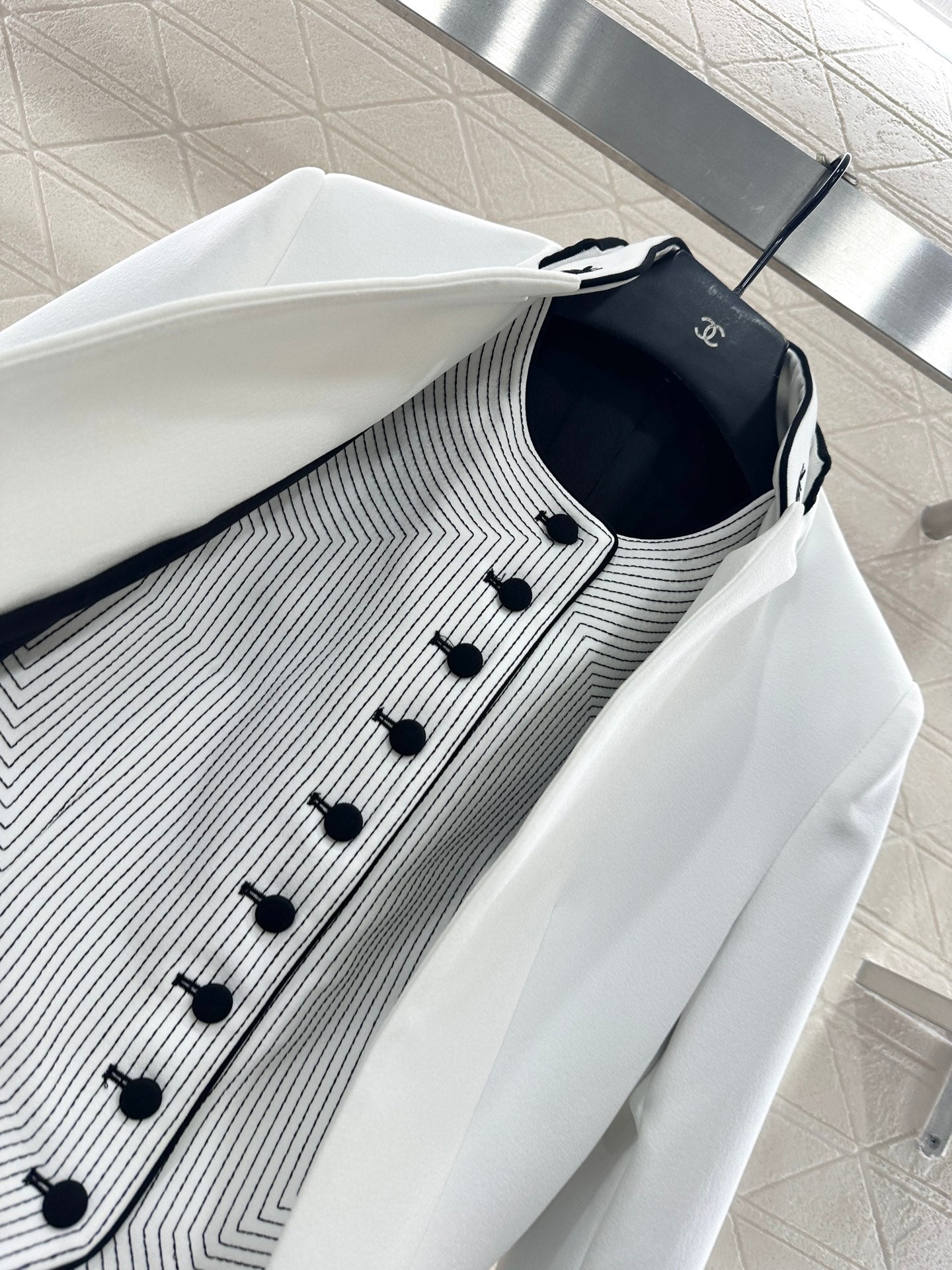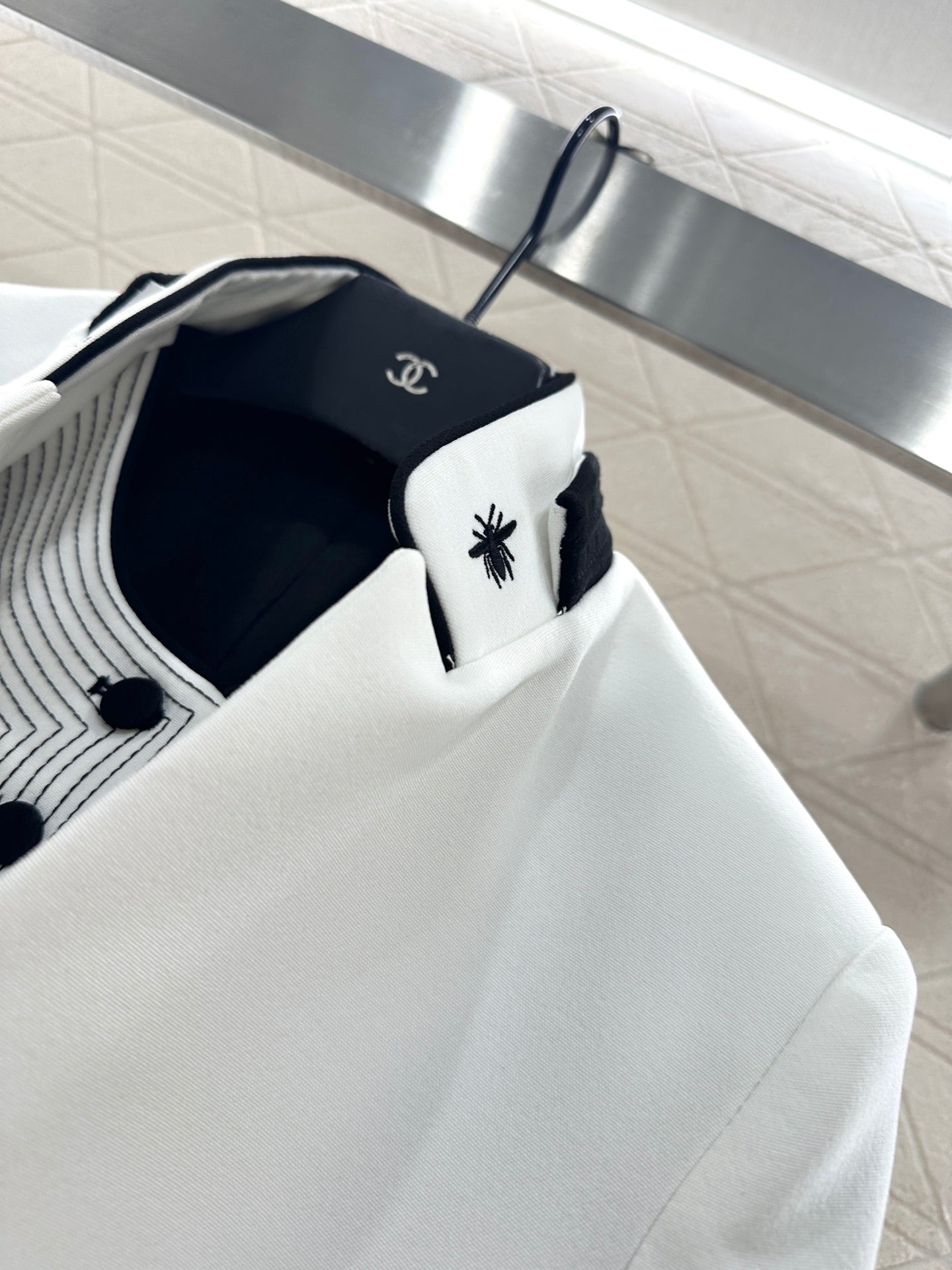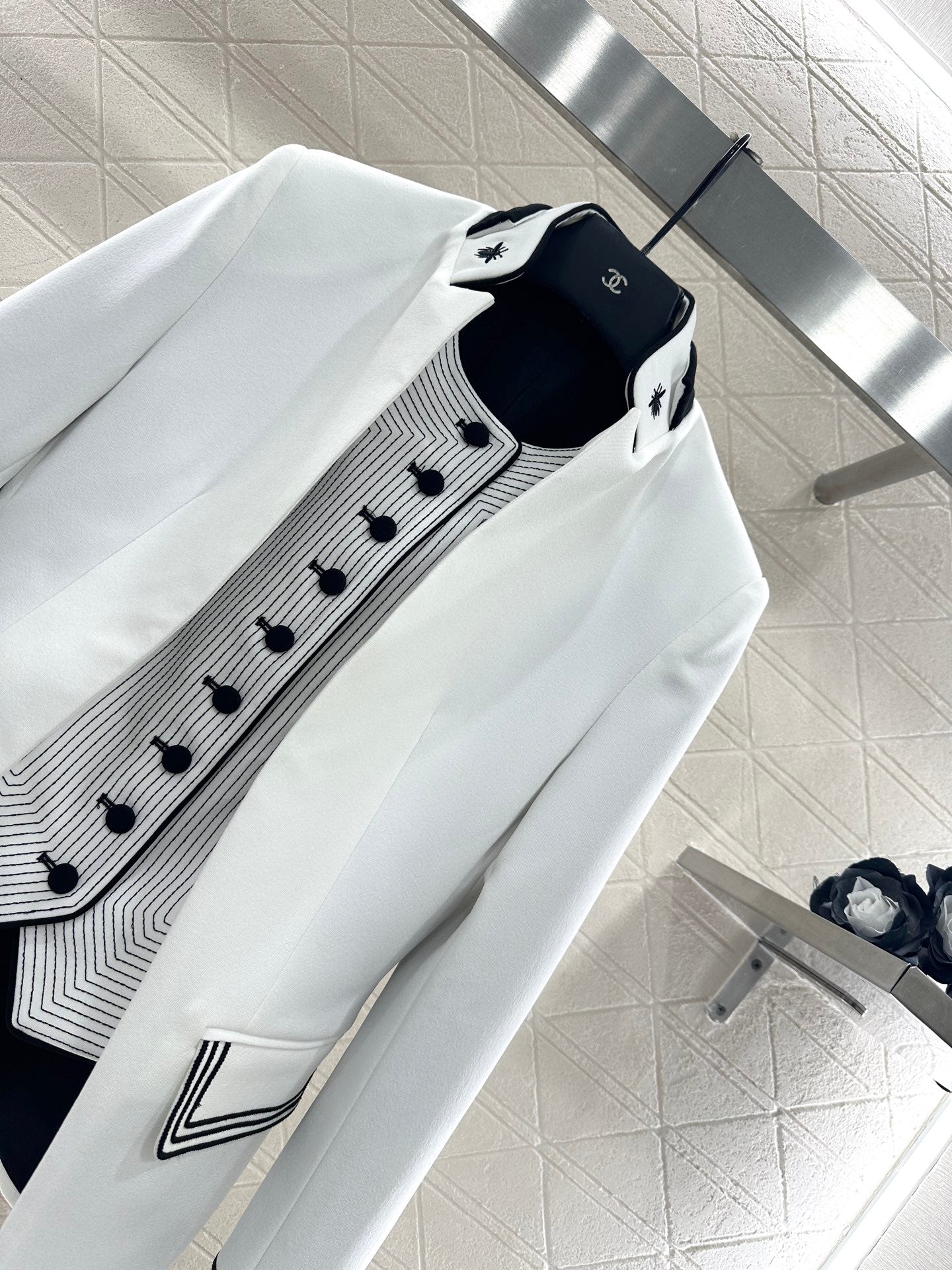 Custom-made YB imported materials, with a smooth feel and a crisp texture, the slim-fit stand-up collar suit jacket fits snugly to the body, making it look taller and more refined, highlighting the elite temperament. The open placket reveals a striped vest inside, creating a fake two-piece effect, which contrasts with the solid color of the outer body, enriching the visual effect. The striped details on the cuffs and pockets and the bee embroidery on the collar give it a high-end texture, perfect for commuting and attending important occasions, showing off your luxurious taste.