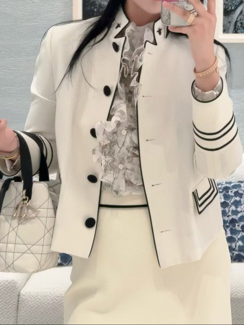 Customized YB imported material, the craftsmanship is smooth to the touch, showing a crisp texture, straight regular stand-up collar suit jacket version, three-dimensional tailoring to modify the body shape to make it more upright, highlighting the elite temperament, the whole body is based on a pure color, classic and durable, cuff pocket stripe details + collar edge bee embroidery, rich visual effects, full of high-end texture, commuting and attending important occasions, showing luxury taste