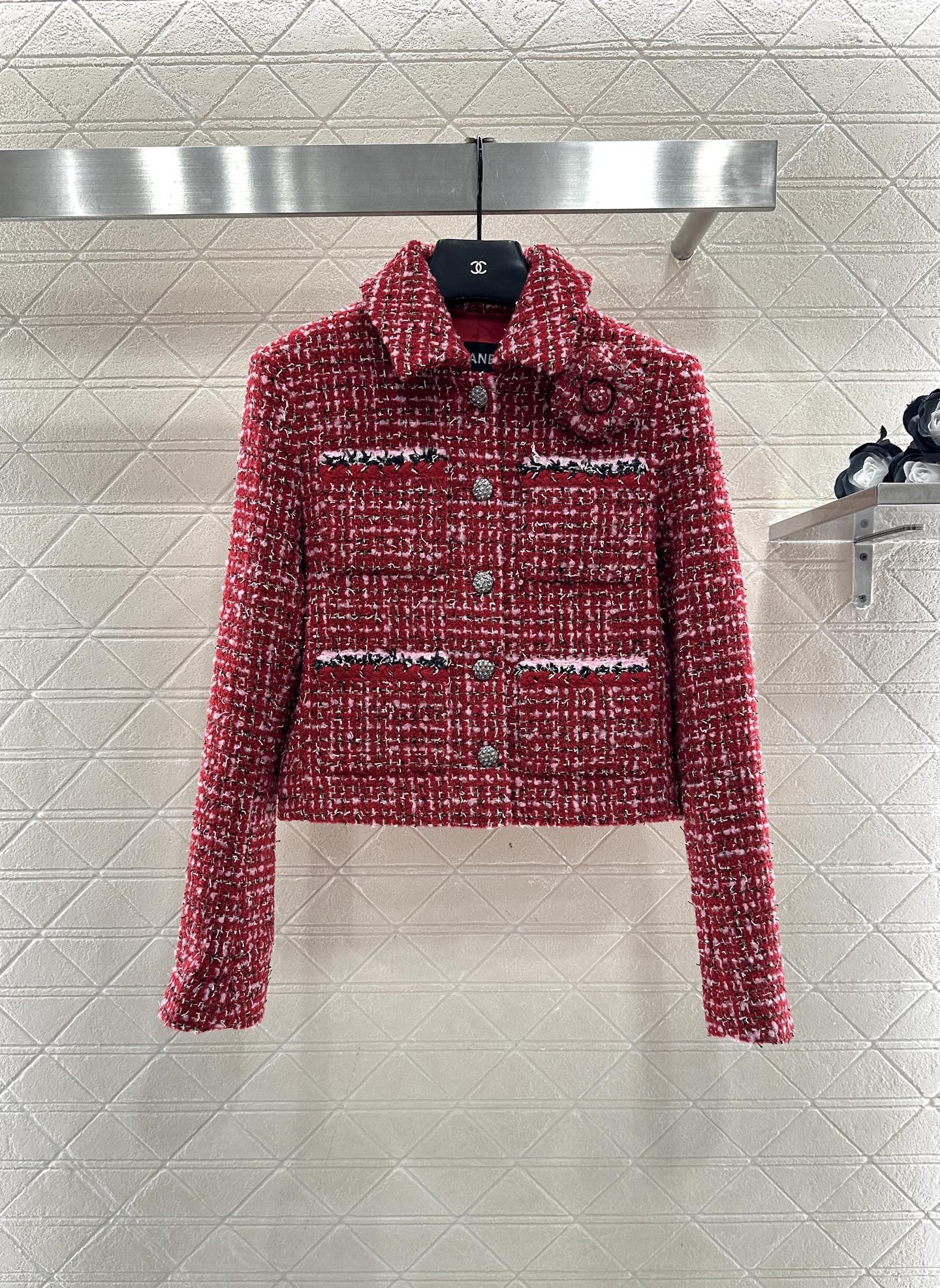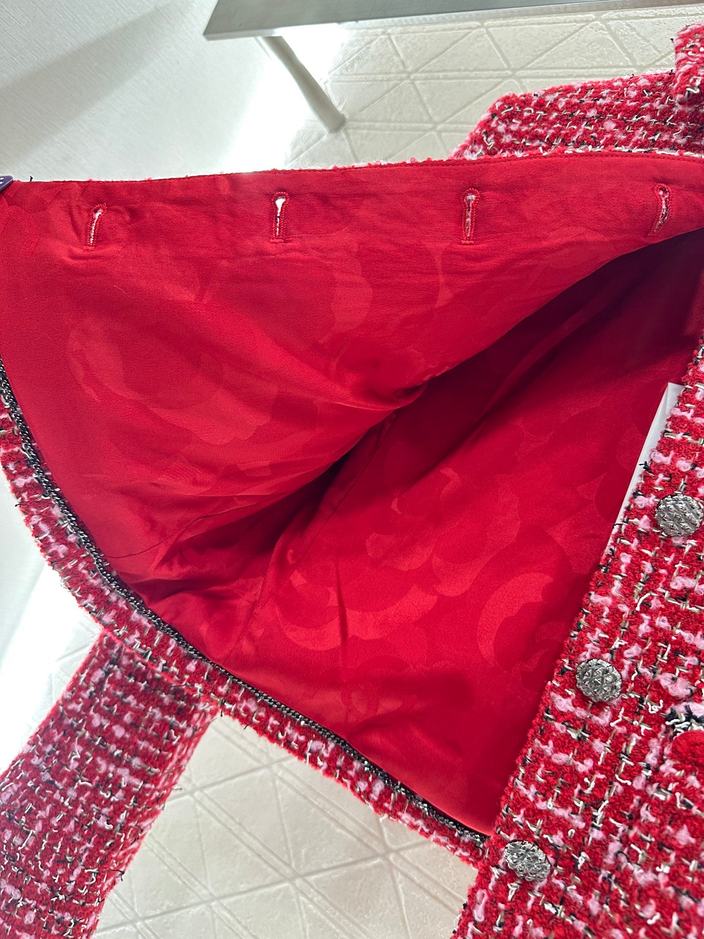 Made of coarse woolen material, with a high-end texture and a full appearance, this round necked dress jacket has a design that fits the human body with shoulder pads, making the body appear slender and straight. The large neckline extends to the front hem and is made of pink ➕ The black woven edge lights up the details, echoing the cuff pockets. The red background color is interwoven with delicate colored yarn rules to create a texture that covers the whole body. Paired with a three-dimensional camellia brooch on the chest, the socialite style stands out, perfectly interpreting the elegant and luxurious feeling. Paired with skirts and pants, the upper body exudes a luxurious texture, intellectual and gentle, making it an excellent choice for Christmas, New Year and year-end gatherings