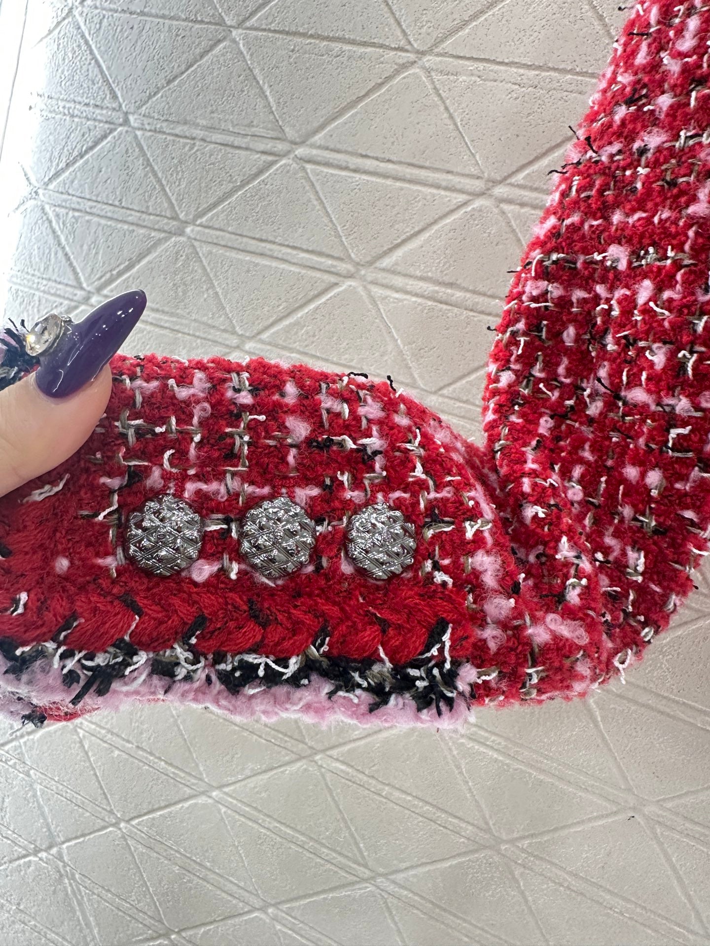 Made of coarse woolen material, with a high-end texture and a full appearance, this round necked dress jacket has a design that fits the human body with shoulder pads, making the body appear slender and straight. The large neckline extends to the front hem and is made of pink ➕ The black woven edge lights up the details, echoing the cuff pockets. The red background color is interwoven with delicate colored yarn rules to create a texture that covers the whole body. Paired with a three-dimensional camellia brooch on the chest, the socialite style stands out, perfectly interpreting the elegant and luxurious feeling. Paired with skirts and pants, the upper body exudes a luxurious texture, intellectual and gentle, making it an excellent choice for Christmas, New Year and year-end gatherings