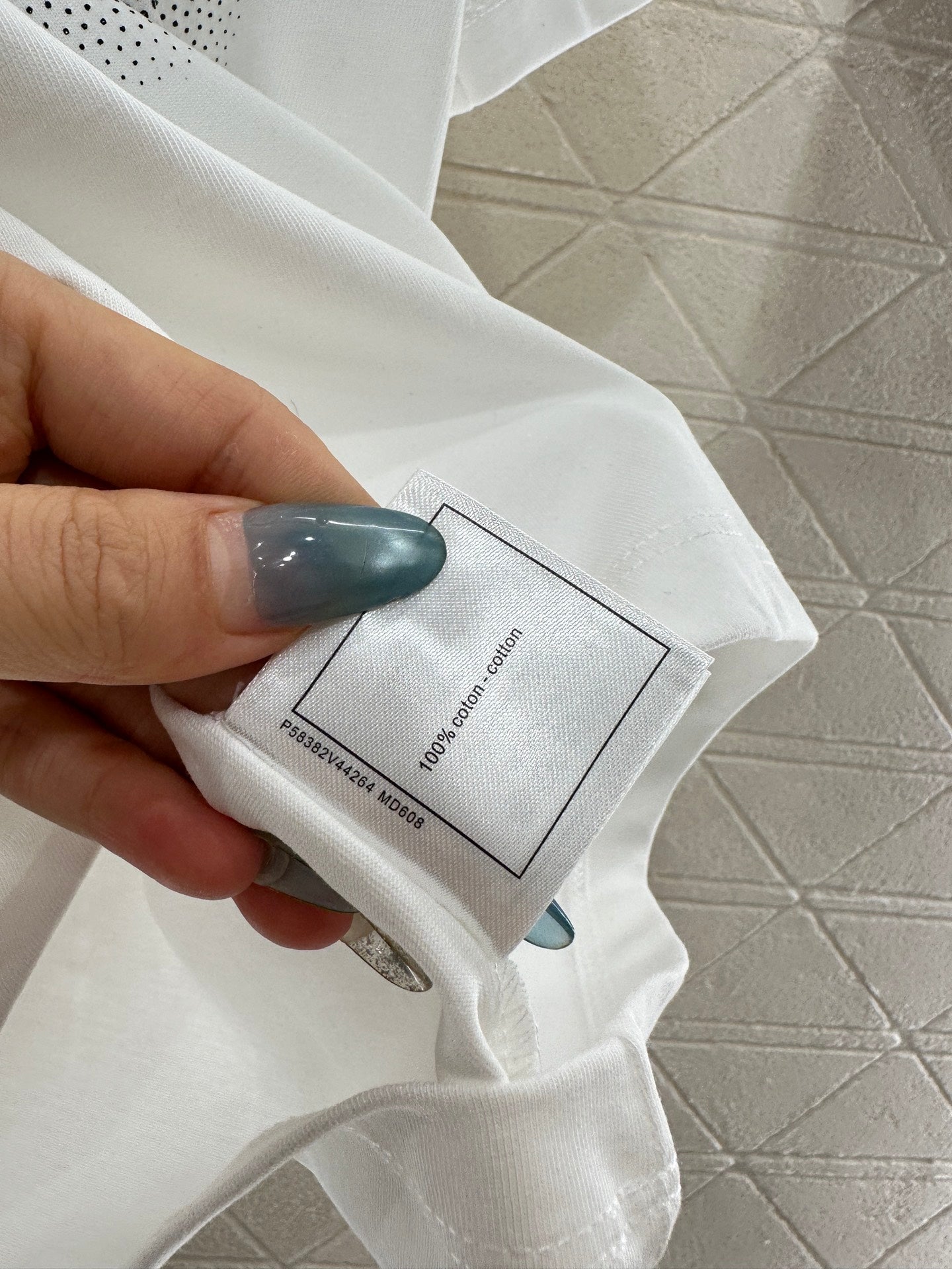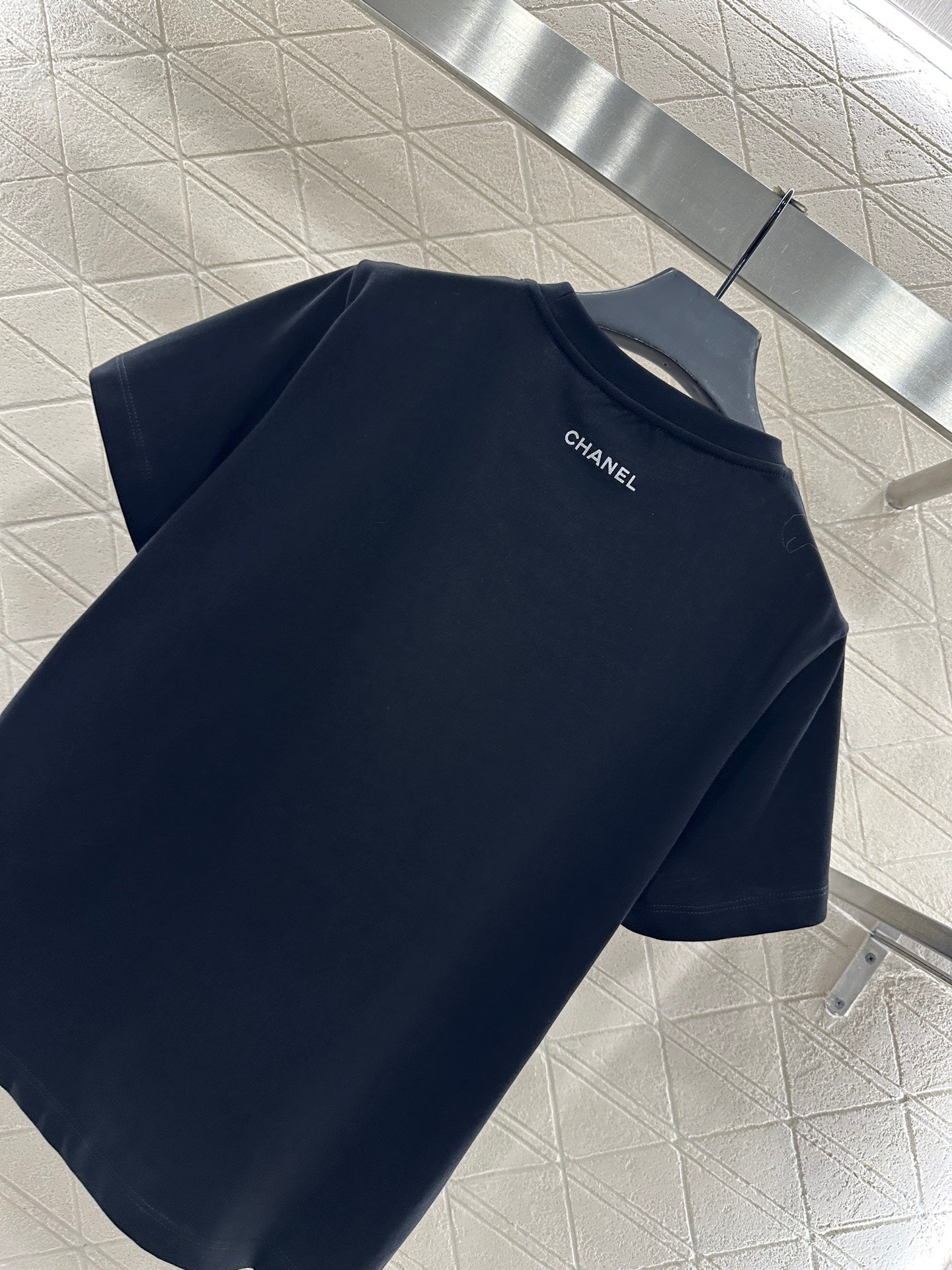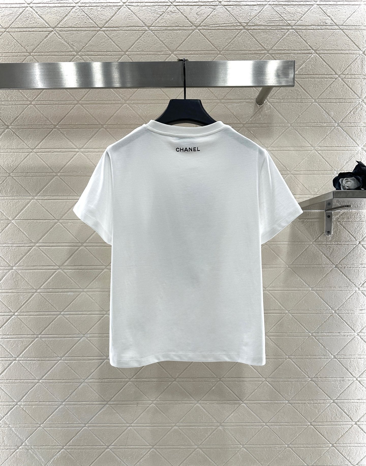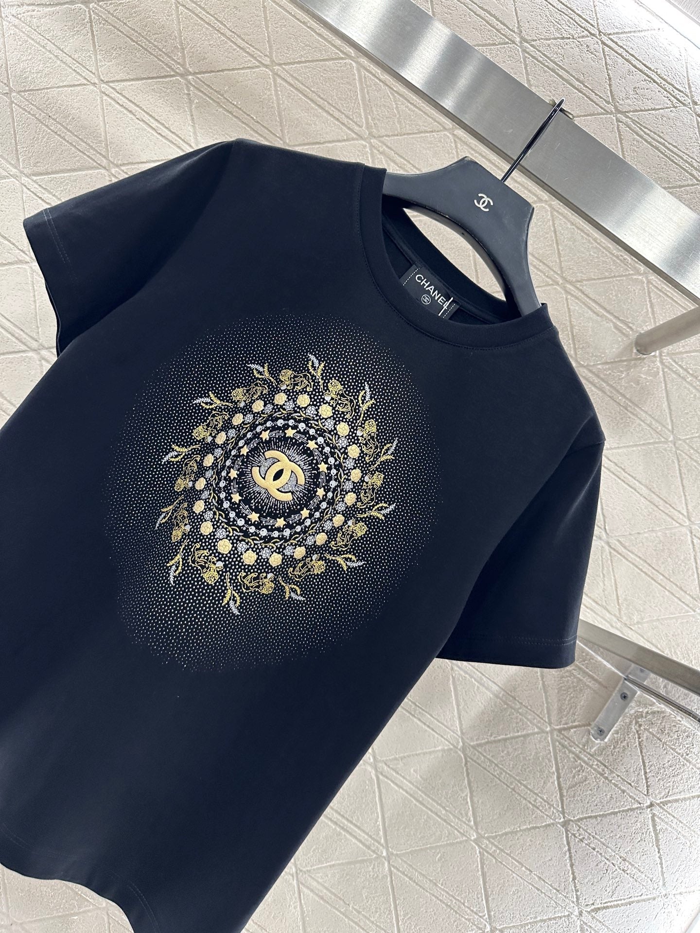 Made of all cotton material, soft and skin friendly, comfortable and stylish, with a regular short sleeved design. The main color of the body is yellow, white, and black, and the shooting star is outlined layer by layer from the inner circle to the outer circle ➕ camellia ➕ vine ➕ Lion and other elements, centered double C pattern, echoing with the back neckline, stacked with fragrant elements, rich layers, delicate and elegant style, strong retro style, conventional version accommodating body shape, playful and fashionable, easy to handle for daily travel or gatherings.