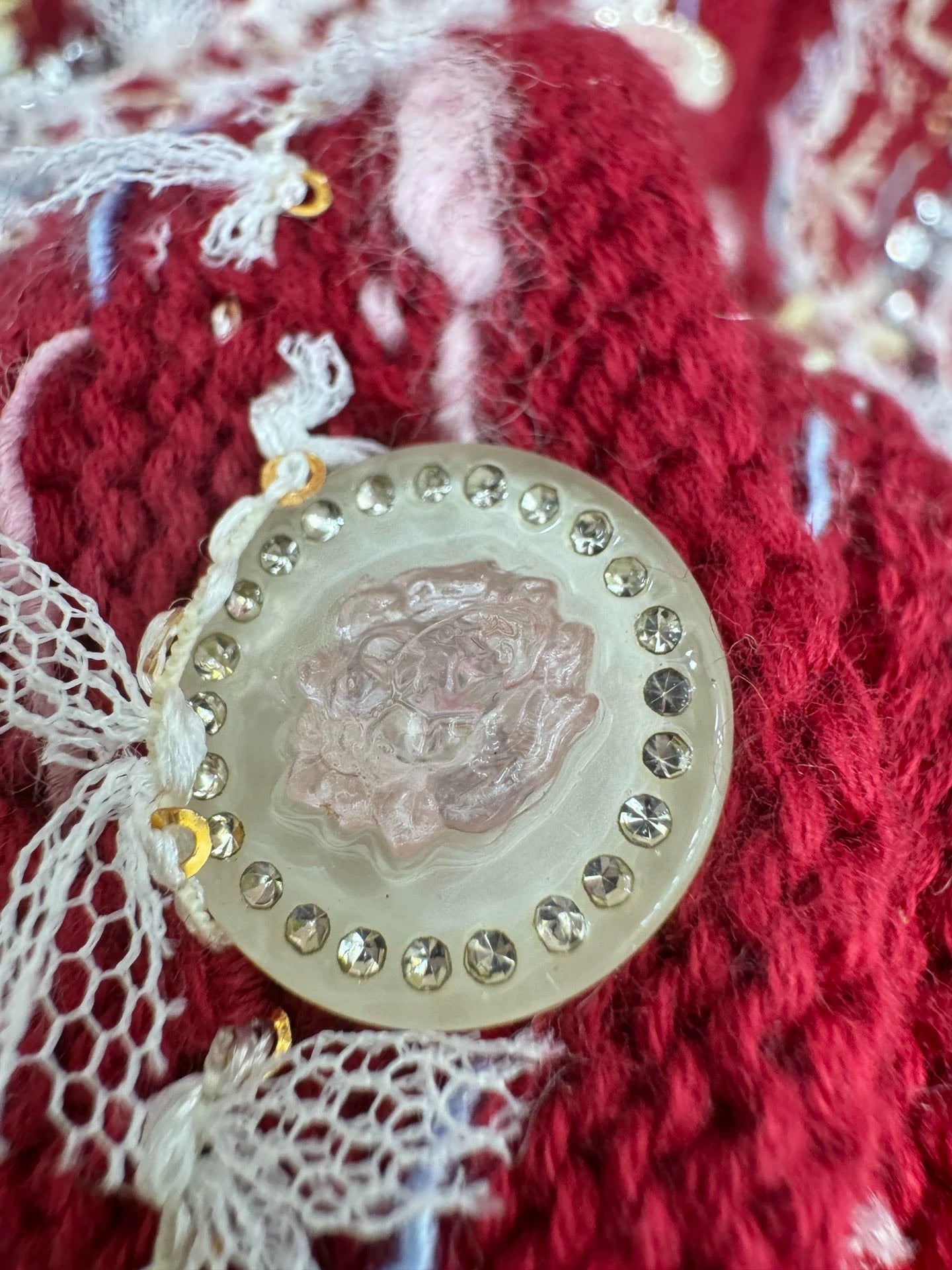 -+Details: Red body with white tassels, gold button accents, exquisite lace decoration