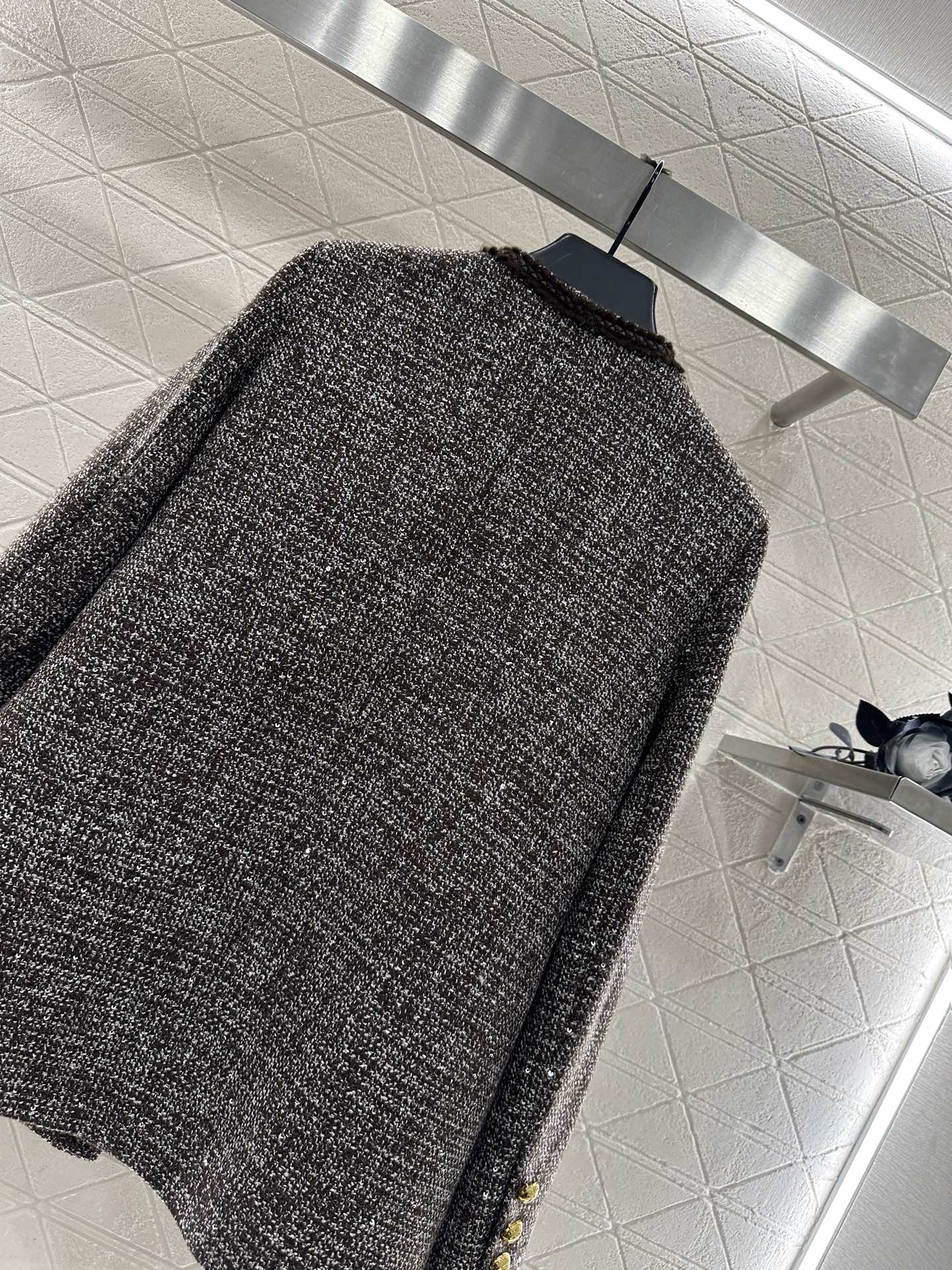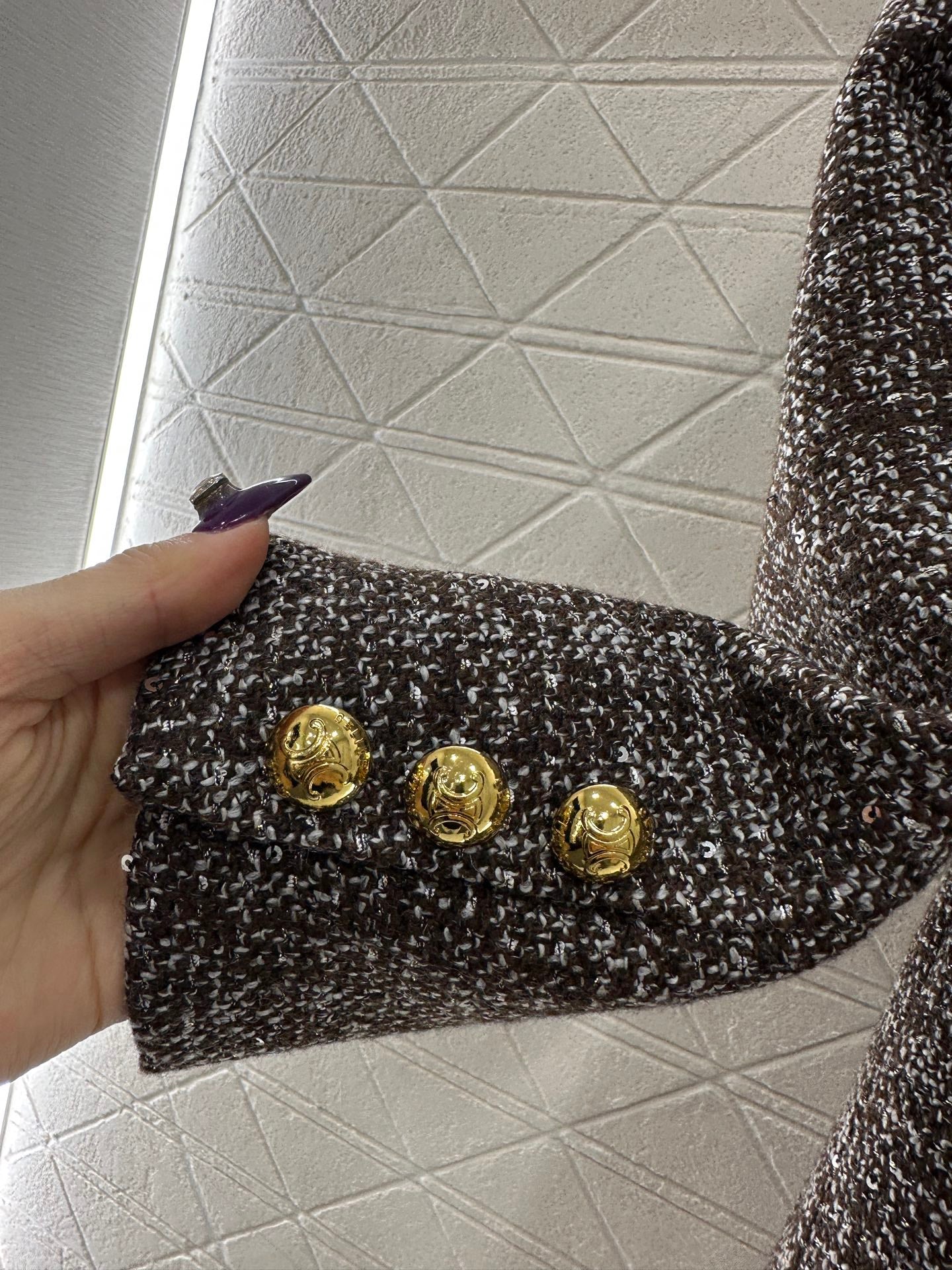 Made of coarse woolen material, with a high-end texture and full appearance, this round neck dress jacket is designed with shoulder pads that fit the human body, making it appear slender and upright. The collar and pockets are tied with contrasting colors, and the velvet pockets collide with the overall weaving feeling. The golden round buckle is the finishing touch, giving it a sense of luxury. The dark brown chocolate base color is matched with delicate reflective yarn throughout the body, and the regular interweaving of textures covers the whole body, making the socialite's style stand out and full of luxury