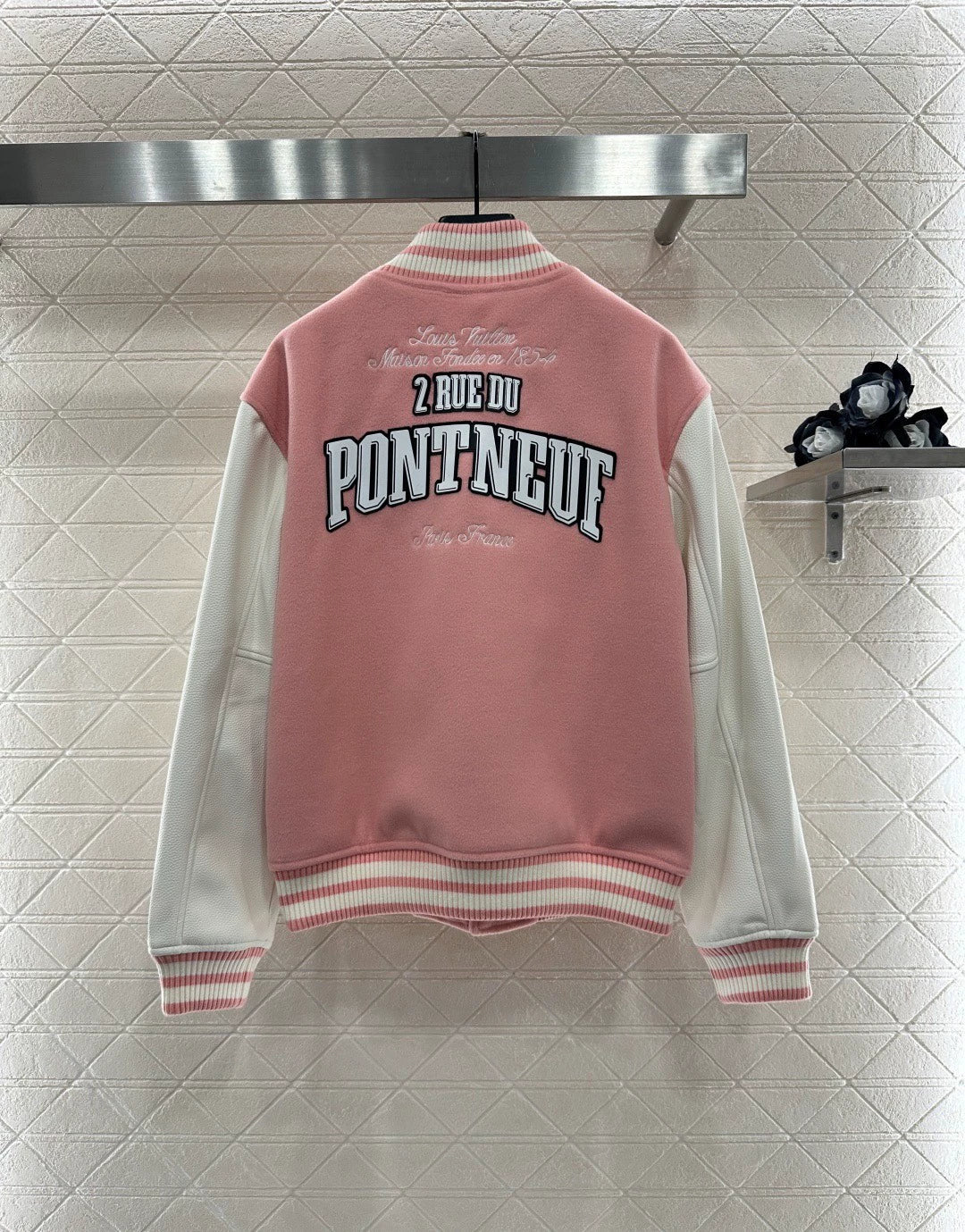 High quality and stylish stand up collar baseball jacket with a sleek cut and leather sleeves. Shoulder blocking and contrasting colors are used to easily outline right angled shoulder lines. The edging stripes are threaded and elastic, making it easy to put on and take off. The signature four leaf clover and letter elements are highlighted, highlighting the gorgeous brand tone