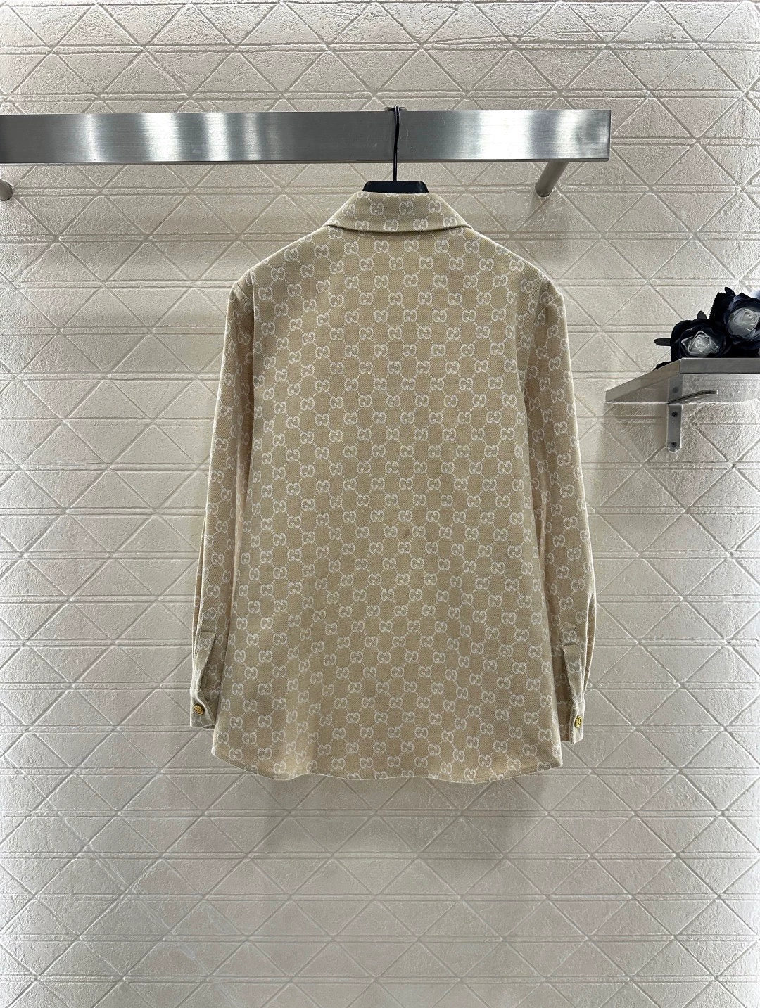 Jacquard material texture is high-end and comfortable to wear, with a collar shirt and straight leg pants set. The top can be used as an outerwear, and the full body jacquard technology is fully covered with double G letter patterns, giving a strong sense of money. The front shoulder lines are matched with genre cuts to highlight the upright and neat posture. The same series of straight leg pants are printed with gold buckles to highlight the vitality of the leather