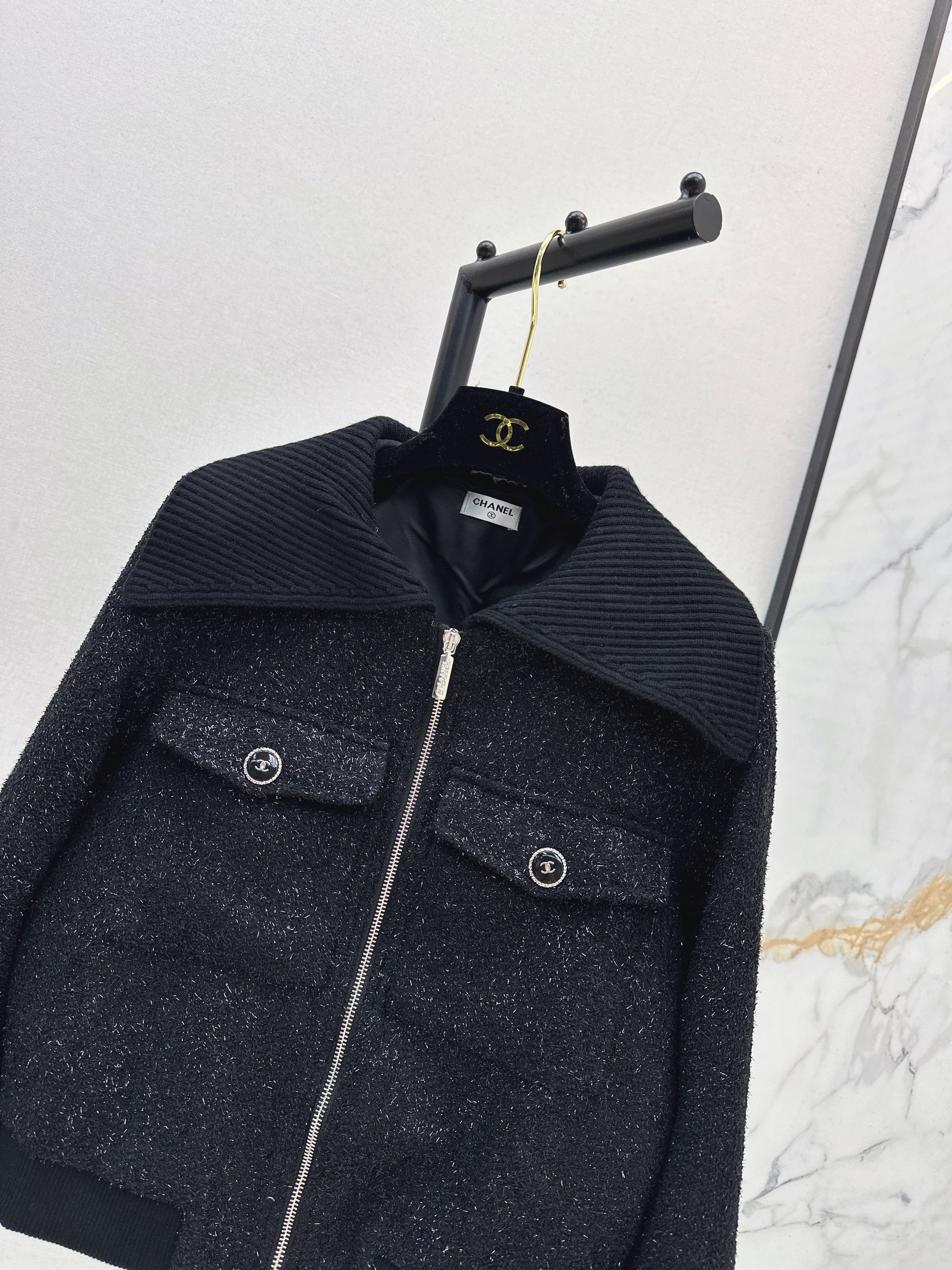The silver wire coarse spinning material has a clear texture and superior quality. The black silver wire interweaves to create a coarse tweed texture with obvious threads, a large lapel, and a zipper jacket. The design is easy to create a small fragrance style model. The symmetrical flap pocket on the chest shows the high-end socialite style temperament. It is fashionable and easy to attend formal occasions and daily commuting