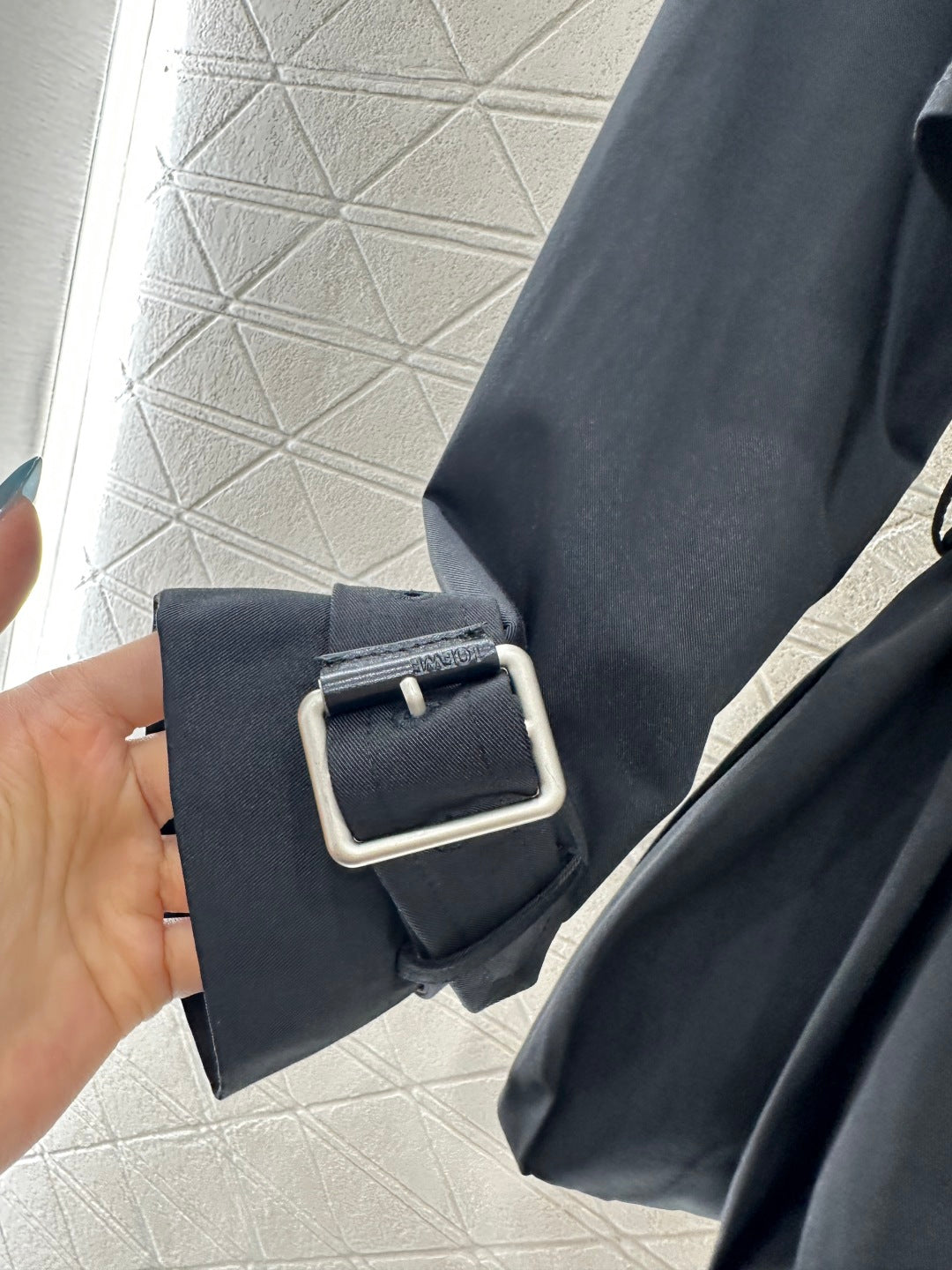 Custom YB twill cotton material with delicate luster and comfortable wear. The trench coat style continues the loose off-shoulder buckled sleeve design. A single-side cape is integrated for diverse wearing methods to create a deconstructed style. The style is unique and fashionable. The perforated fabric belt at the waist is decorated to outline the body shape. It has a full sense of design and is fashionable and relaxed for daily wear. The leather label totem on the back highlights the style. It is suitable for different styles. Customized fabrics and accessories