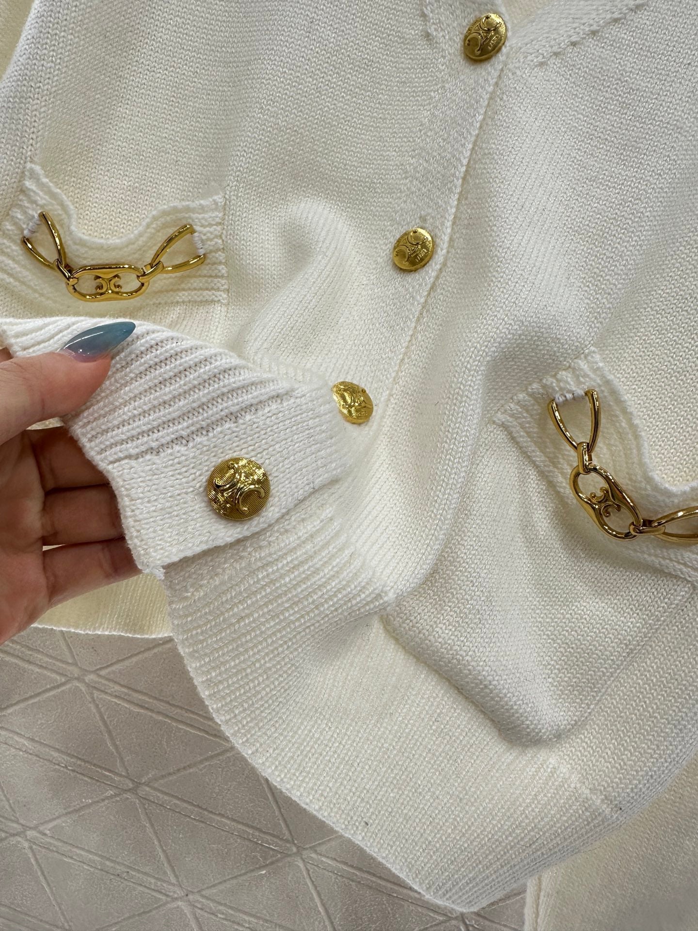 Customized YB wool yarn weaving, dense fine knitting, clear wool texture, comfortable and skin-friendly, V-neck cardigan tailoring, Arc de Triomphe three-dimensional relief printed round buckle on the front, echoing the horseshoe chain buckle embellished on the edge of the pocket, reflecting gorgeous light, showing noble and elegant, collar and cuffs with threaded edges, full of elasticity, short and draped bud shape, rich design layering, the version is inclusive of body shape, and it is fashionable and age-reducing when worn