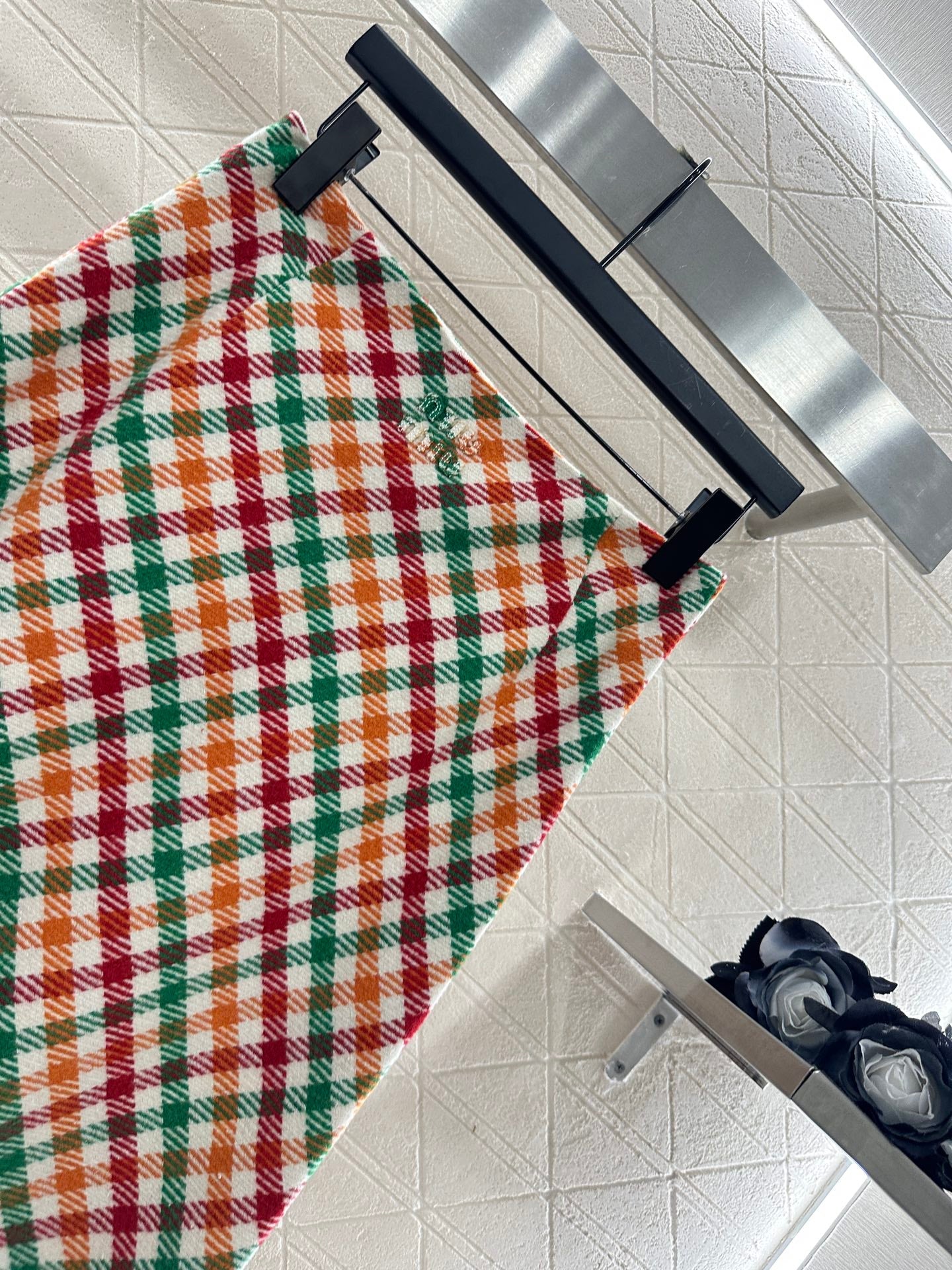 Made of woolen fabric, with white as the base color and a diagonal pattern of red, orange, white, and green interwoven in four colors, it exudes a lively and youthful retro temperament with excellent texture and full appearance. Paired with a central three-dimensional letter logo, it easily creates a model of socialite style. Straight tube micro A hanging half skirt cut, with a moderate and elegant length that doesn't look old, slim hips that look slim, the first choice for fashionable and refined dressing.