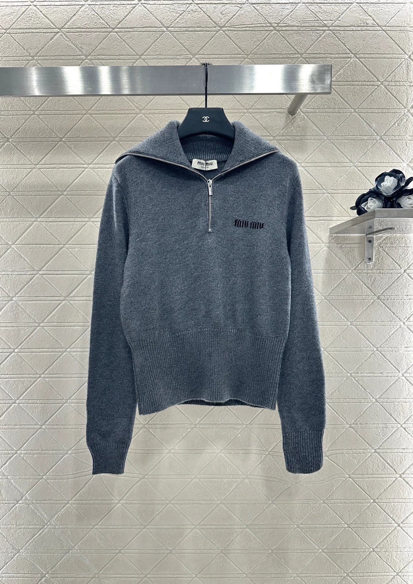 Cashmere and wool yarn weaving texture, high-end and comfortable, soft shawl wide lapel sweater version, pullover, half open zipper design with wrapped edges, threaded vertical grooves, texture highlighting gentle temperament, slim fit, fashionable wearing, chest letter logo decoration highlighting high-end tone, regular style, not picky about body shape and age