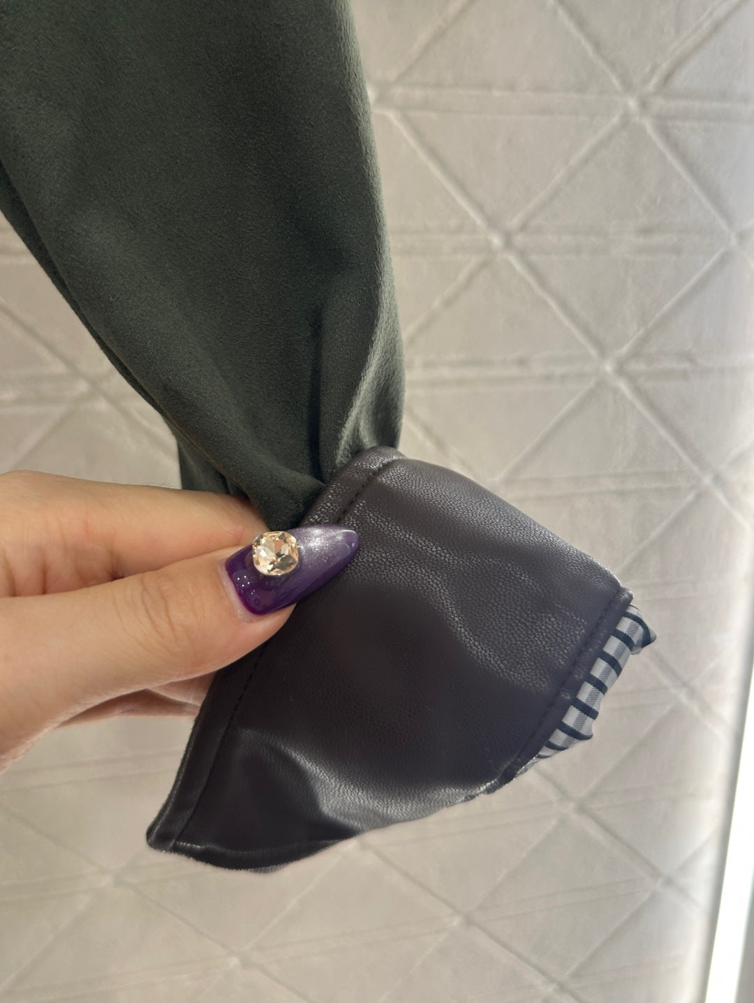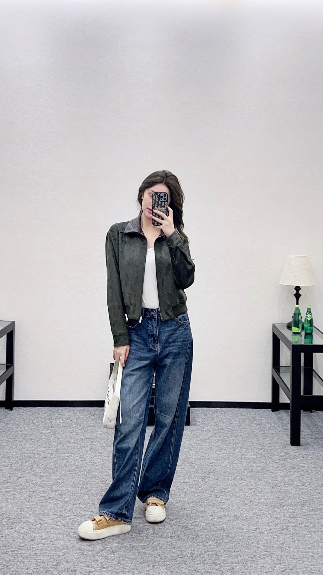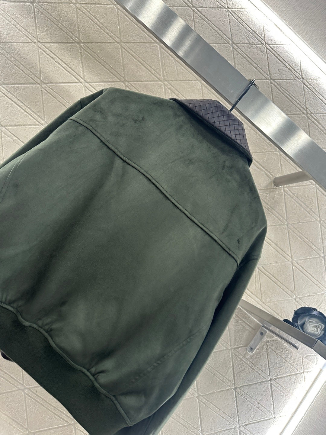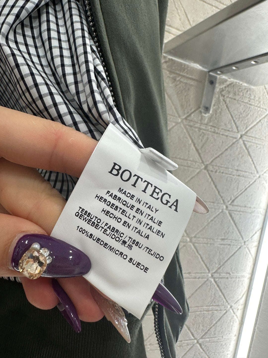 Glossy texture, crisp and stylish, with a lapel jacket silhouette and a zippered open top ➕ The lower hem has a narrowed elastic thread, and the lining is embellished with black and white checkered patterns. The ready to wear garment features a large military green body paired with the brand's iconic woven leather collar, echoing the opposite cuffs. The color and material double collision brightens the design, adding visual highlights to the regular style and creating a sweet and cool style. Paired with skirts and pants, it exudes a high street fashion style
