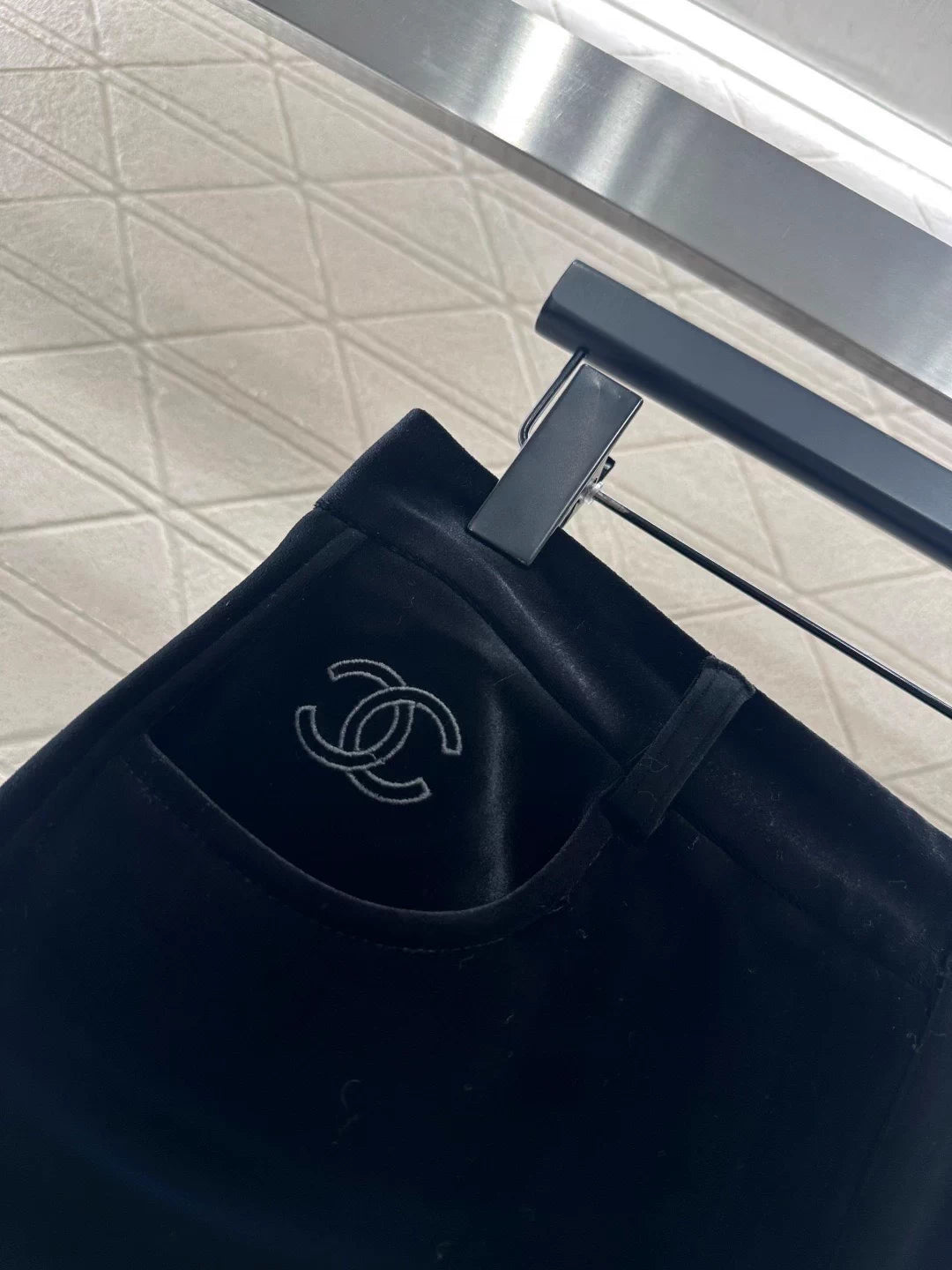 Made of velvet, with a lustrous sheen, these warm and comfortable pants feature a high-waisted design with double pockets and a slightly flared straight leg. The pockets are adorned with a double C logo, creating a simple yet sophisticated look. The straight-leg, slightly flared cut flatters the legs and elongates the silhouette, effortlessly creating a long-legged, elegant silhouette. A must-have item for autumn and winter.