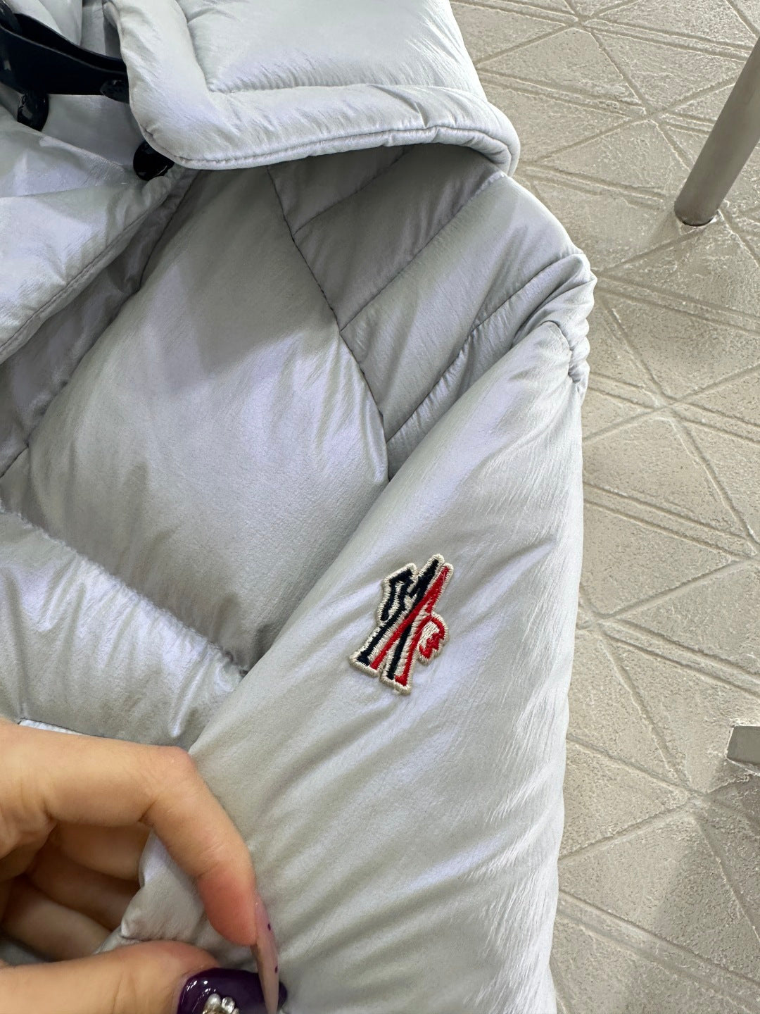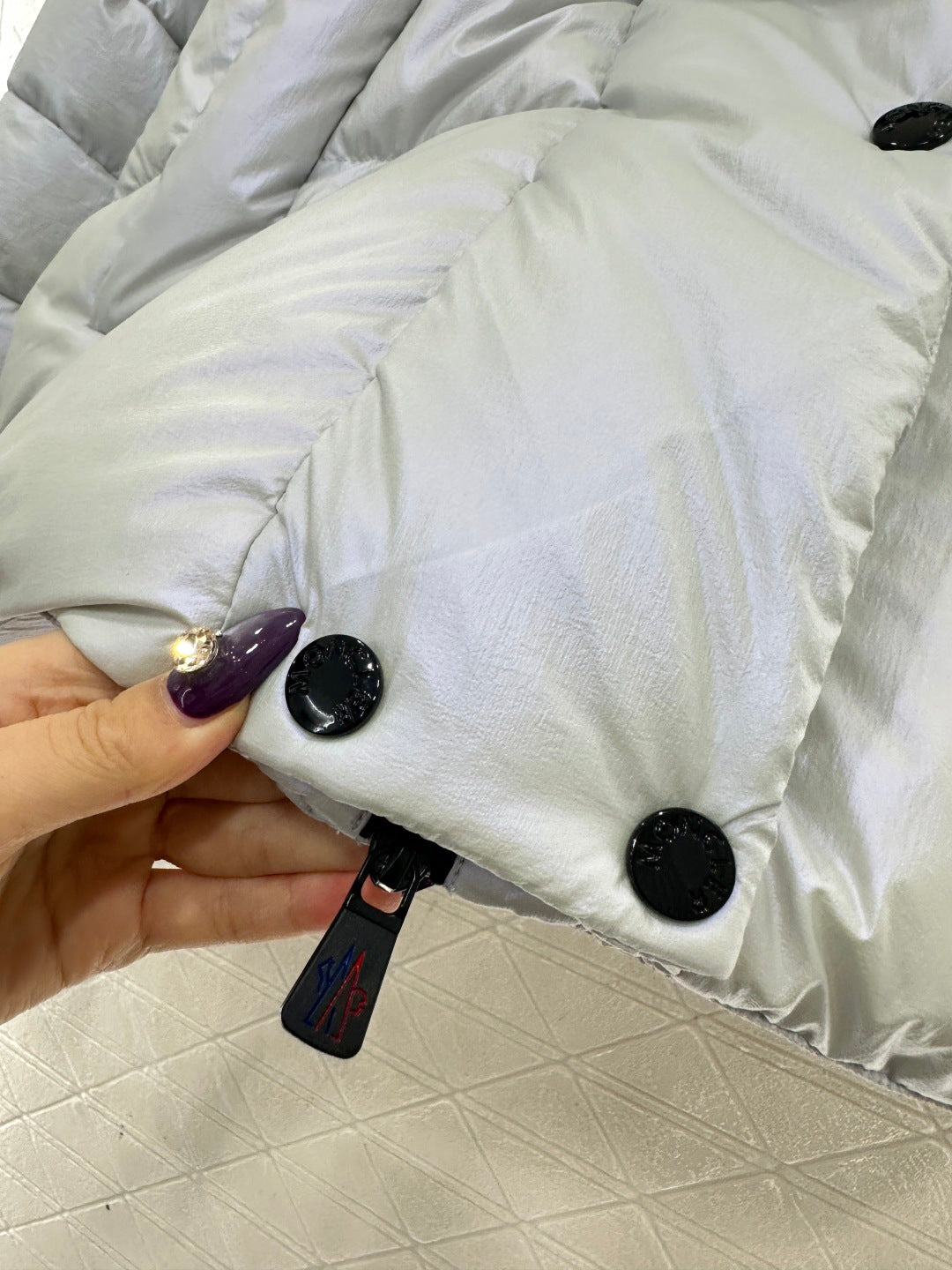 Reflective nylon material, laser glossy fabric, white goose down filling inside, the whole piece is lightweight and warm. Flip collar with inner high collar for warmth, snap button ➕ zipper ➕ Featuring a triple protection design with a built-in fixed buckle on the open placket, this jacket features a threaded elastic design with a letter logo and armband stickers, complementing the details and providing a rich texture. Layered collision, rich and varied design, highlighting low-key luxury, fashionable and warm wearing.