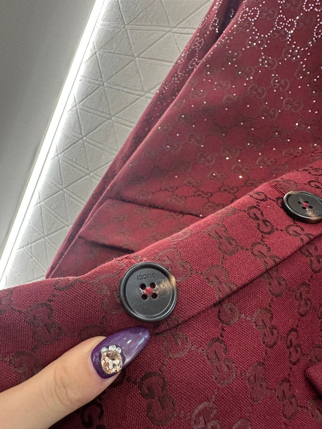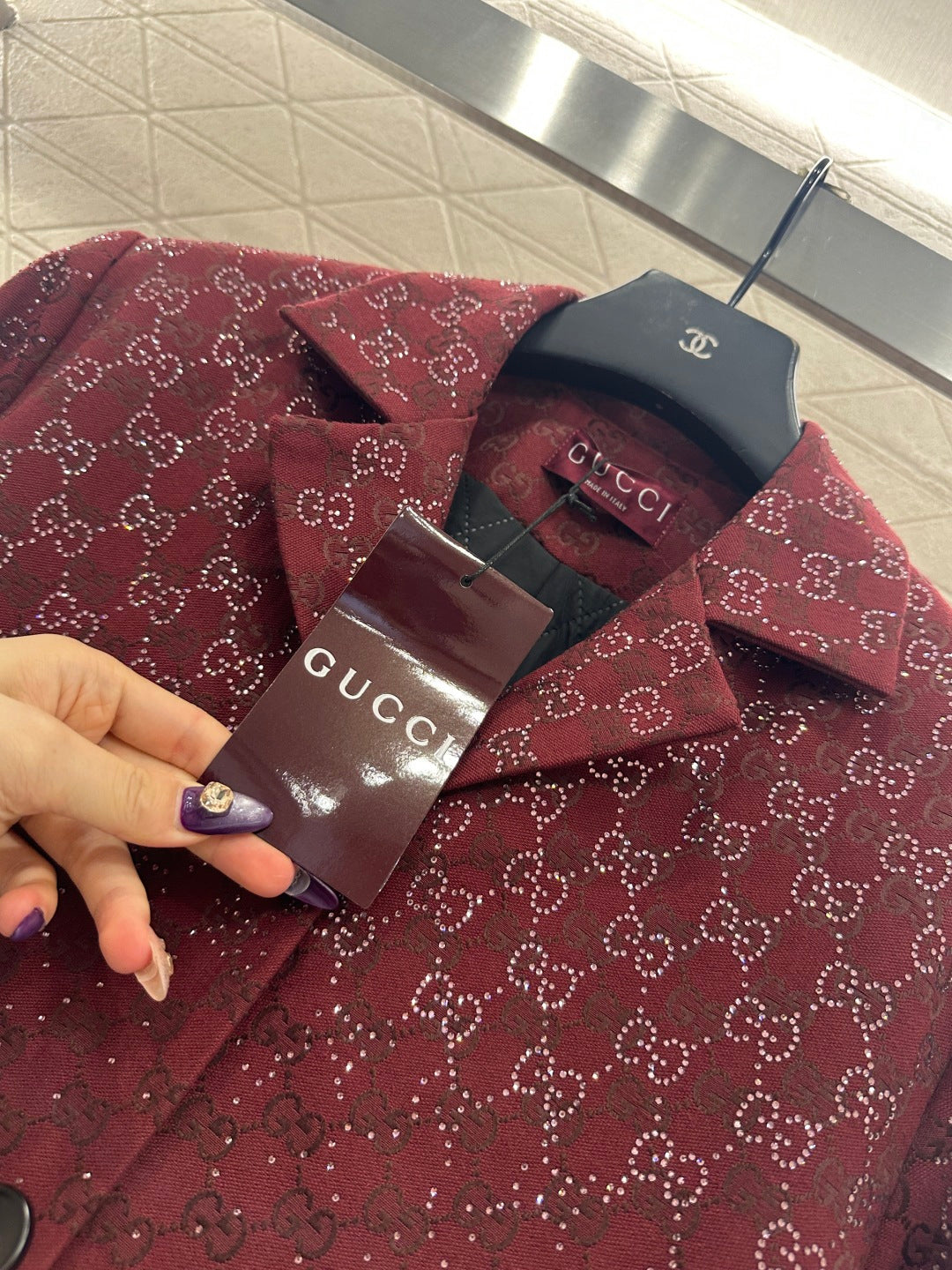 Jacquard material, premium texture, crisp and stylish, with a lapel silhouette for a suit and cotton jacket. The inner lining is embossed with diamond patterned lines and filled with down cotton, providing more practical warmth. The large body is printed with double G jacquard, and the gun lapel is paired with front buttons, creating a high-end and crisp design. Heavy duty rhinestones and double G contrasting colors are embellished from top to bottom, shining up close and gradually with a gradient luster from afar. The design is rich in layers, creating a brand exclusive sweet and cool style. Paired with the same series of straight tube hip hugging short skirts, the details echo and make it a must-have fashion item for autumn and winter