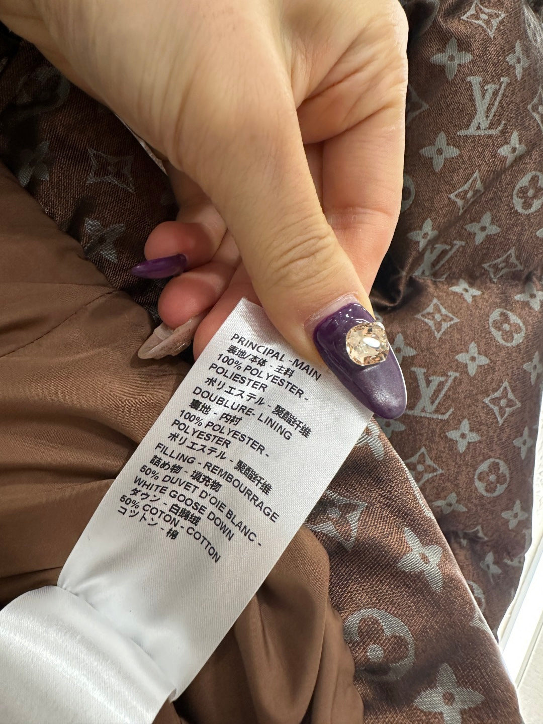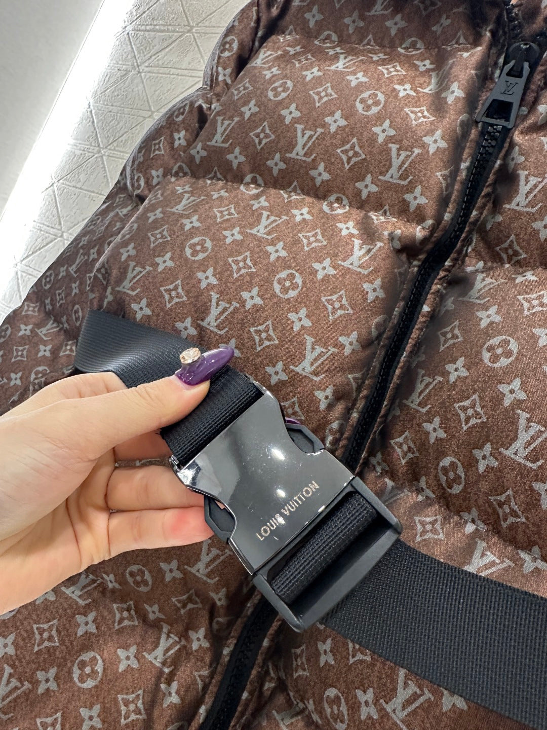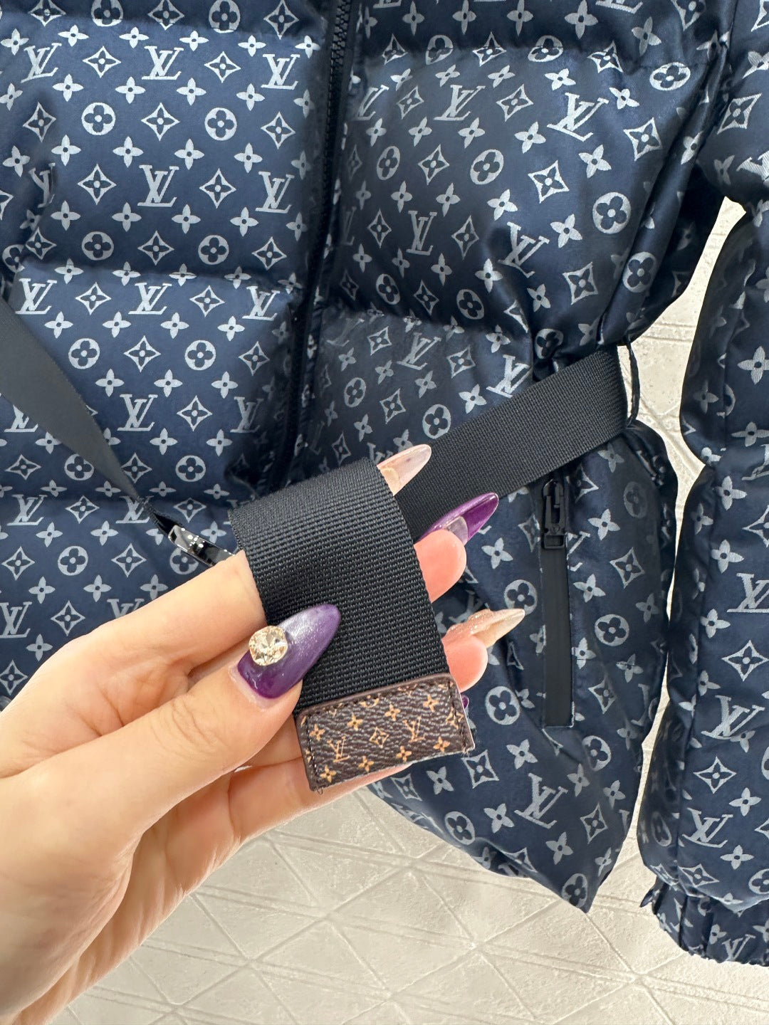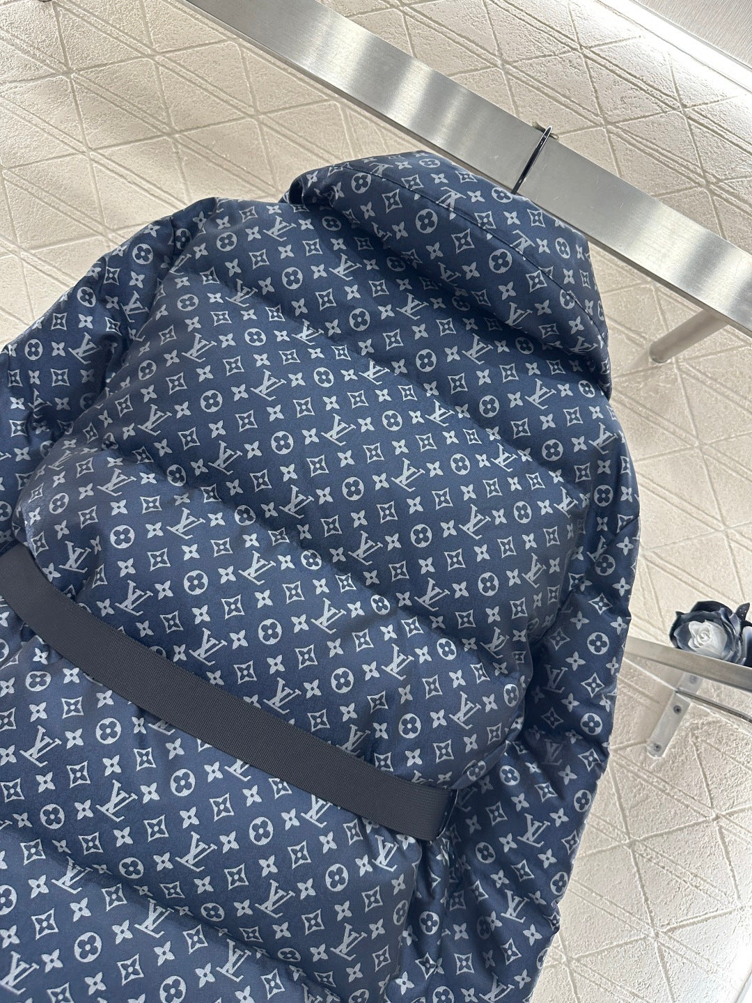 Made of jacquard material with a down-filled lining, this lightweight and warm down jacket features a lapel collar and zipper, offering warmth without bulk and greater versatility. It boasts an all-over jacquard pattern with a subtle four-leaf clover logo and lettering, along with zippered pockets, a snap-button belt, and rectangular embossed stripes that accentuate the figure.