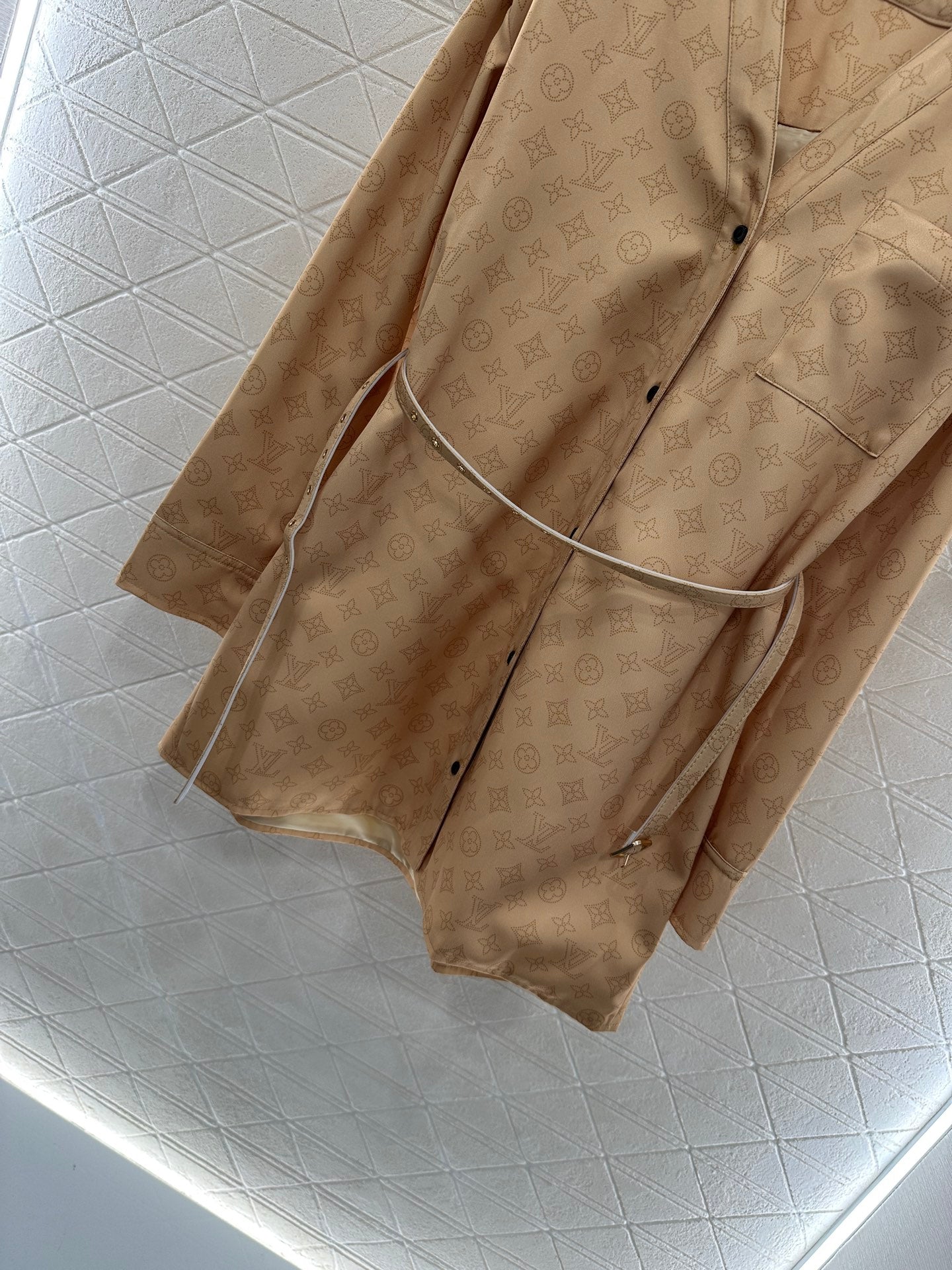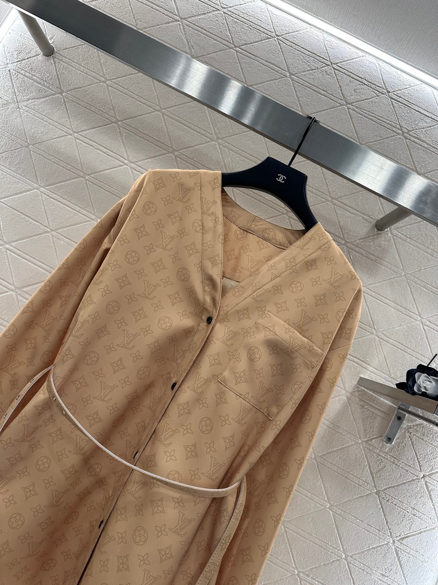 The twill thick material has a comfortable and delicate texture. The waist cinching dress has a sleek and slim fit, with a V-shaped button open collar and a straight cut waist belt for a slimming effect. The short style is agile and elegant, highlighting the waistline and hips. The whole body is covered with four leaf clover elements and letter patterns, highlighting the brand's delicacy. Combined with the chest pocket, the upper body is full of fashionable and elegant atmosphere, perfect for daily commuting and vacation.