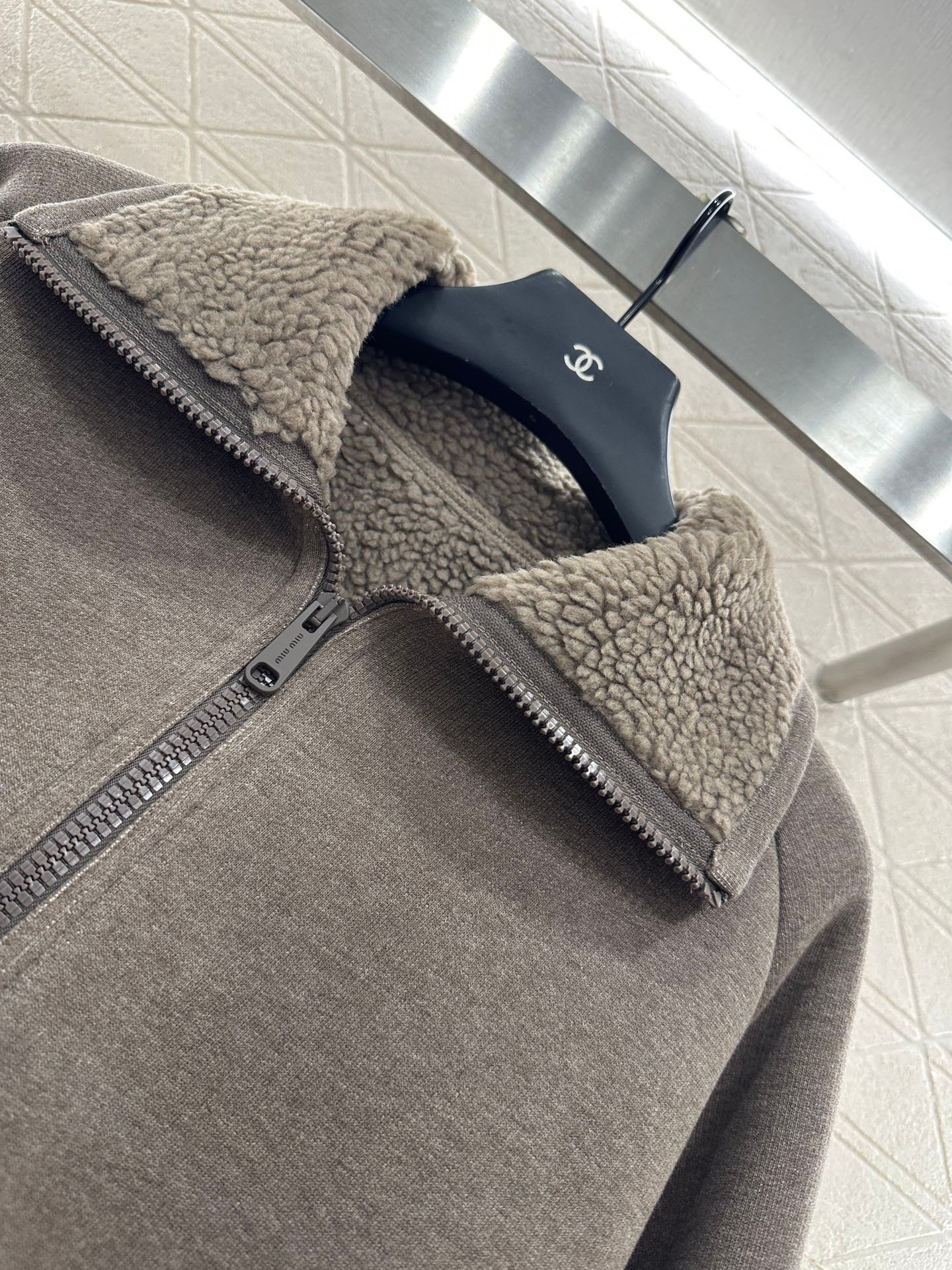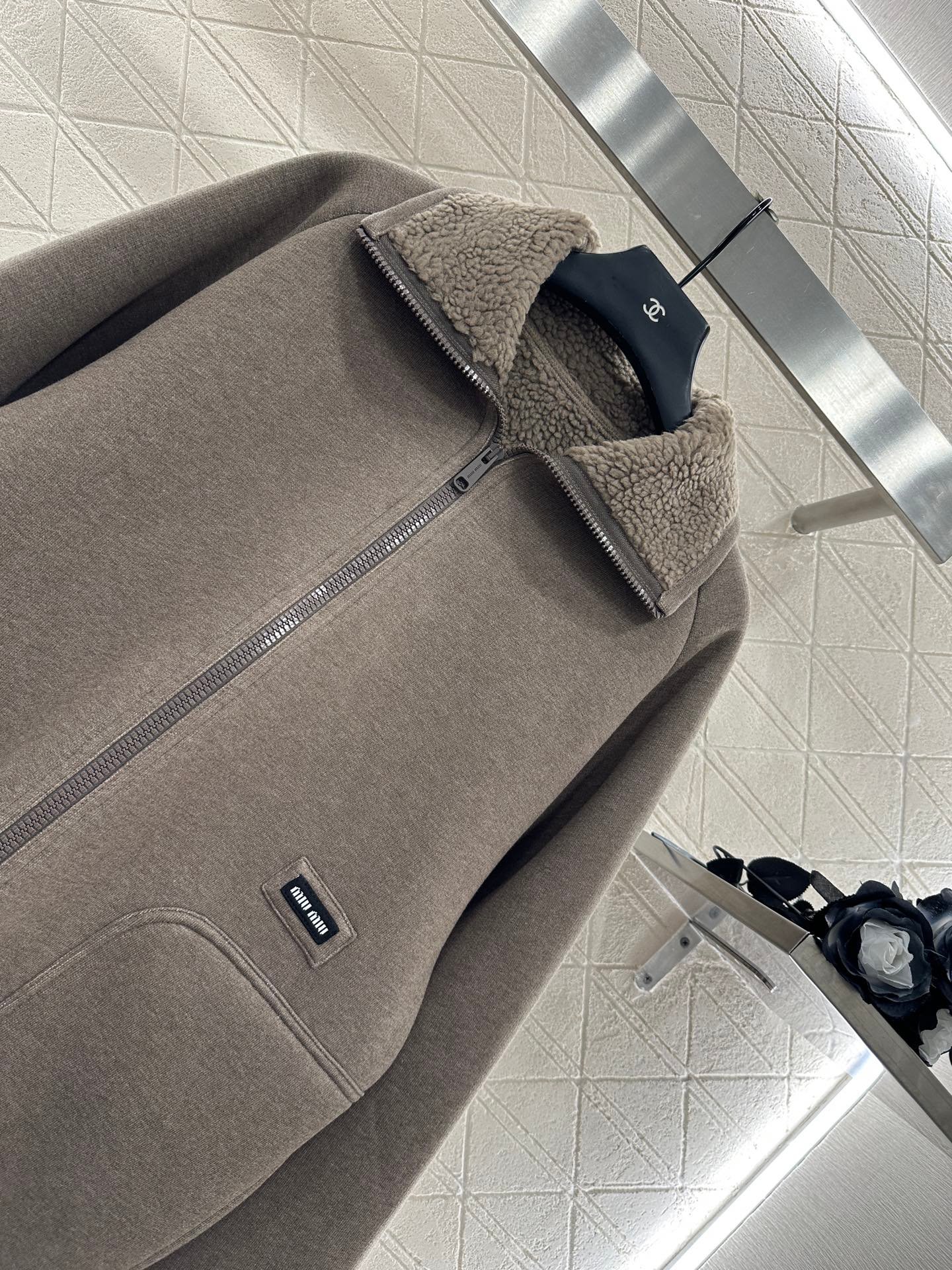 The outer layer is made of virgin wool material, and the inner layer extends to the lapel decoration with teddy plush material. The texture is soft, comfortable, fashionable, and stylish. The lapel jacket is cut with a zipper ➕ The black thread edging on the hem and cuffs, combined with the letter logo at the waist, fully showcases the brand style. The overall silhouette is upright, loose fitting, and has a furry texture