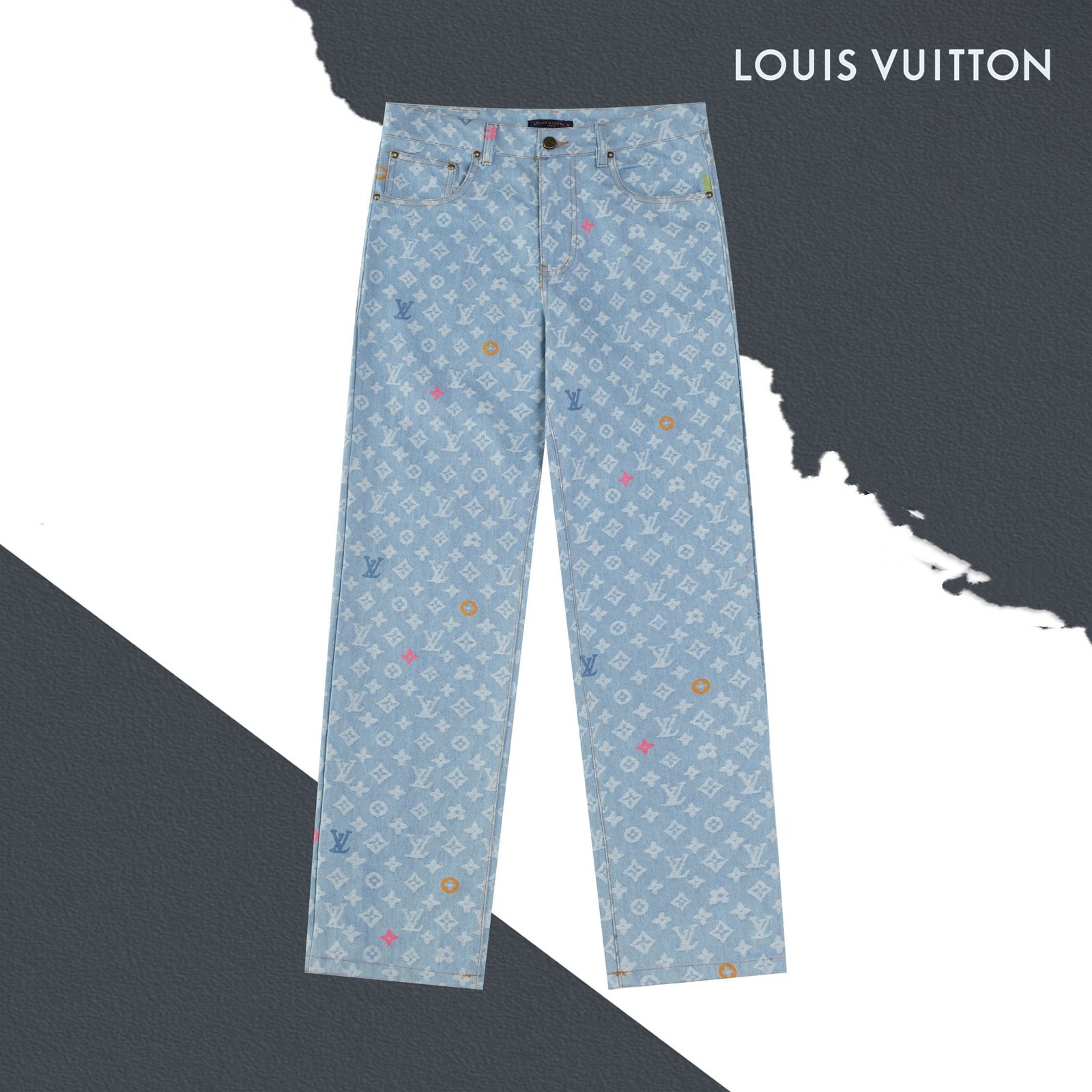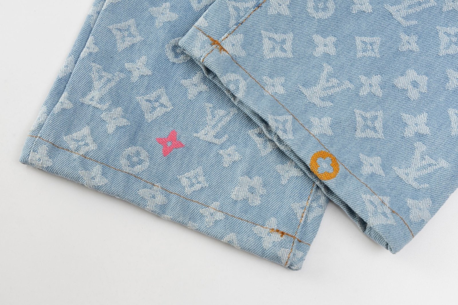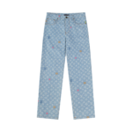 The trousers are washed in color and cut and sewn with the flower pattern. They are made of glossy mercerized embroidery thread. They are woven with high-density machinery imported from Italy. The texture is clear and the whole dyeing process is anti-wrinkle, anti-shrinkage and anti-deformation. They are made in a large factory. The double-needle stitching is neat. They are delicate and soft. The appearance is fashionable and smooth. The OS version is comfortable and stylish.
