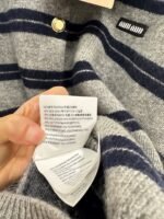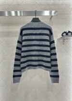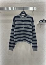 Cashmere and wool yarn weaving texture, advanced elasticity, comfortable round neck knitted cardigan cutting, beautifying the head and shoulder ratio, making the collar more slimming. The iconic letter logo in front of the collar is all black and gray striped lines interwoven, presenting a retro college style, regular loose fit, fashionable, slimming, easy to control for daily travel or gatherings