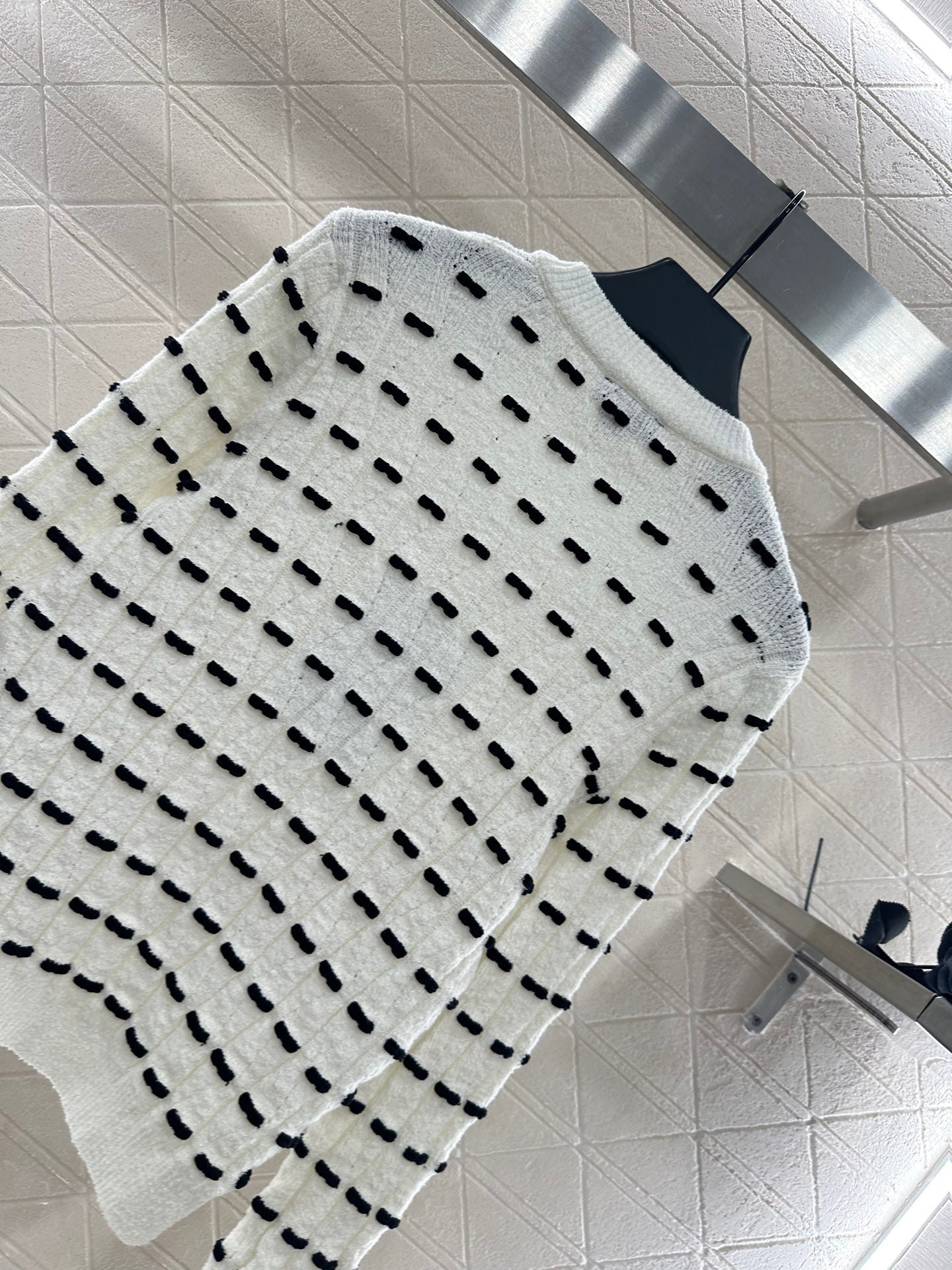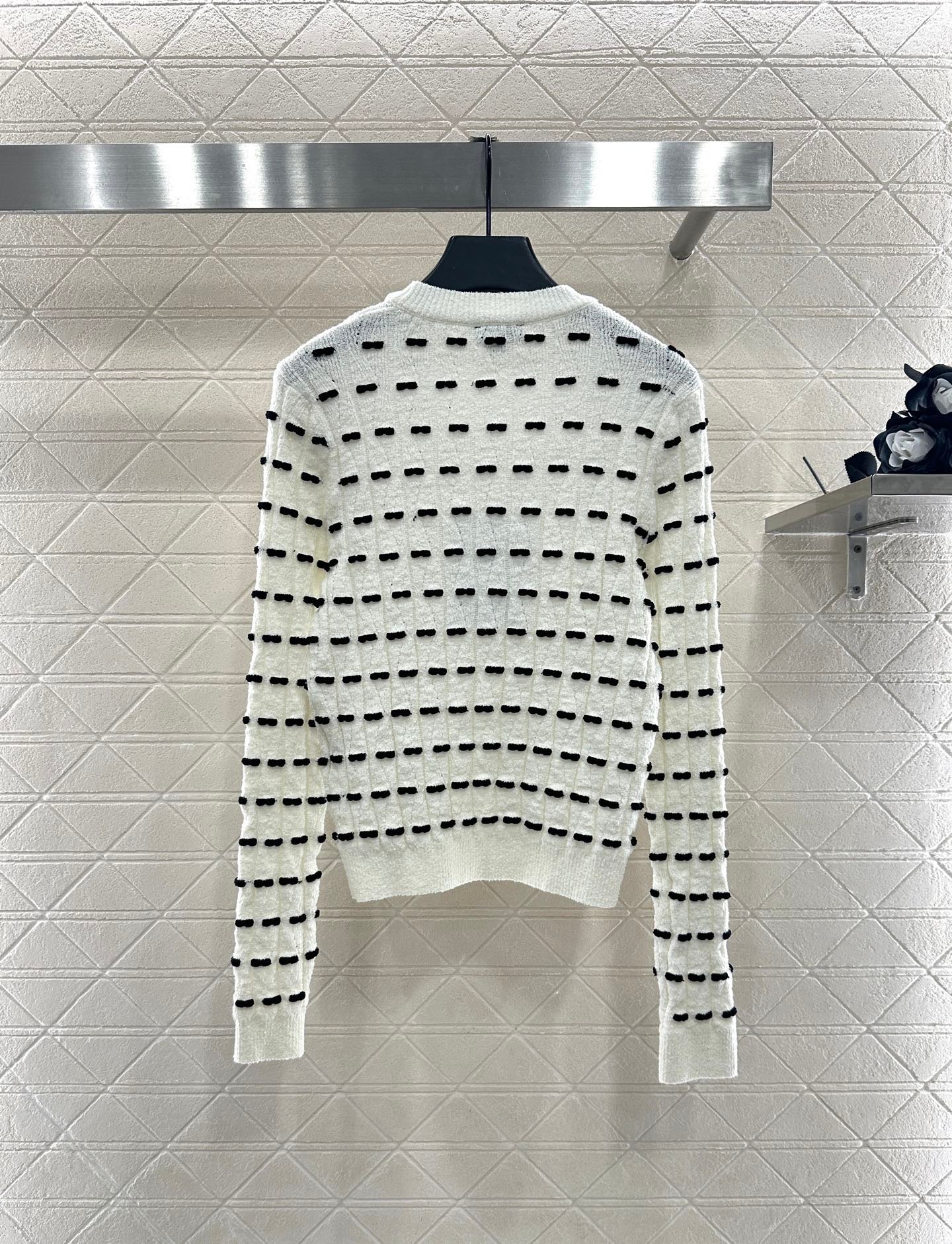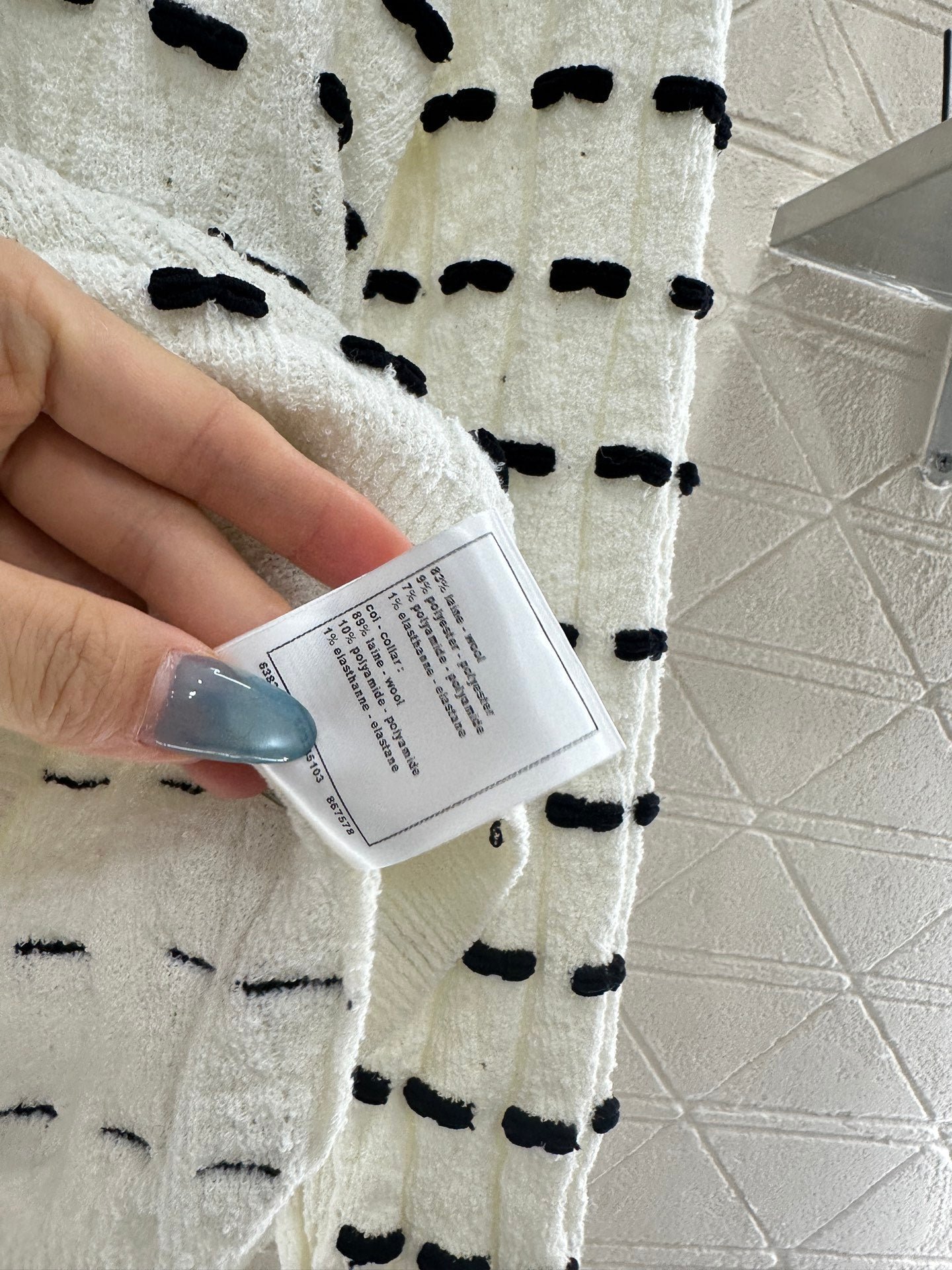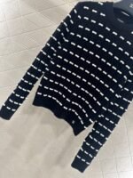 Woolen yarn weaving, with a premium and comfortable texture. The pullover knitted sweater is cut with contrasting black and white threads horizontally interwoven throughout, creating a visual effect of butterfly knots. The hem is decorated with rhinestone letters and double C patterns, creating a collision of luxury and highlighting the brand’s personality. It highlights the high-end sense of dressing, allowing simple styles to be worn with exquisite personality, showing a relaxed and fashionable temperament. It can be worn alone or in layers, and is the first choice for autumn and winter fashion.