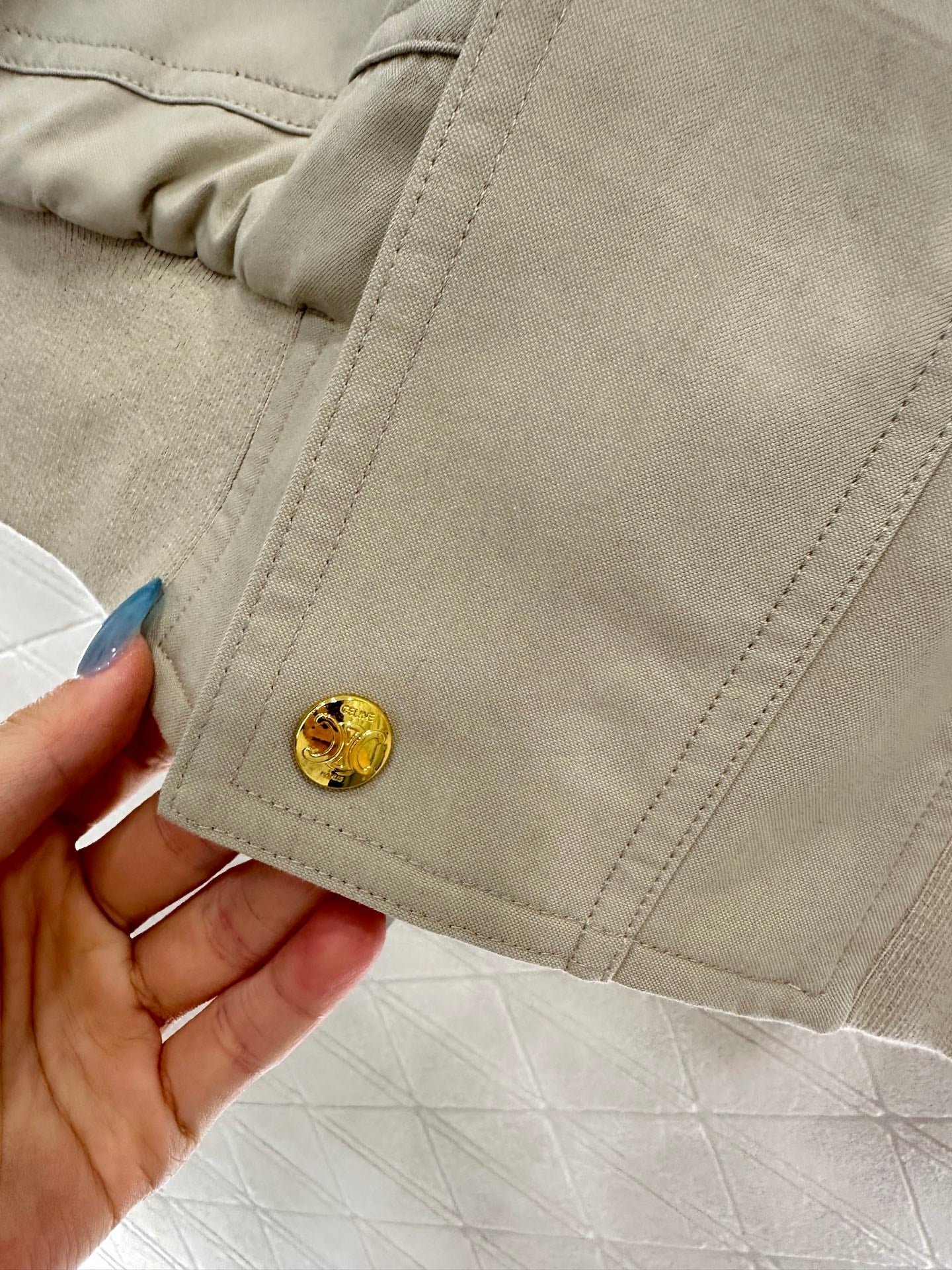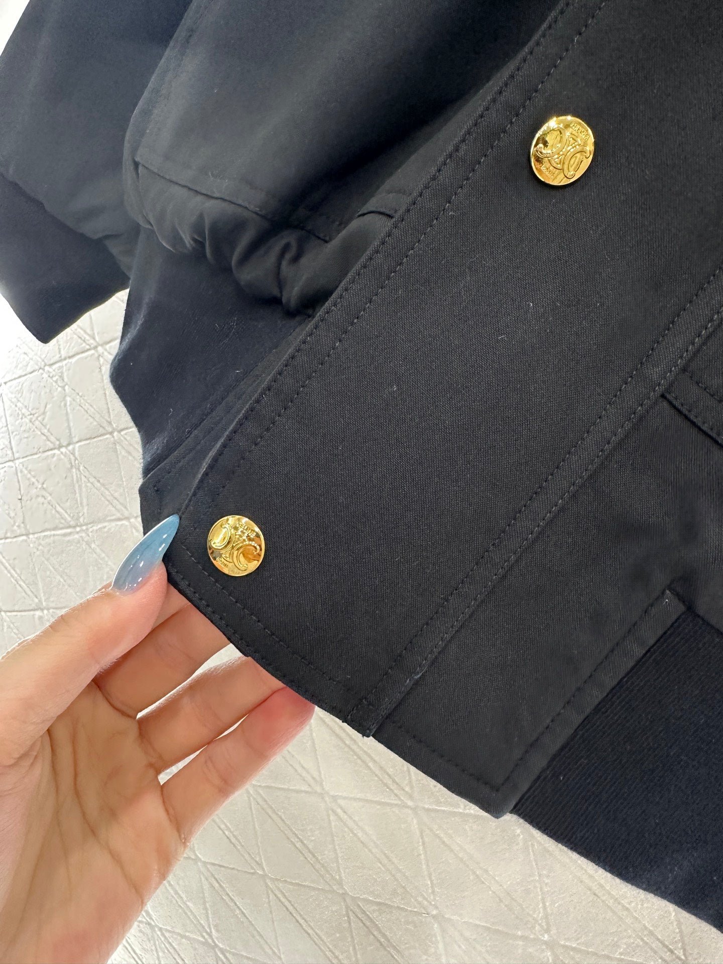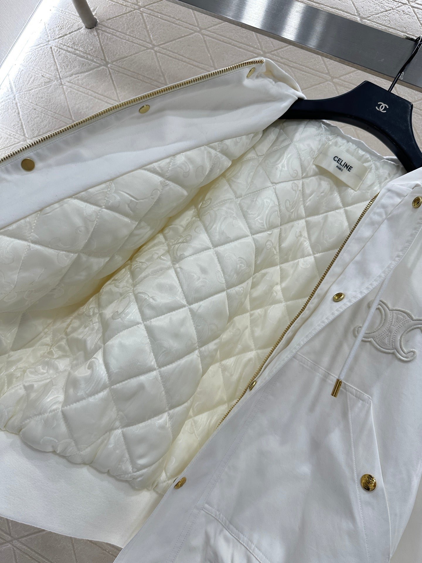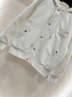 The twill cotton material has a glossy texture and a full appearance. The cutting is smooth and flowing, and the zipper hooded jacket has a diamond grid cotton treatment inside. The elastic thread at the hem increases the warmth of the outfit. The Triumphal Arch logo decoration on the chest lights up the details, and the loose silhouette is inclusive and fashionable. It is the first choice for autumn and winter outerwear