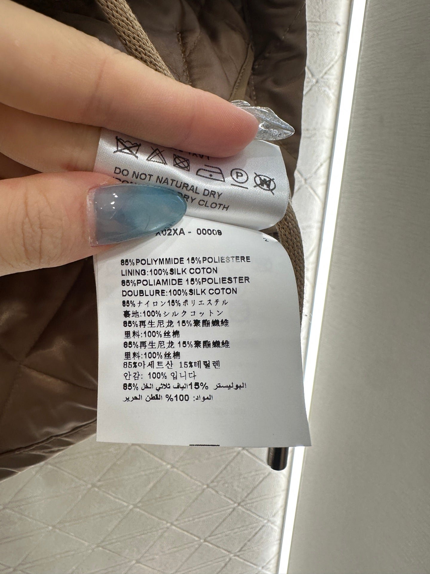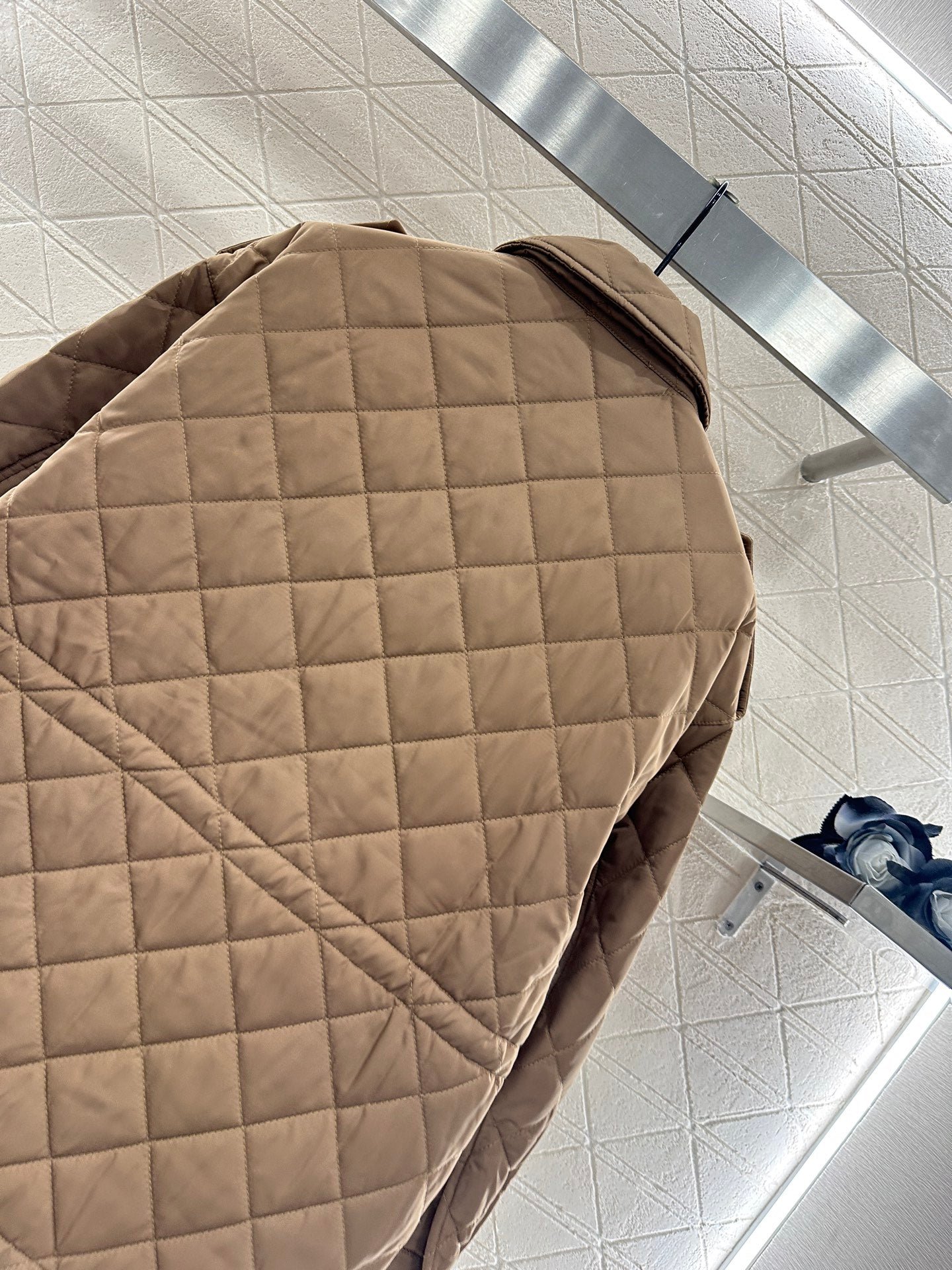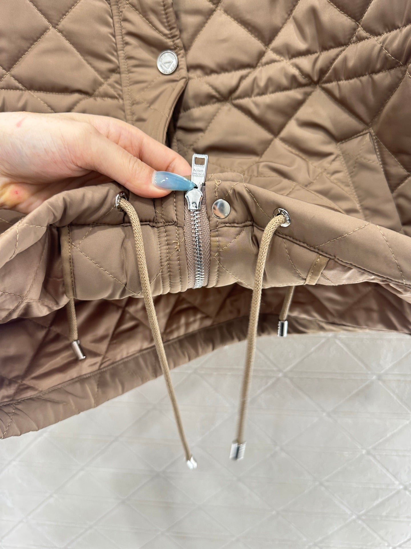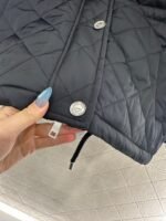 Windproof and waterproof nylon material, its craftsmanship is restored, the material is upgraded, and the function of keeping warm in autumn and winter is enhanced. The down cotton filling inside makes the whole piece lightweight and warm. The zipper opening design and shoulder cuff buckle edge contour treatment. The whole body adopts diamond grid embossed pattern, with slanted pockets to warm hands and increase capacity. The design is rich and practical, and the elastic drawstring at the waist of the hem can be adjusted to outline curves for a more fitting and inclusive fit, with full details. The standard triangle logo on the chest highlights a low-key and high-end feel, successfully demonstrating quality and breaking free from dullness, integrating warmth and fashion.
