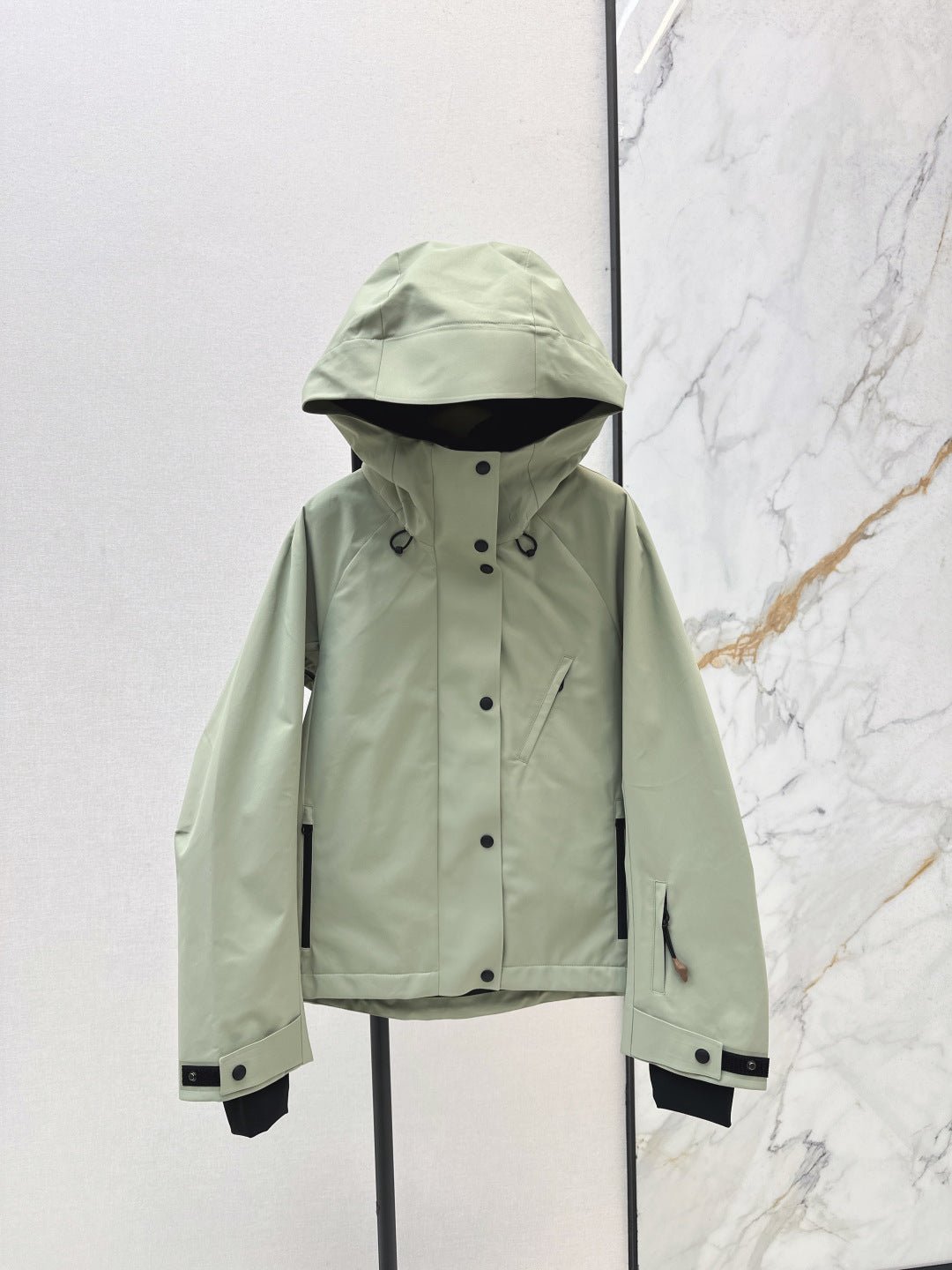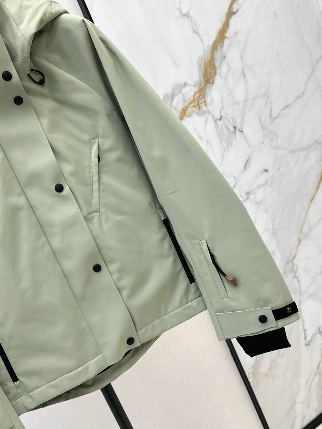 Wind resistant, waterproof, and adhesive technology. The front center features a double headed zipper opening and closing, carefully selected lightweight mesh fabric. The interior details showcase extraordinary quality. The detachable collar is equipped with multiple pockets, hat pockets, and a collar hem that can be adjusted freely. The drawstring knit cuffs are Velcro adjustable, and the cuffs and buttons are zippered under the armpits. The ventilated mesh rubber texture with a snap fastener brings a sense of luxury