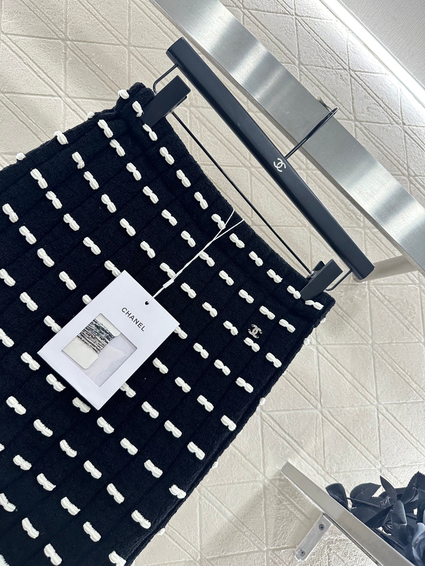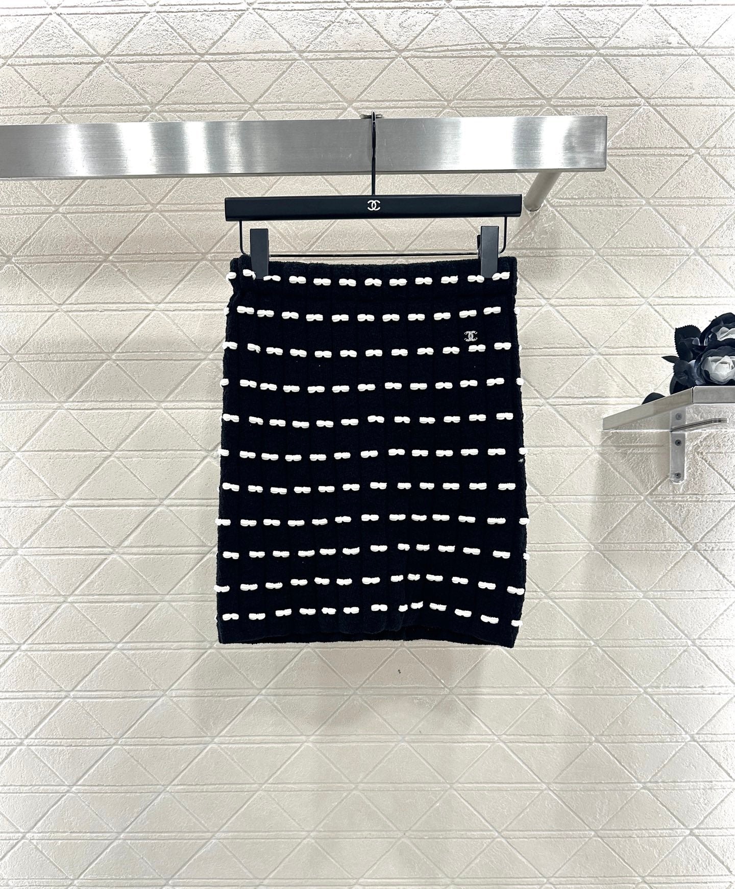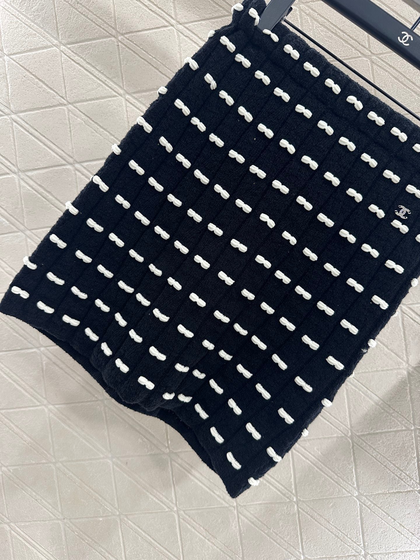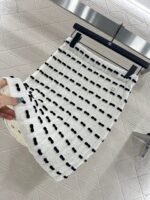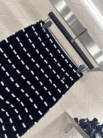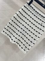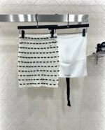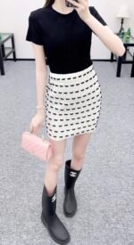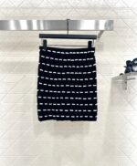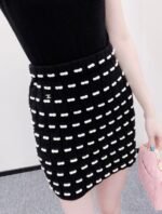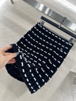 Custom YB wool yarn weaving, high-quality texture and comfortable, high-waist elastic straight skirt cut, straight slim version, horizontal interlaced contrasting black and white woven lines throughout the body, visually creating a bow dotted staggered effect, decorated with rhinestone letter double C pattern on the waist, gorgeous and shining to form a collision, highlighting the brand personality, highlighting the high-end sense of wear, making simple styles wear individuality and exquisiteness, wear to show a relaxed tone, light luxury and fashionable temperament, the first choice for autumn and winter fashion wear. Customized surface materials and accessories are equipped with exquisite lace dust bag