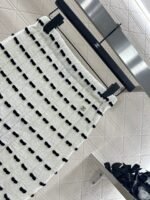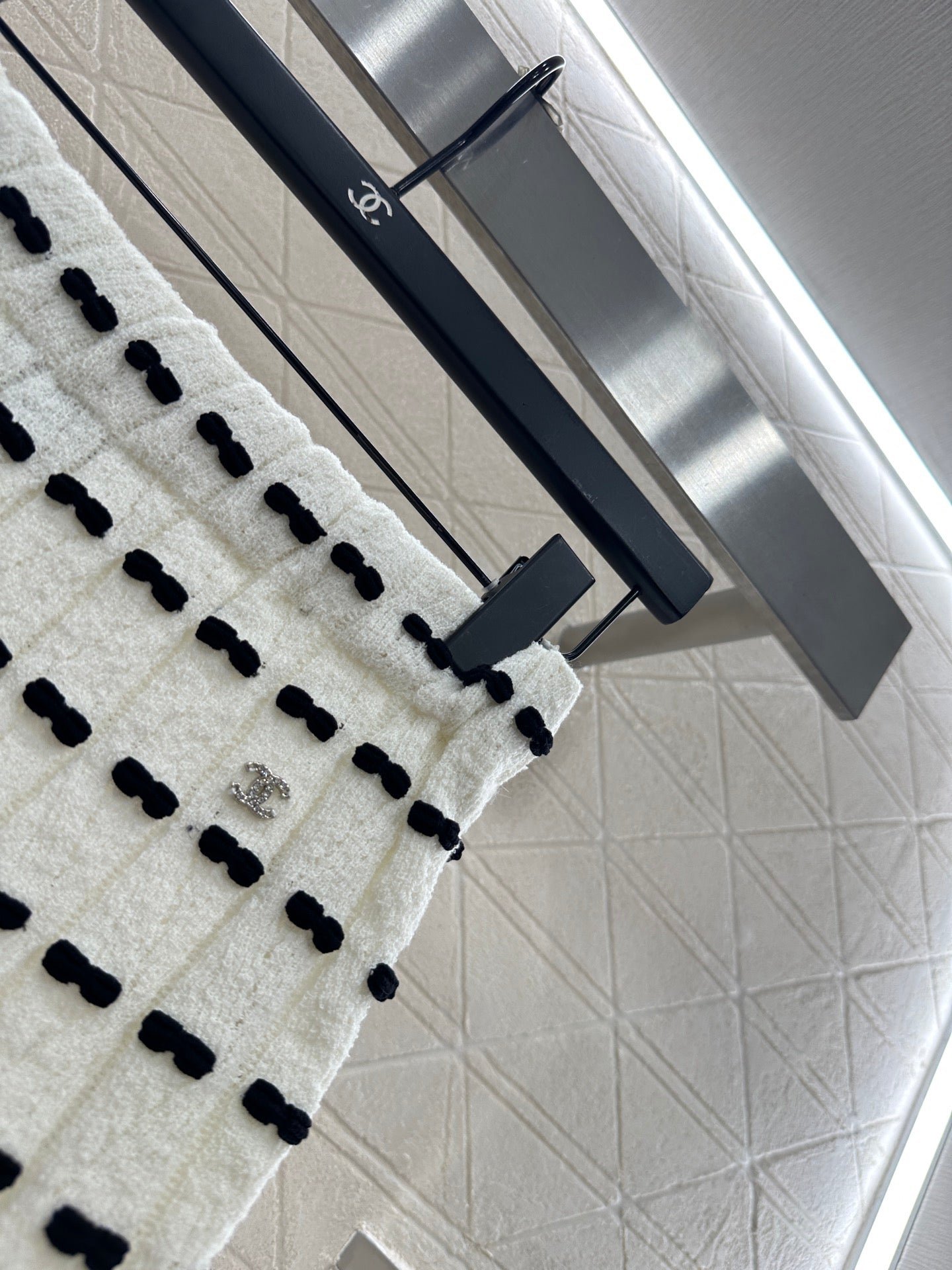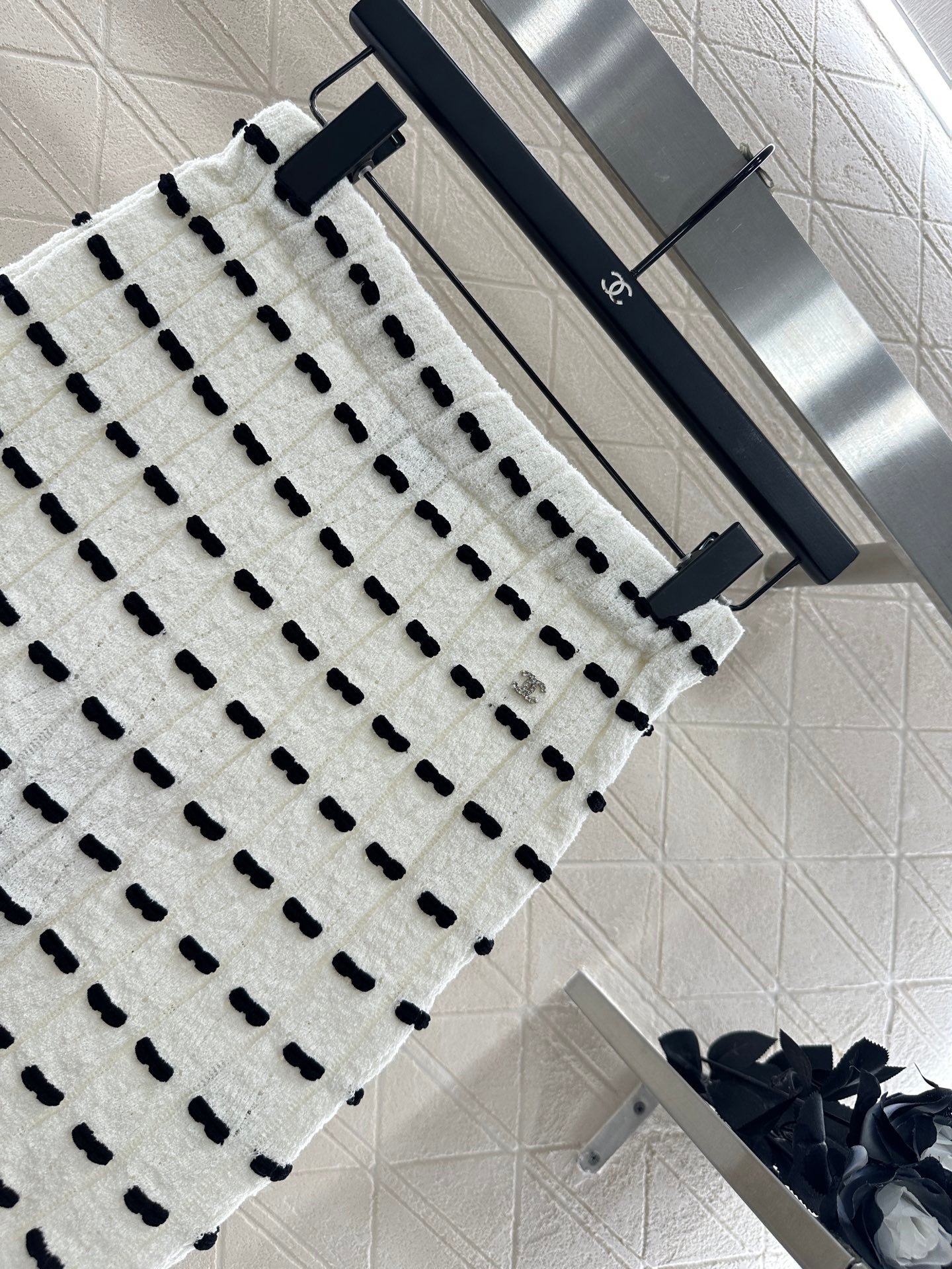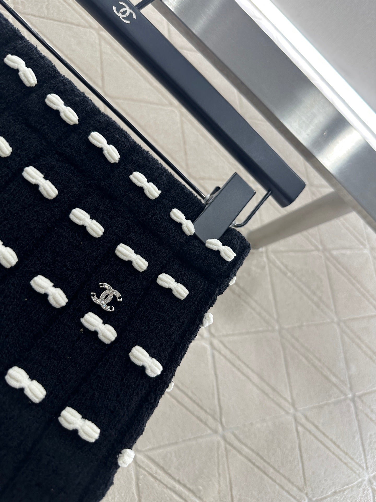Custom YB wool yarn weaving, high-quality texture and comfortable, high-waist elastic straight skirt cut, straight slim version, horizontal interlaced contrasting black and white woven lines throughout the body, visually creating a bow dotted staggered effect, decorated with rhinestone letter double C pattern on the waist, gorgeous and shining to form a collision, highlighting the brand personality, highlighting the high-end sense of wear, making simple styles wear individuality and exquisiteness, wear to show a relaxed tone, light luxury and fashionable temperament, the first choice for autumn and winter fashion wear. Customized surface materials and accessories are equipped with exquisite lace dust bag