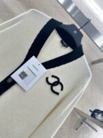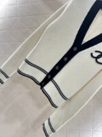 Custom YB cashmere yarn is woven for a lustrous, soft, and skin-friendly texture. This cardigan features a regular V-neck. The textured ribs create a slimming yet stylish look. The neckline extends to the front for contrasting accents. Elastic ribbed hems on the cuffs and hem provide a more comfortable fit. The double C logo embellishes the chest, showcasing the brand’s playful, youthful aesthetic. The classic black, white, and gray color scheme creates a gentle and elegant look, perfect for everyday wear.