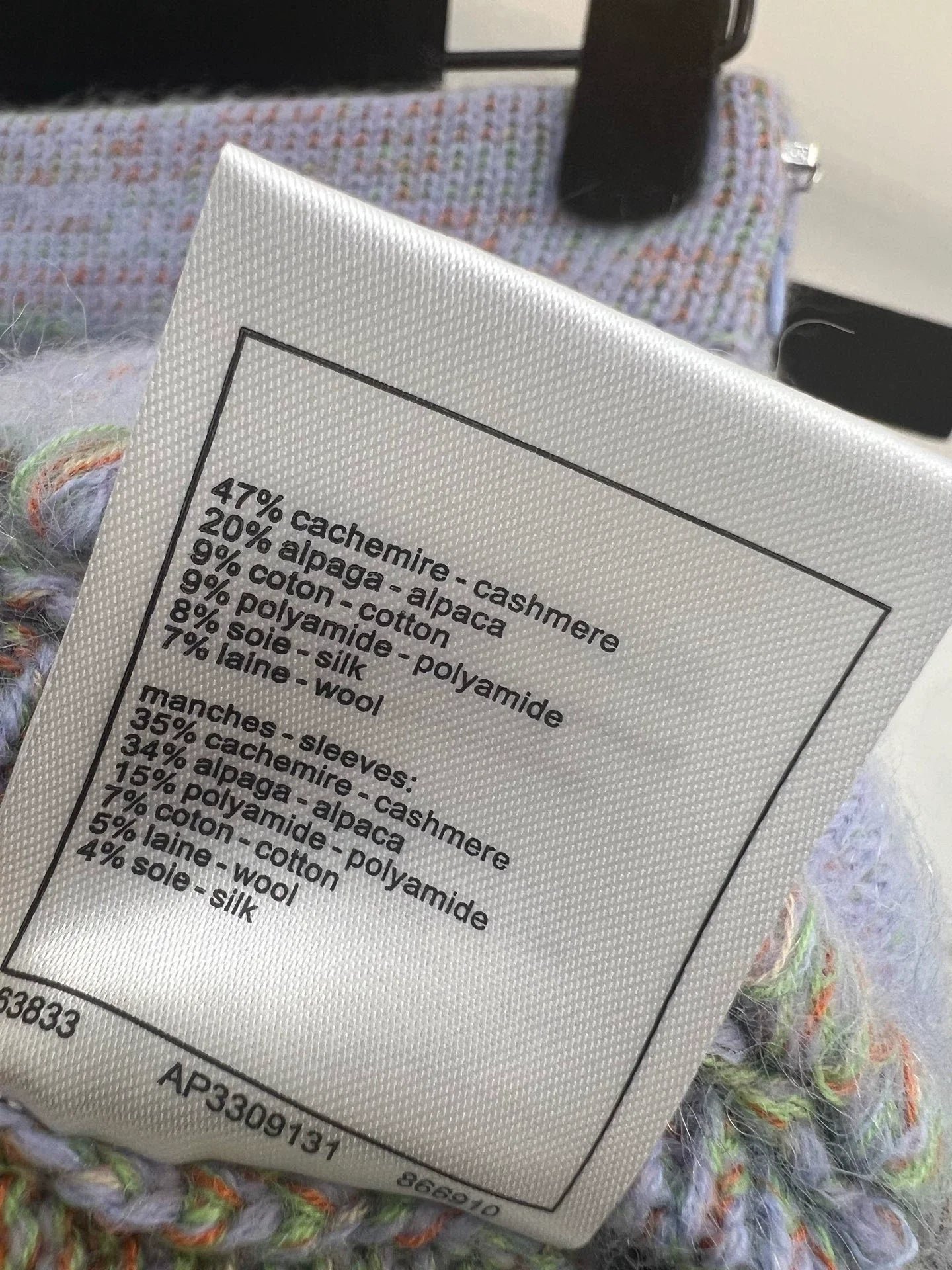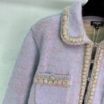 The fabric is made of 47% cashmere, 20% alpaca wool, 9% cotton, 9% nylon, 8% silk, and 7% wool, with a soft and comfortable touch. Exquisite woven lace decoration and rhinestone double C-buckle design, showcasing elegance. Suitable for wearing in spring and autumn seasons, long sleeved design