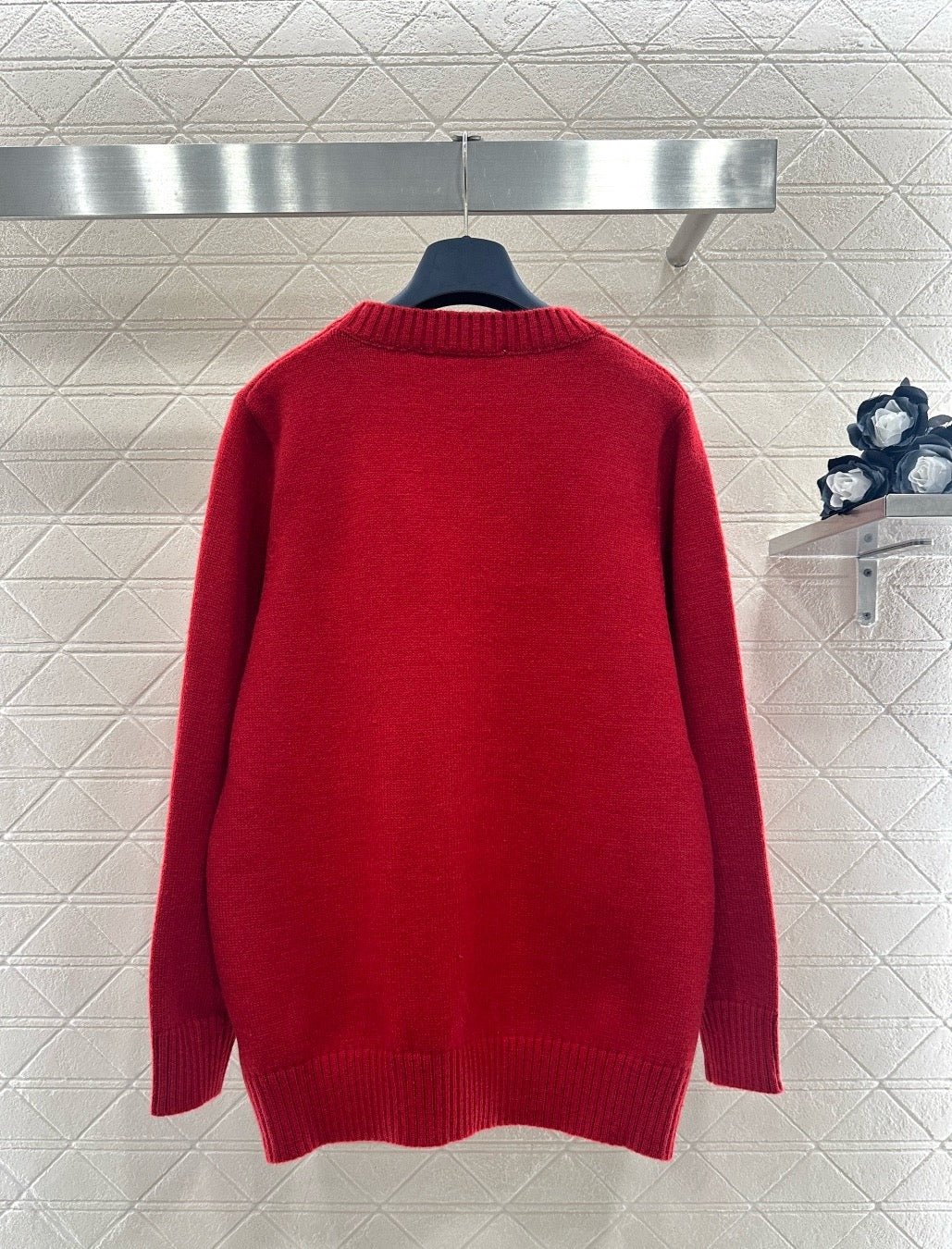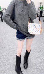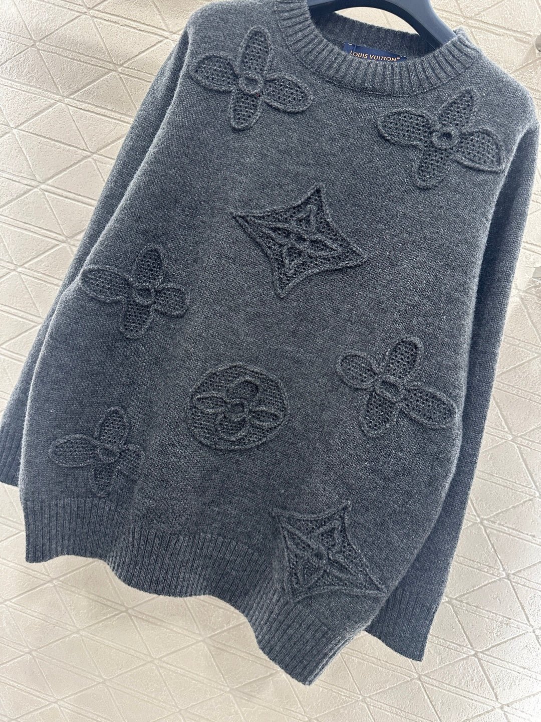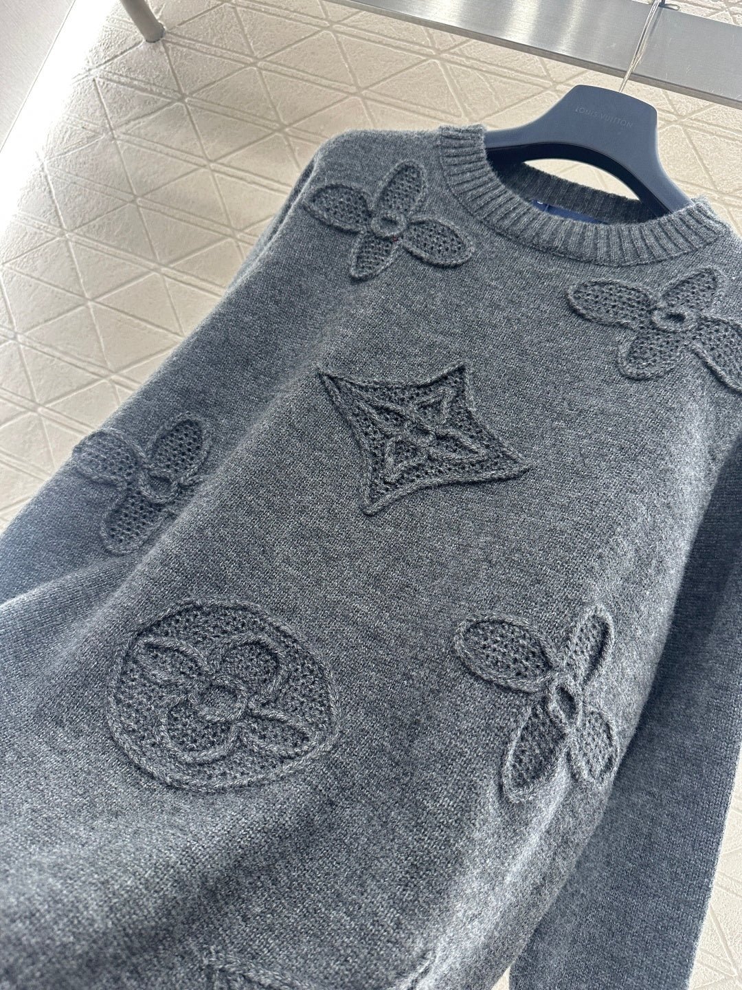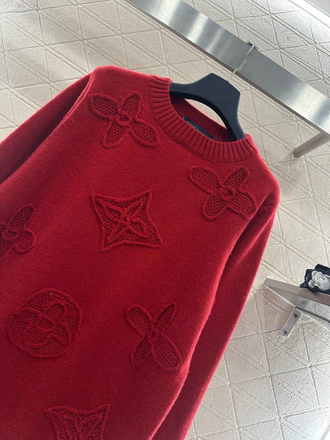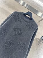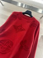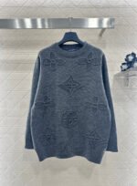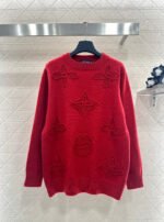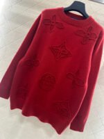 Crafted from wool yarn, this sweater offers exceptional comfort and a luxurious feel. The round neck pullover design features an oversized silhouette for a relaxed look. The entire garment is finished with vertical ribbed trim, while the main body is adorned with a logo and a four-leaf clover crocheted pattern, creating a textured, three-dimensional effect. The meticulous craftsmanship and attention to detail exude sophistication and brand prestige. It looks great worn alone or layered, offering a sophisticated yet retro-chic style.