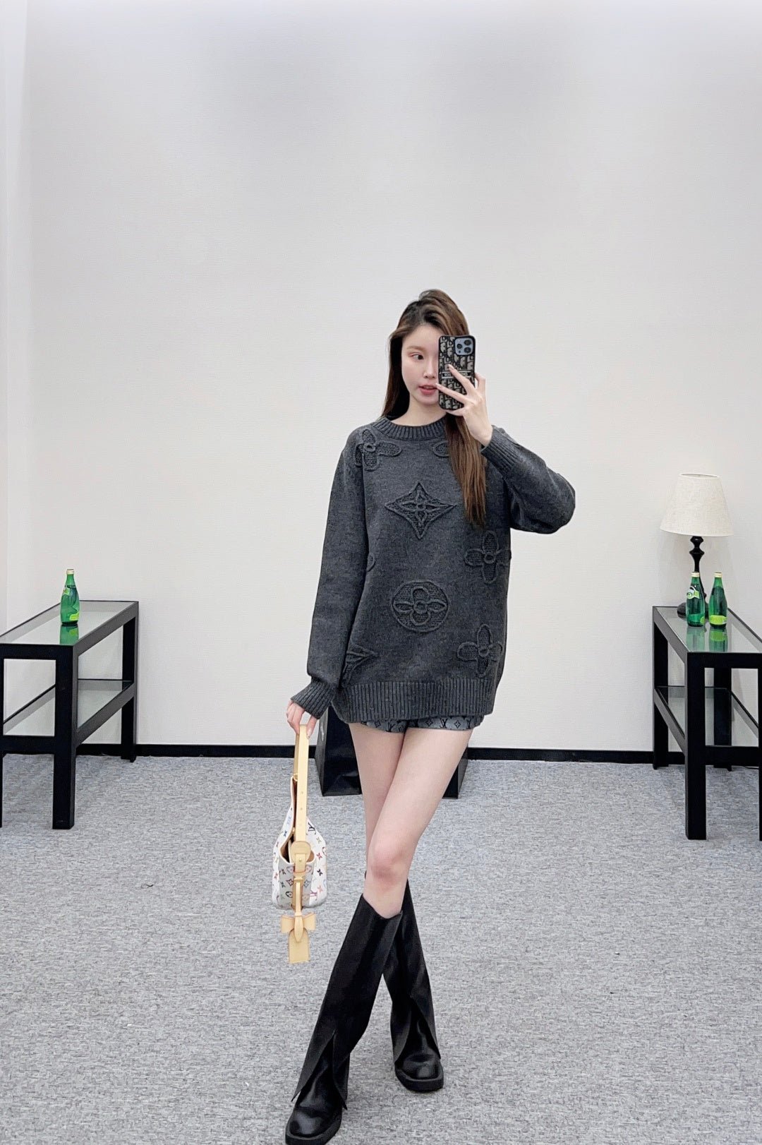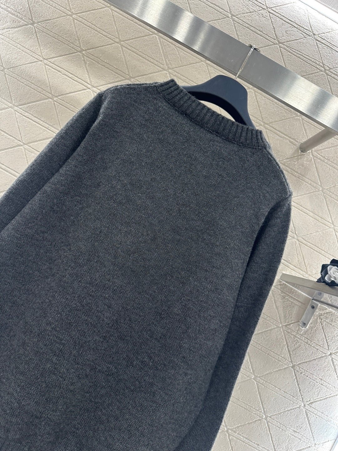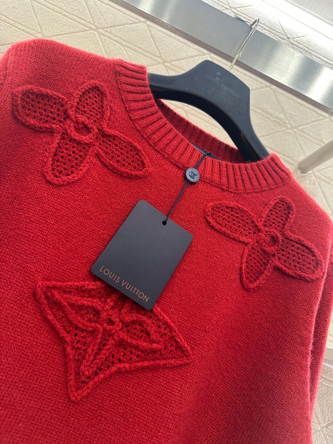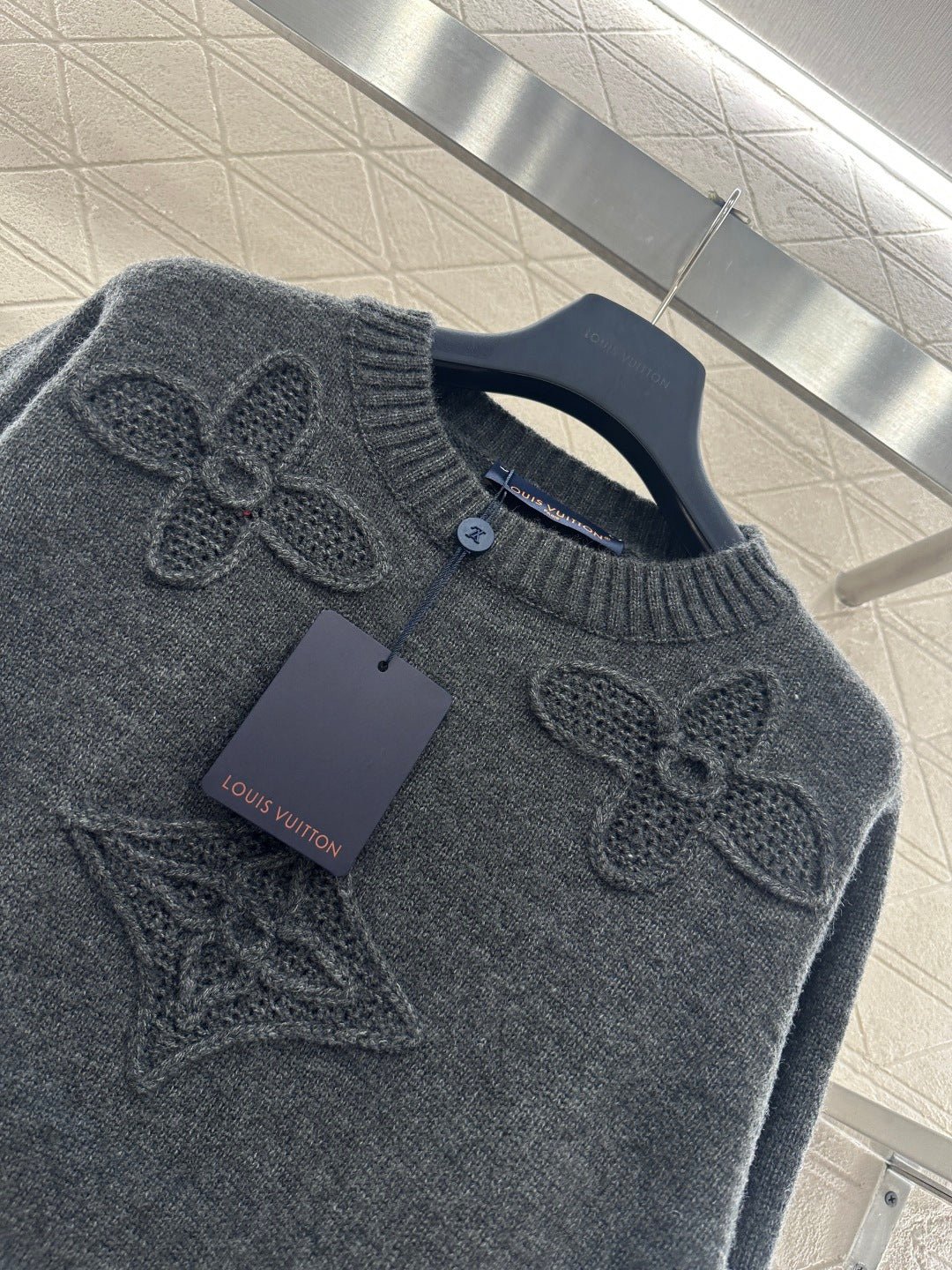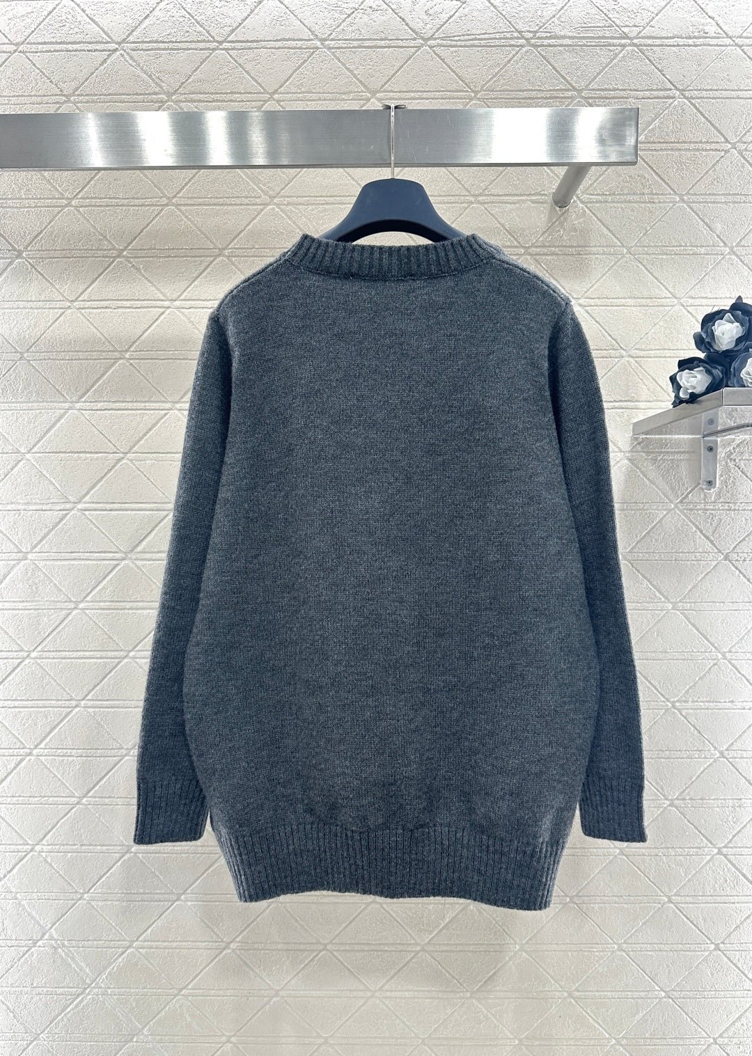 Crafted from wool yarn, this sweater offers exceptional comfort and a luxurious feel. The round neck pullover design features an oversized silhouette for a relaxed look. The entire garment is finished with vertical ribbed trim, while the main body is adorned with a logo and a four-leaf clover crocheted pattern, creating a textured, three-dimensional effect. The meticulous craftsmanship and attention to detail exude sophistication and brand prestige. It looks great worn alone or layered, offering a sophisticated yet retro-chic style.