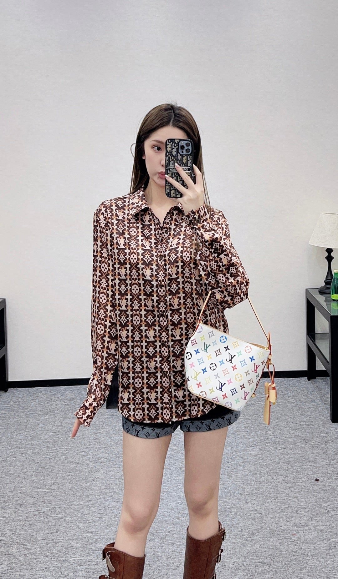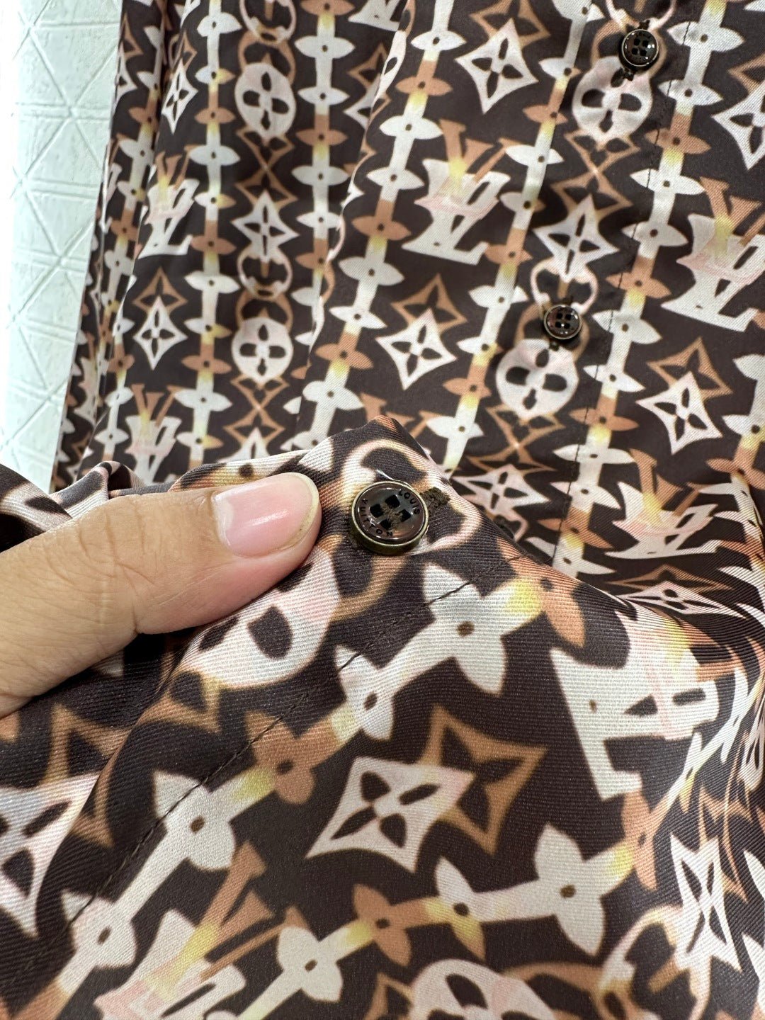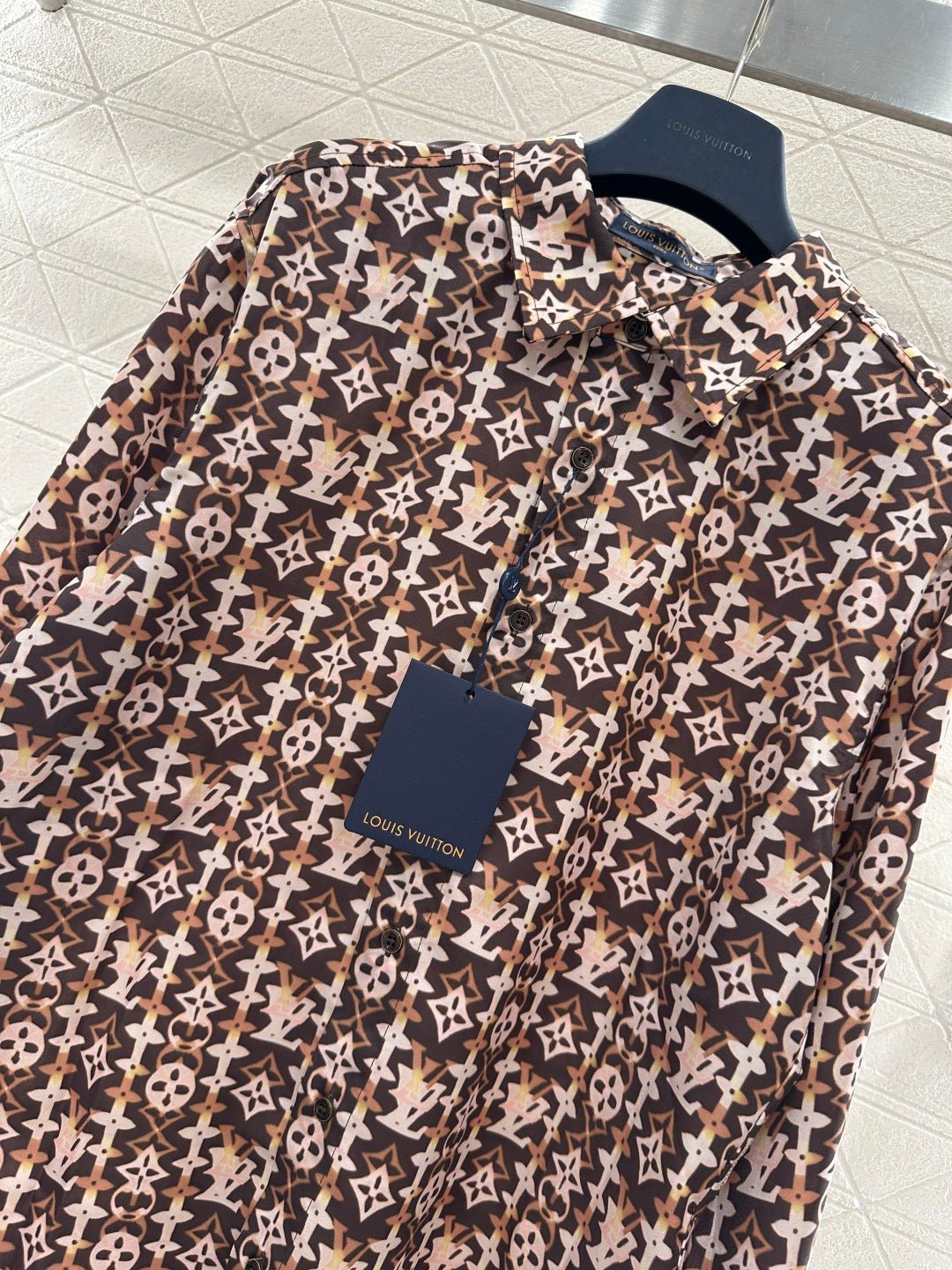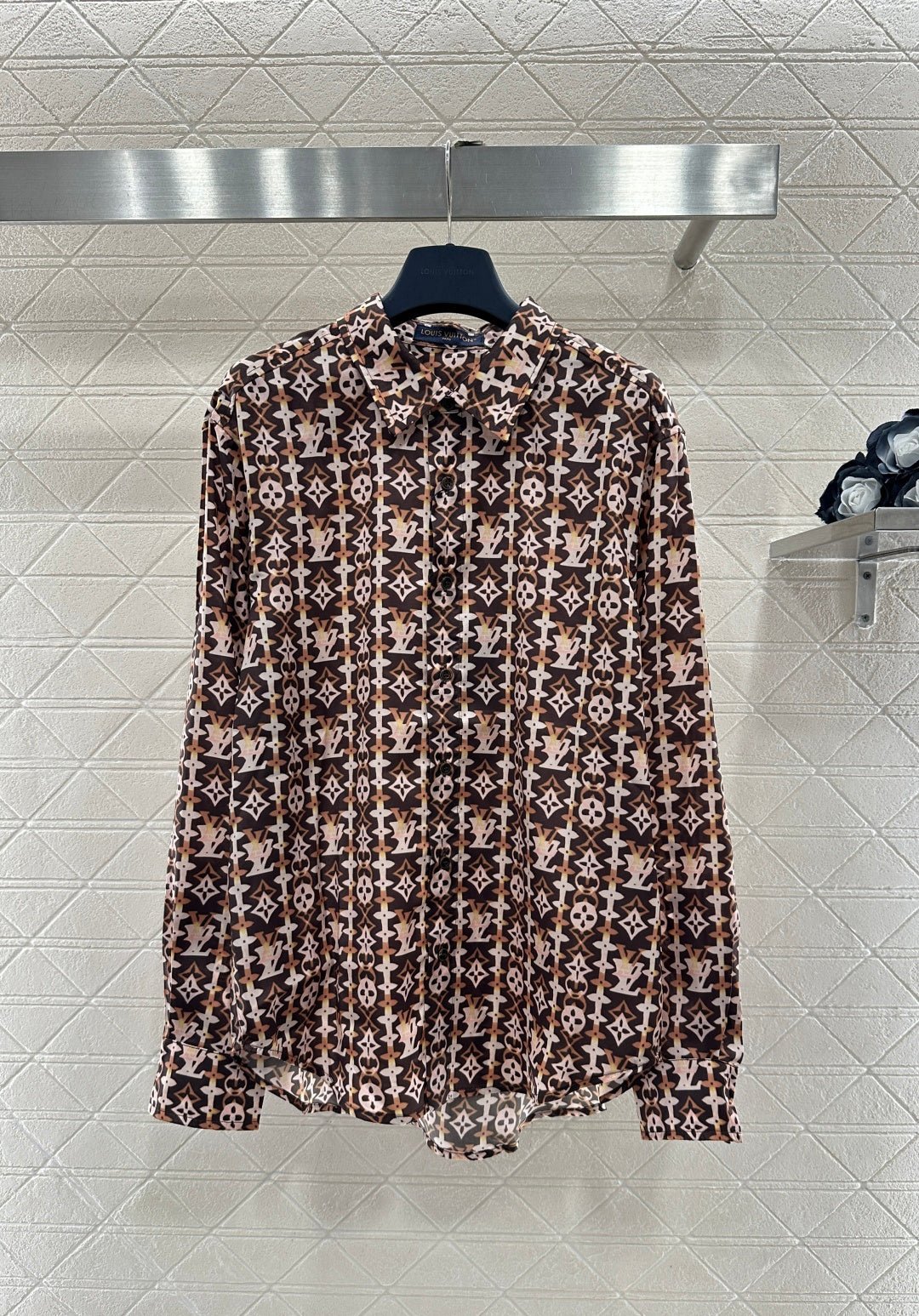 Made from imported silk, this shirt boasts a luxurious sheen and feels comfortable against the skin. The relaxed fit and collared design, combined with the classic monogram print, perfectly blend retro and modern styles. The all-over brown monogram print is eye-catching and fashionable, while the lightweight fabric drapes beautifully. The loose fit exudes a casual and relaxed vibe. Whether worn alone for a relaxed look or layered under a knitted vest for added depth, it effortlessly achieves a sophisticated feel, making it a versatile and essential everyday piece.