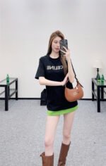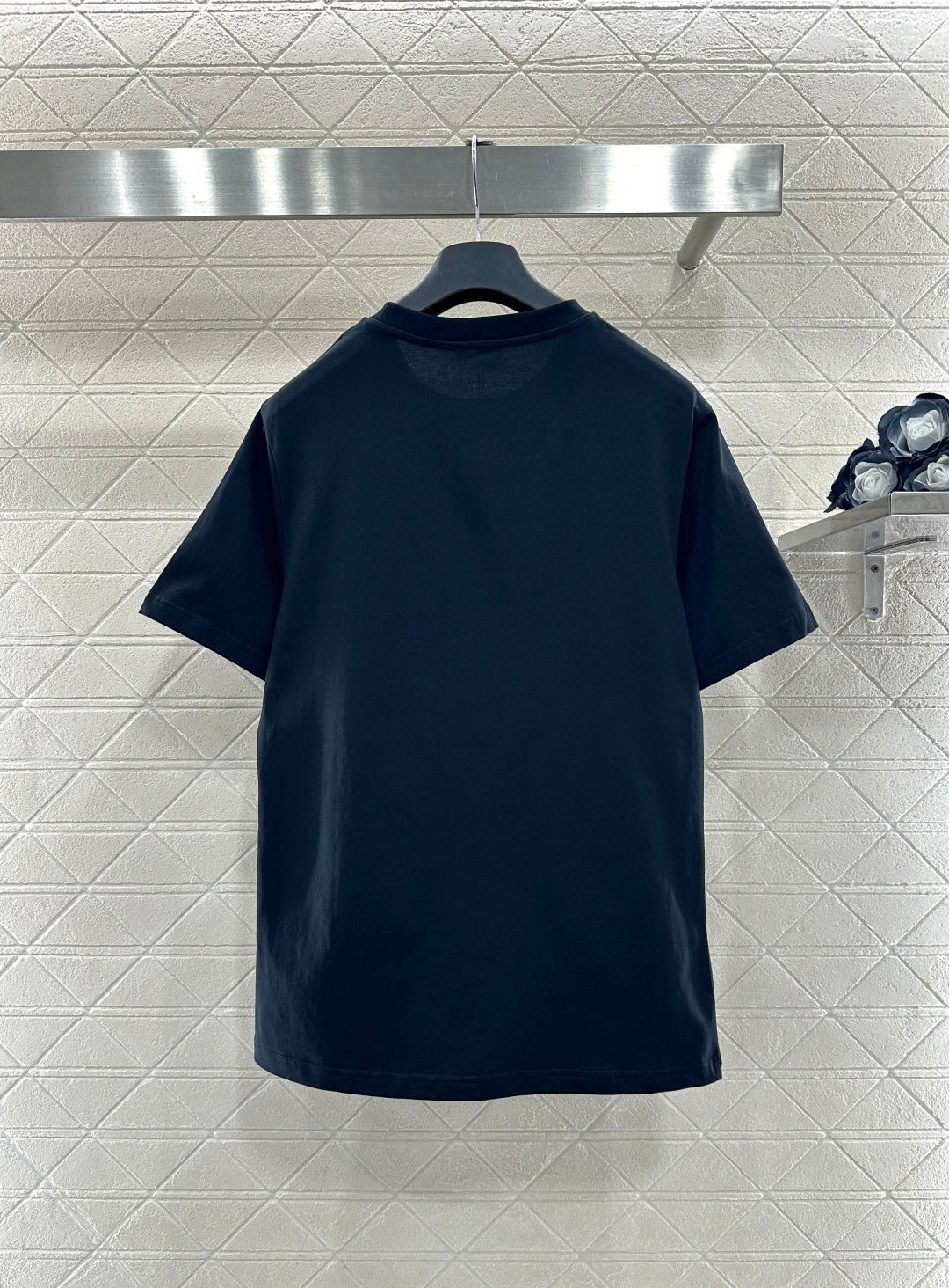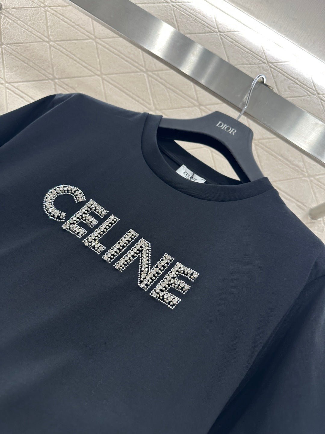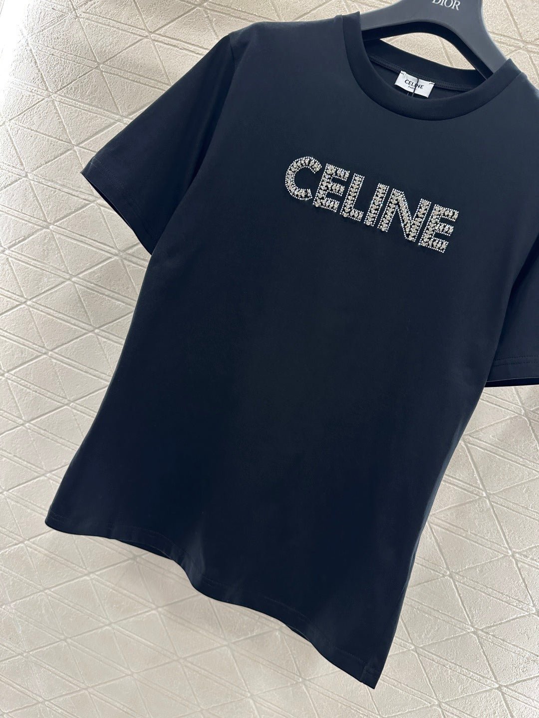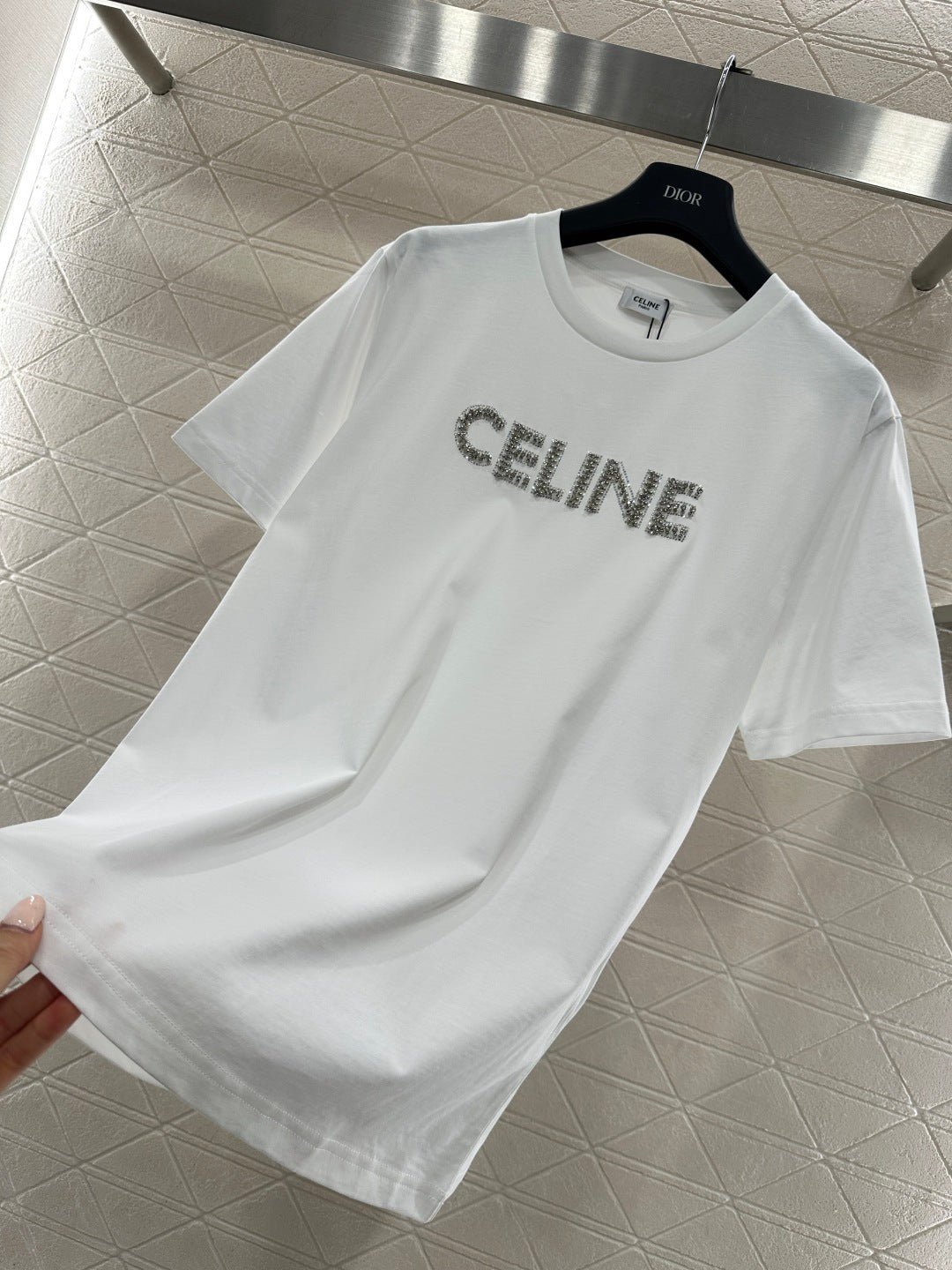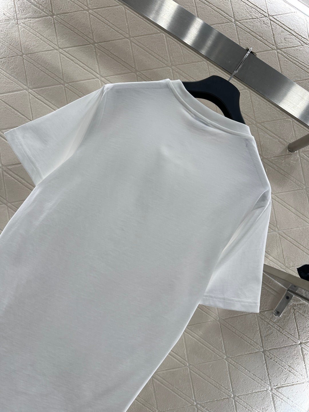 Made from mercerized cotton, this breathable and comfortable T-shirt boasts a premium feel. The classic short-sleeved design and pure cotton fabric create a timeless silhouette. The C* logo, adorned with rhinestones, adds a striking detail. The soft texture balances comfort and structure, while the simple crew neck and short sleeves flatter all body types. It’s a versatile piece for casual everyday wear, or layered under a jacket for a sophisticated look. This minimalist luxury piece perfectly blends understated elegance with street style, making it a must-have in any wardrobe for both practicality and style. The versatile black and white color complements various outfit styles.