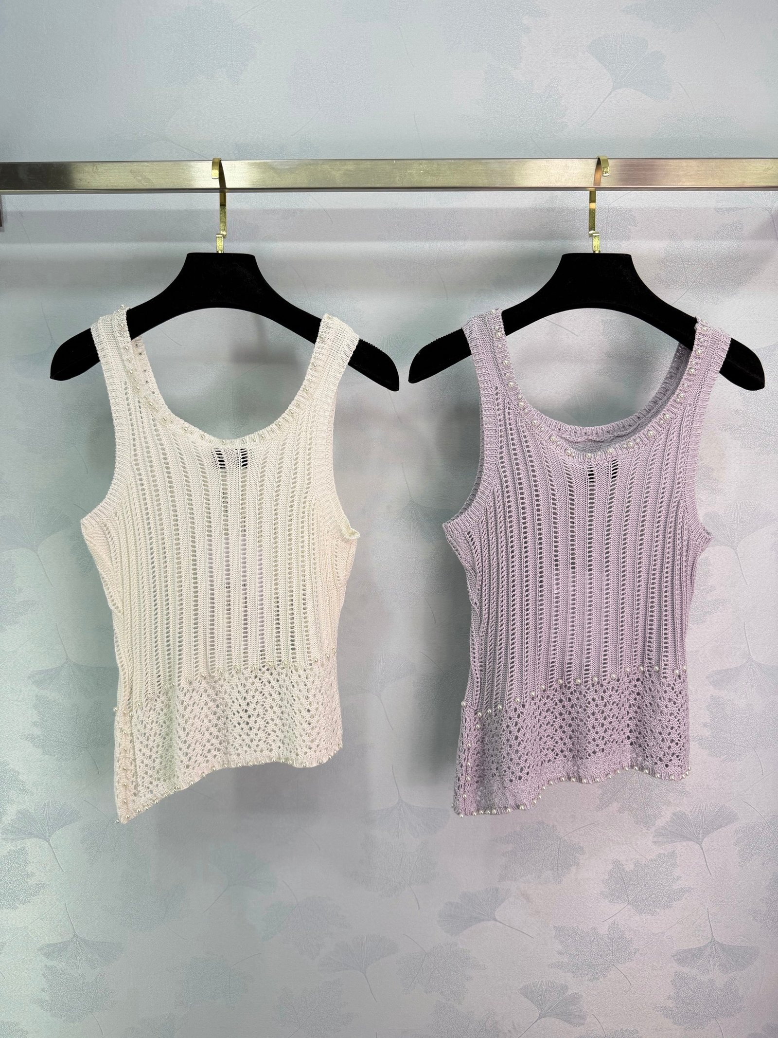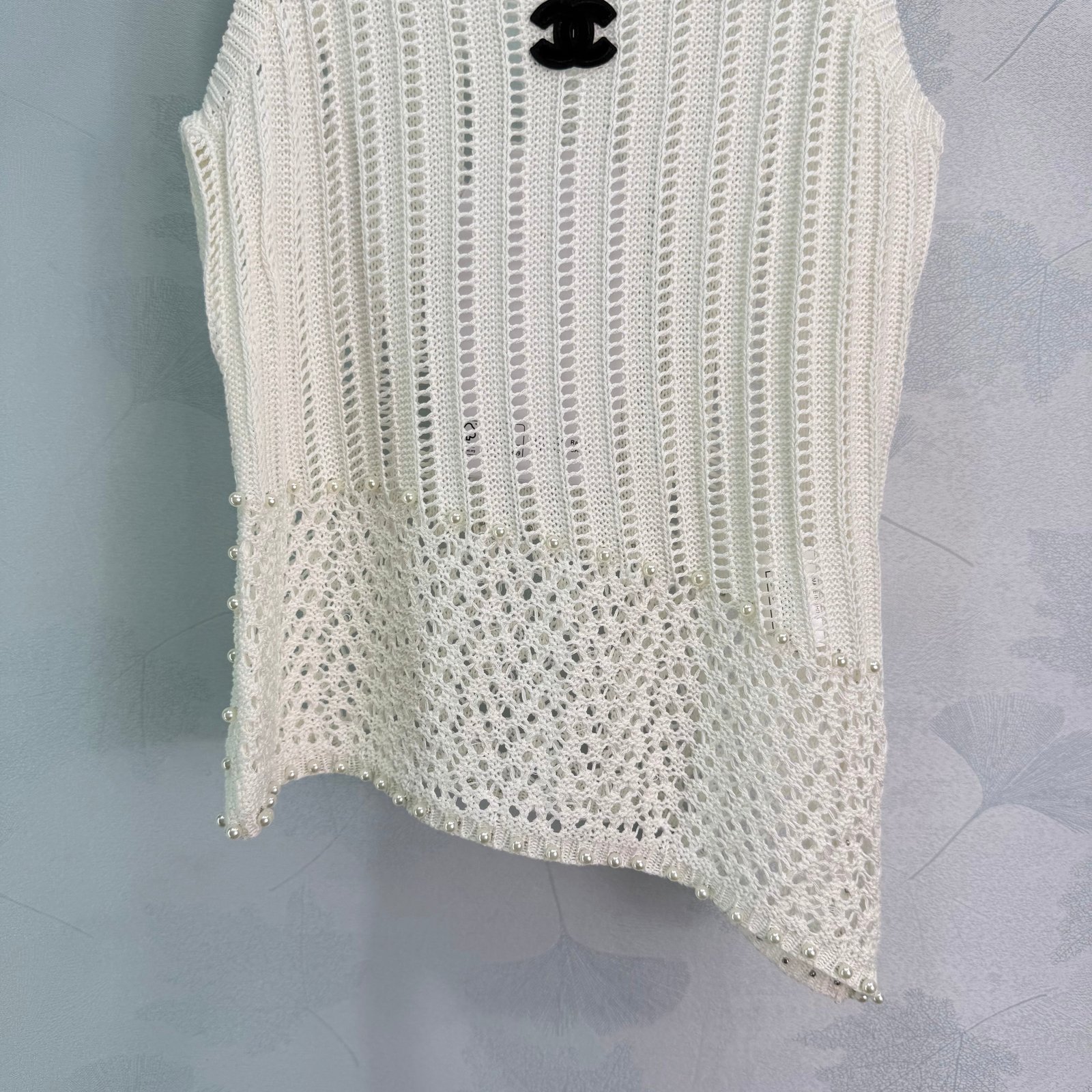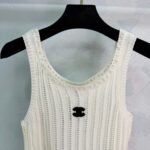 Made from imported silk and wool yarn, lightweight and breathable for comfortable wear. The round neck and sleeveless design features an all-over openwork texture and a double-C embroidered logo on the chest, adding a touch of sophistication. Simple yet stylish, the slightly asymmetrical hem adds a casual yet fashionable feel. Pairs perfectly with high-waisted pants or skirts.