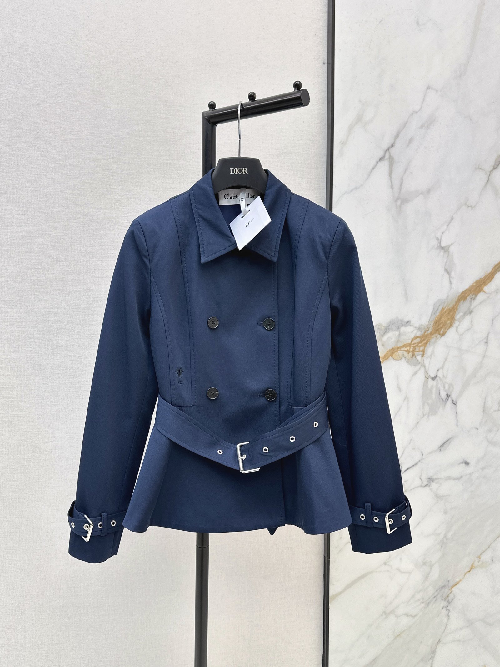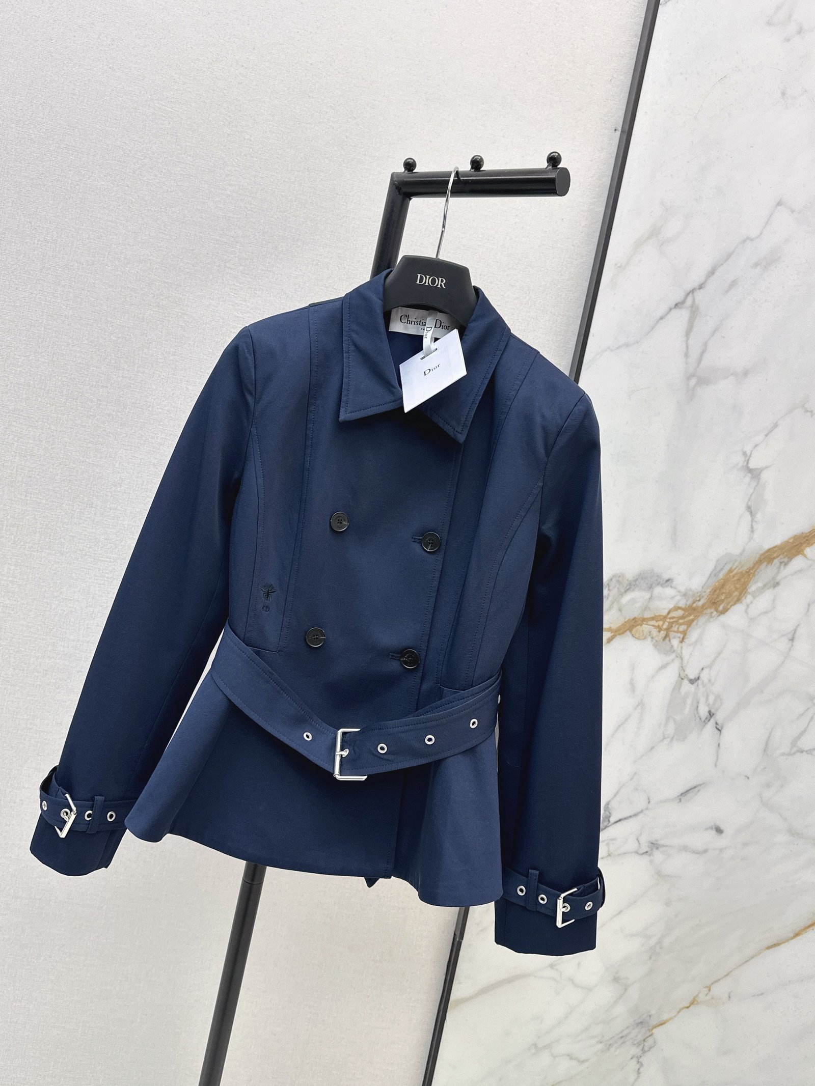 European-style chic. The cropped cut gives it a sophisticated and stylish look. Perfect for commuting or a casual outing. Great for photos. Pairs well with skirts or pants. Adorned with a small embroidered bee on the side.