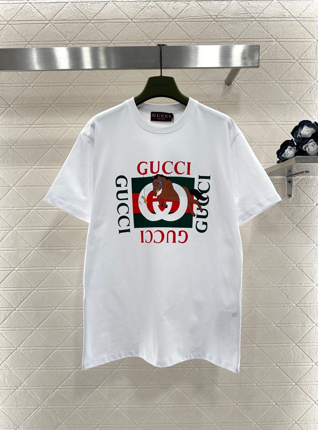 Made from pure cotton, this breathable and comfortable T-shirt boasts a premium feel. The loose-fitting short-sleeved design features the classic double G logo paired with a retro equestrian print. The contrasting red and green colors highlight the brand’s distinctive style. The simple white T-shirt is versatile and practical, while the skin-friendly cotton fabric provides comfort. Perfect for everyday wear, it showcases individuality while effortlessly achieving a sophisticated casual look. In keeping with the auspicious meaning of the Year of the Horse, it creates a high-fashion style.
