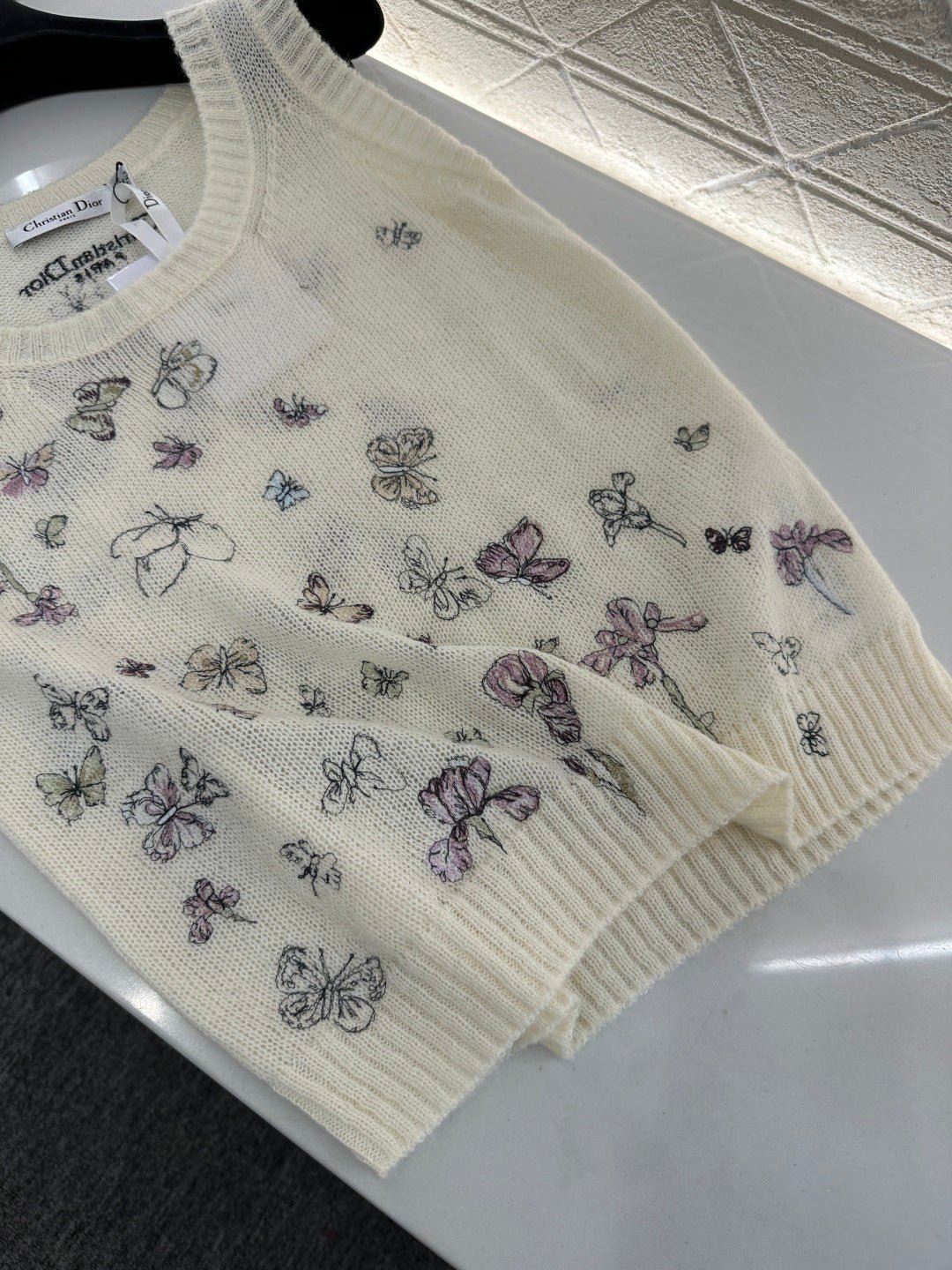 Crafted from silk and wool yarn, this vest boasts a luxurious feel, offering exceptional comfort and softness. The round neck design and delicate plain knit stitching, along with the ribbed edging throughout, subtly highlight its exquisite details. A butterfly motif adorns the entire garment, distributed in a balanced pattern from one shoulder downwards. Colorful thread embroidery creates a romantic and gentle natural forest-inspired atmosphere, lifelike and refined, exuding elegance and sophistication.