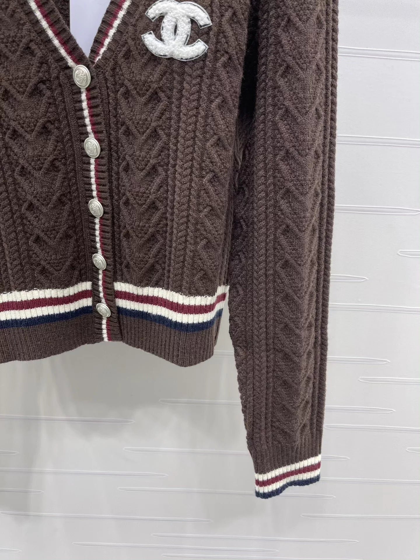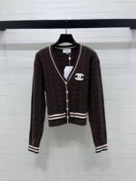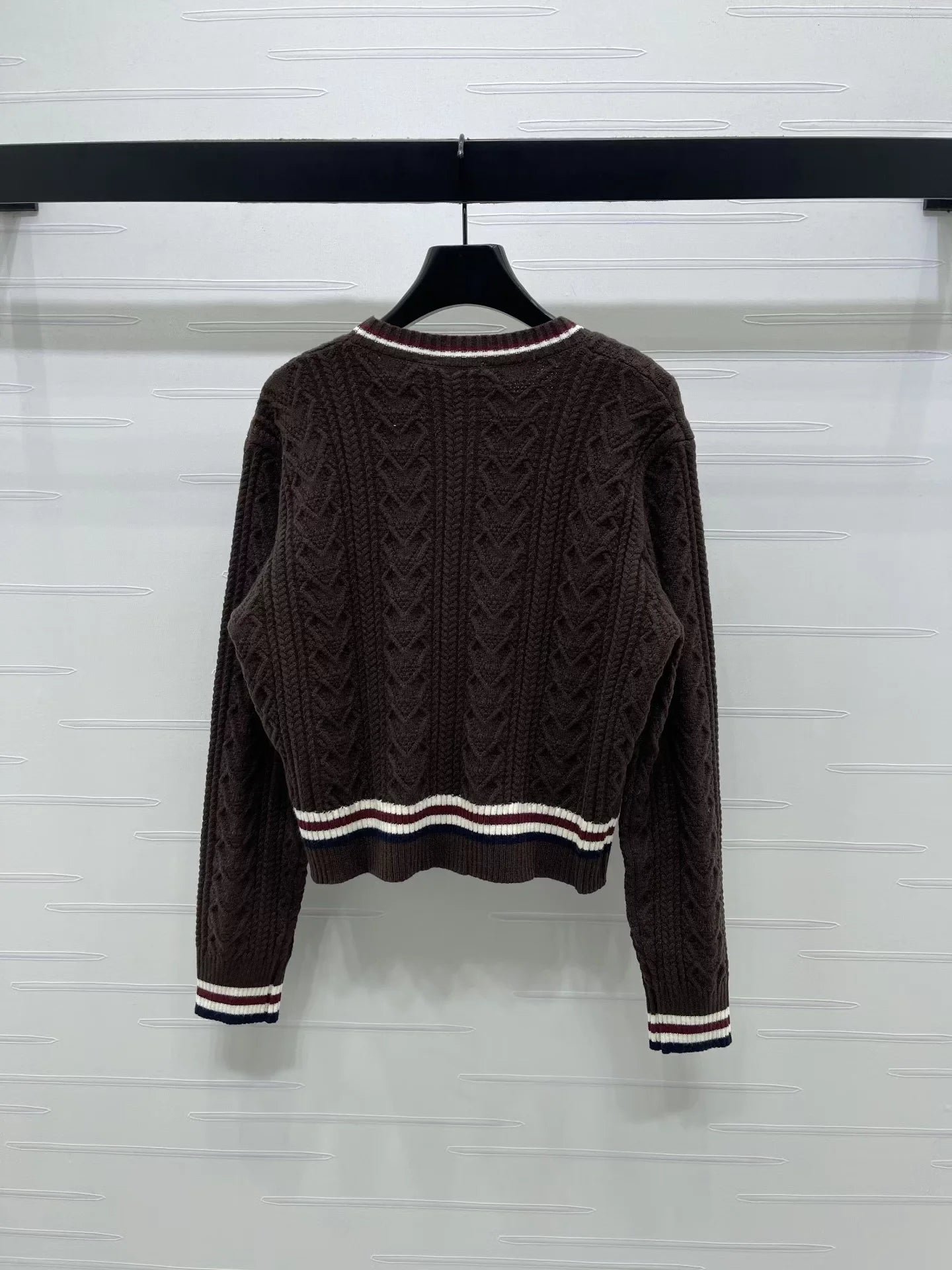 Made from a wool blend knit fabric, this cardigan is comfortable and soft. It features an all-over vertical cable knit design, contrasting ribbed stripes on the neckline, cuffs, and hem for added dimension, and a signature embroidered logo on the chest.
