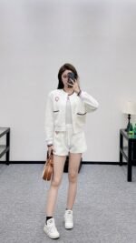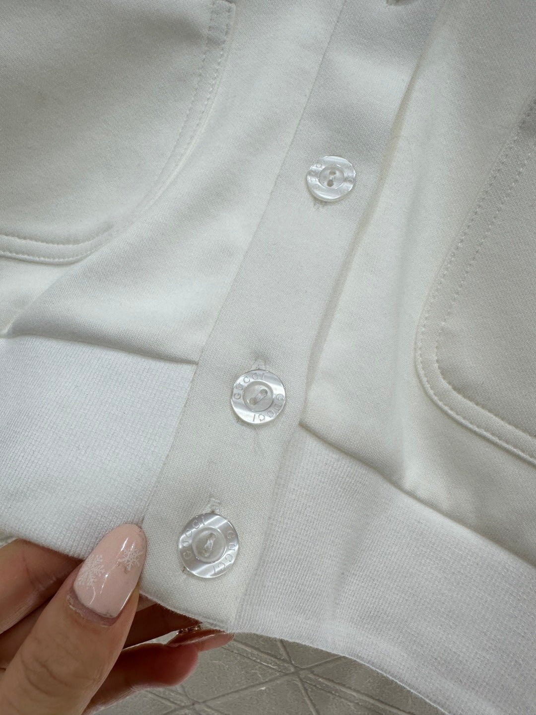 Made of soft, skin-friendly twill cotton, this white G* set is incredibly cute and perfect for any girl! The creamy white base is accented with brick-red trim, and delicate horsebit embroidery adorns the garment. The combination of a cropped cardigan and high-waisted shorts effortlessly elongates the legs. The soft, comfortable fabric feels great against the skin. Wearing the set is effortlessly chic, or you can style the pieces separately for different looks, creating a simple yet sophisticated style.