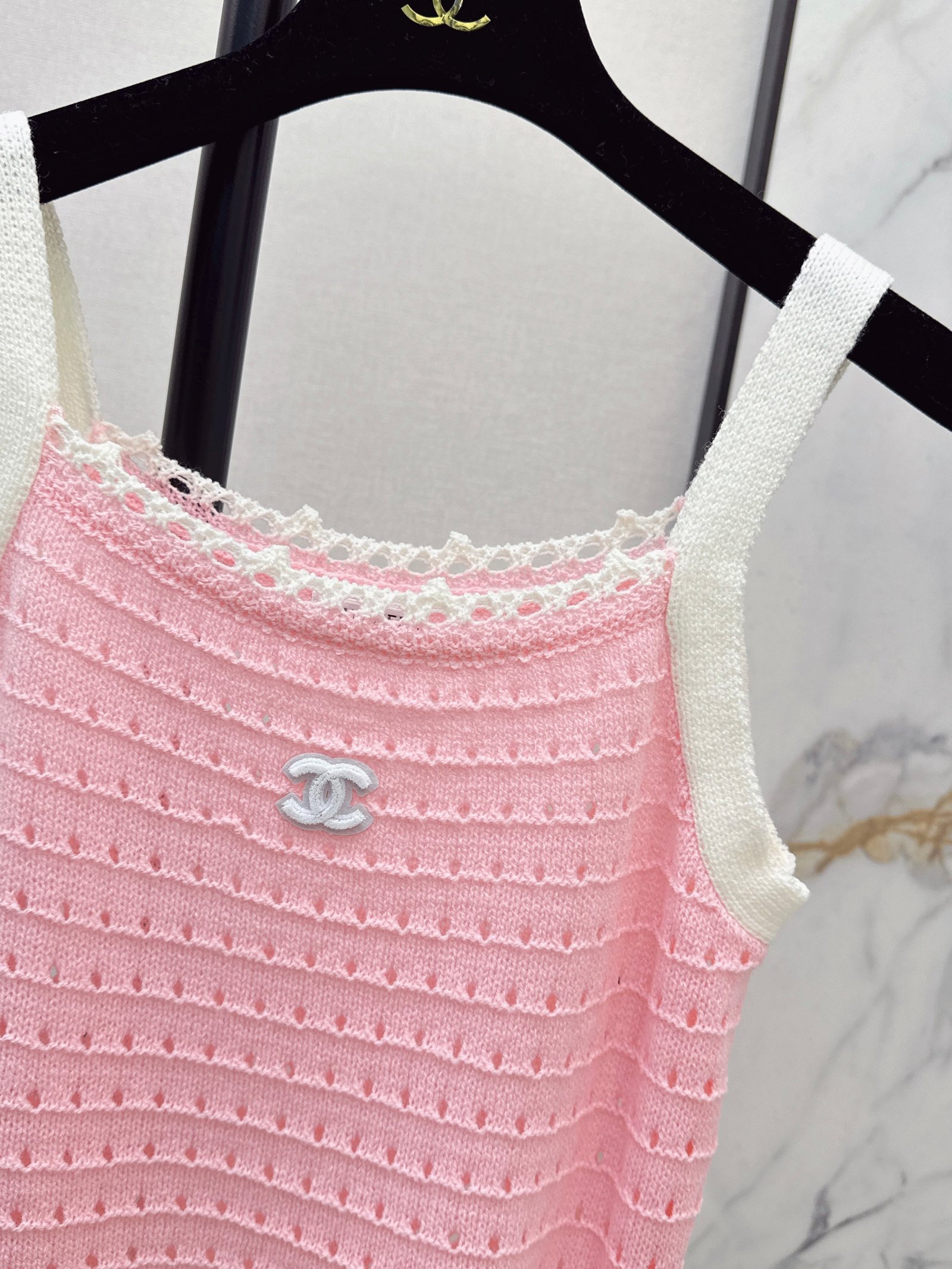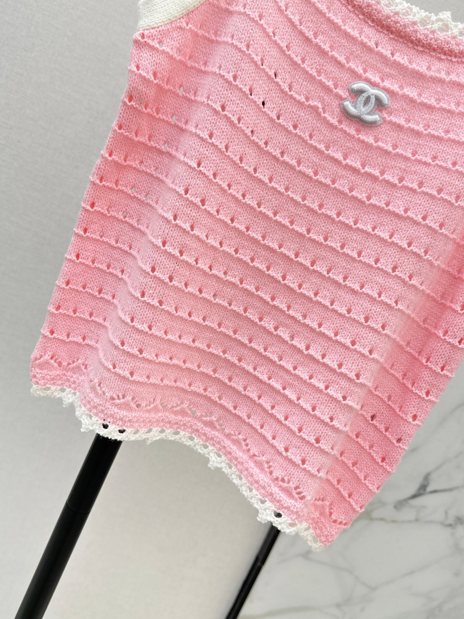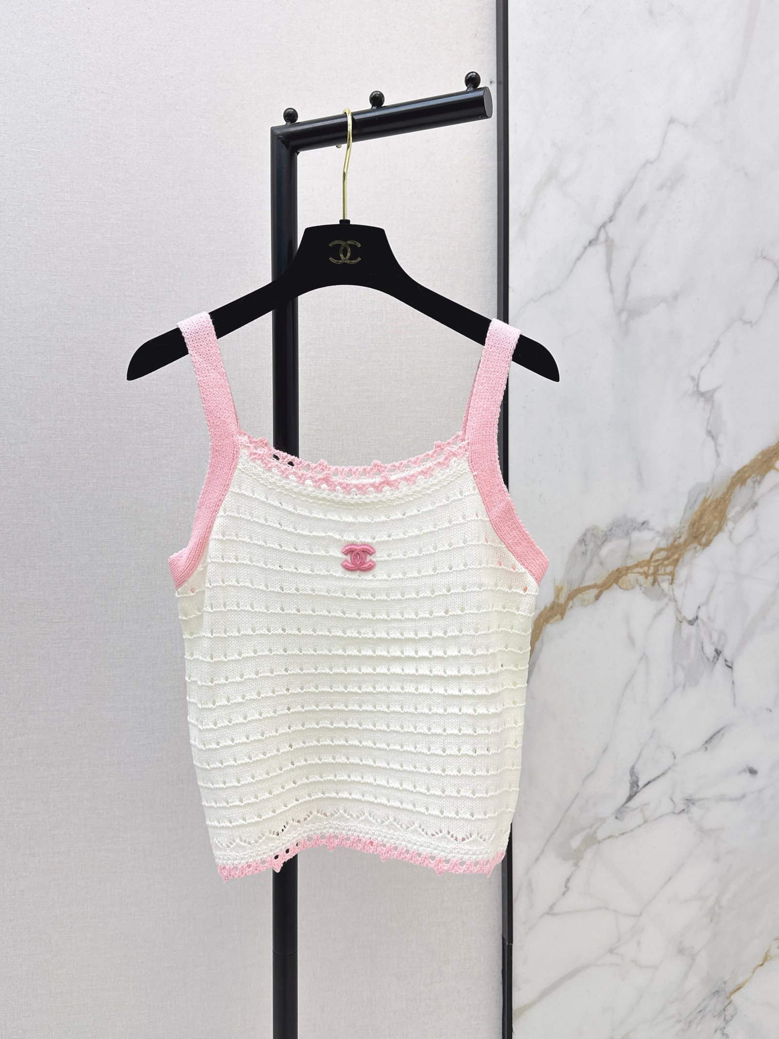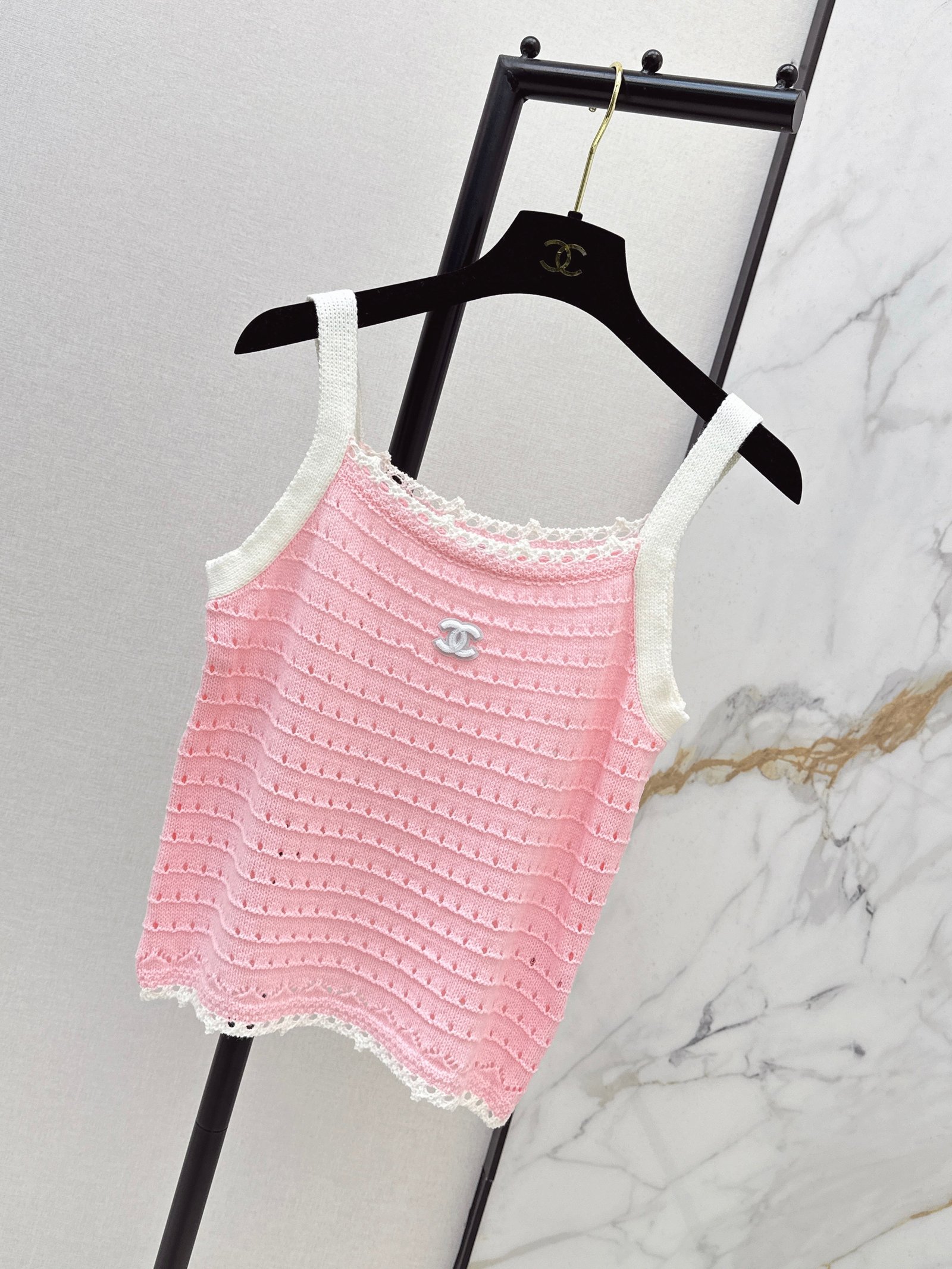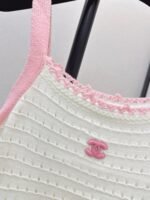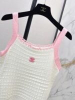 Made of soft, breathable, and comfortable knit fabric. Features a delicate openwork texture and lace trim for exquisite details. The double C logo on the chest is highly recognizable. The sleeveless design makes it versatile for summer wear, whether worn alone or as a layering piece. Effortlessly create a fresh and elegant style, perfect for everyday outings or vacations.