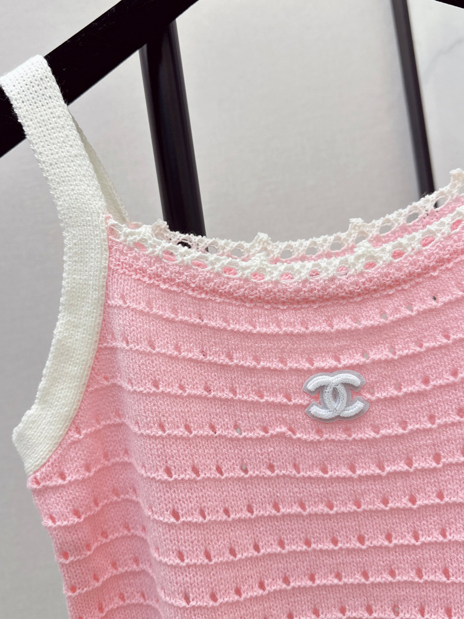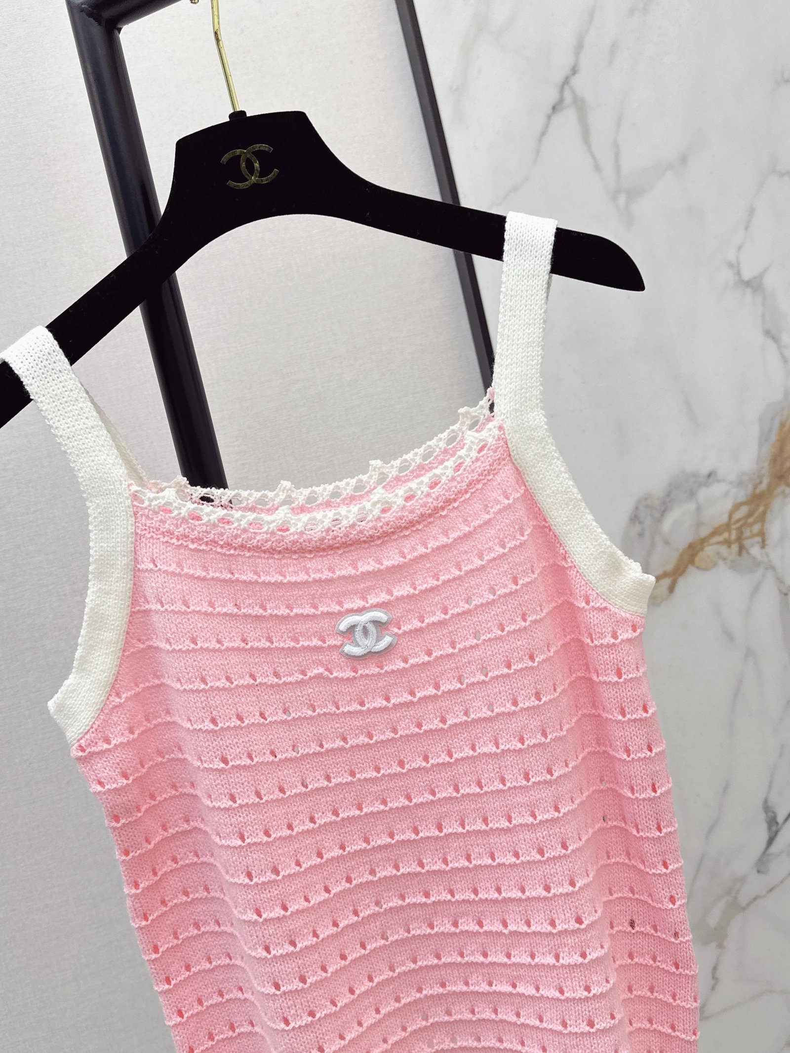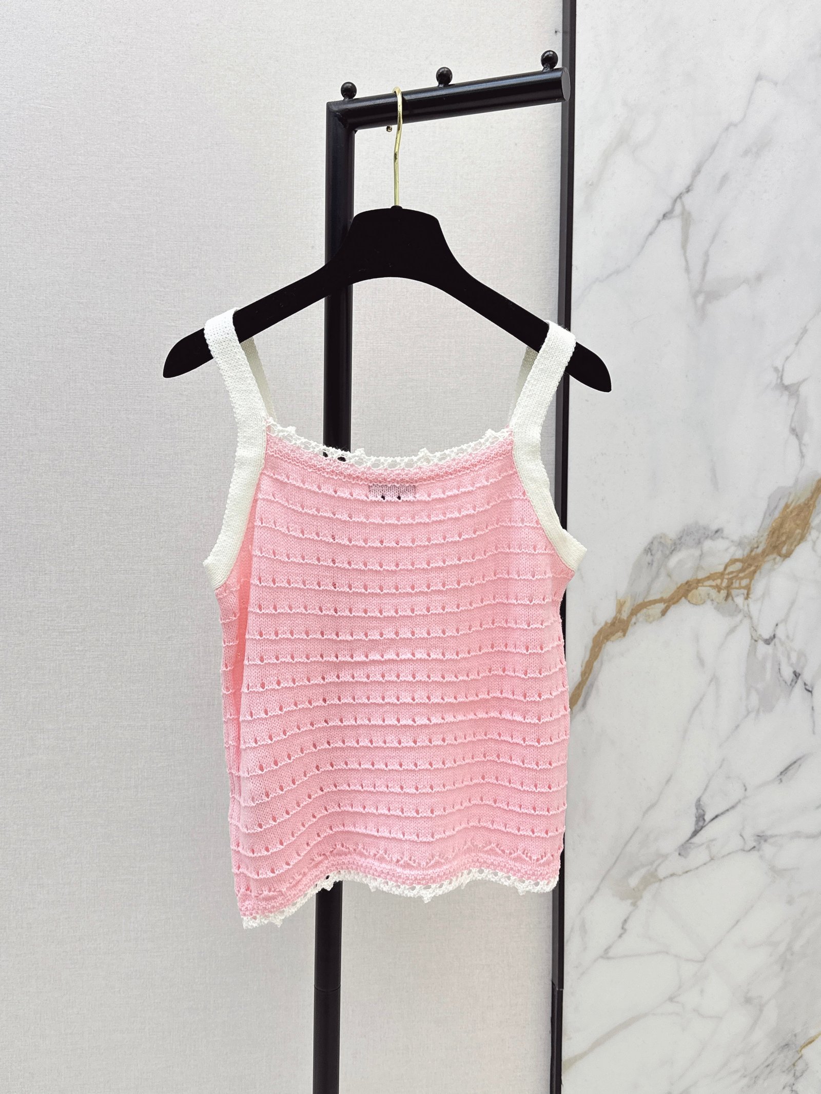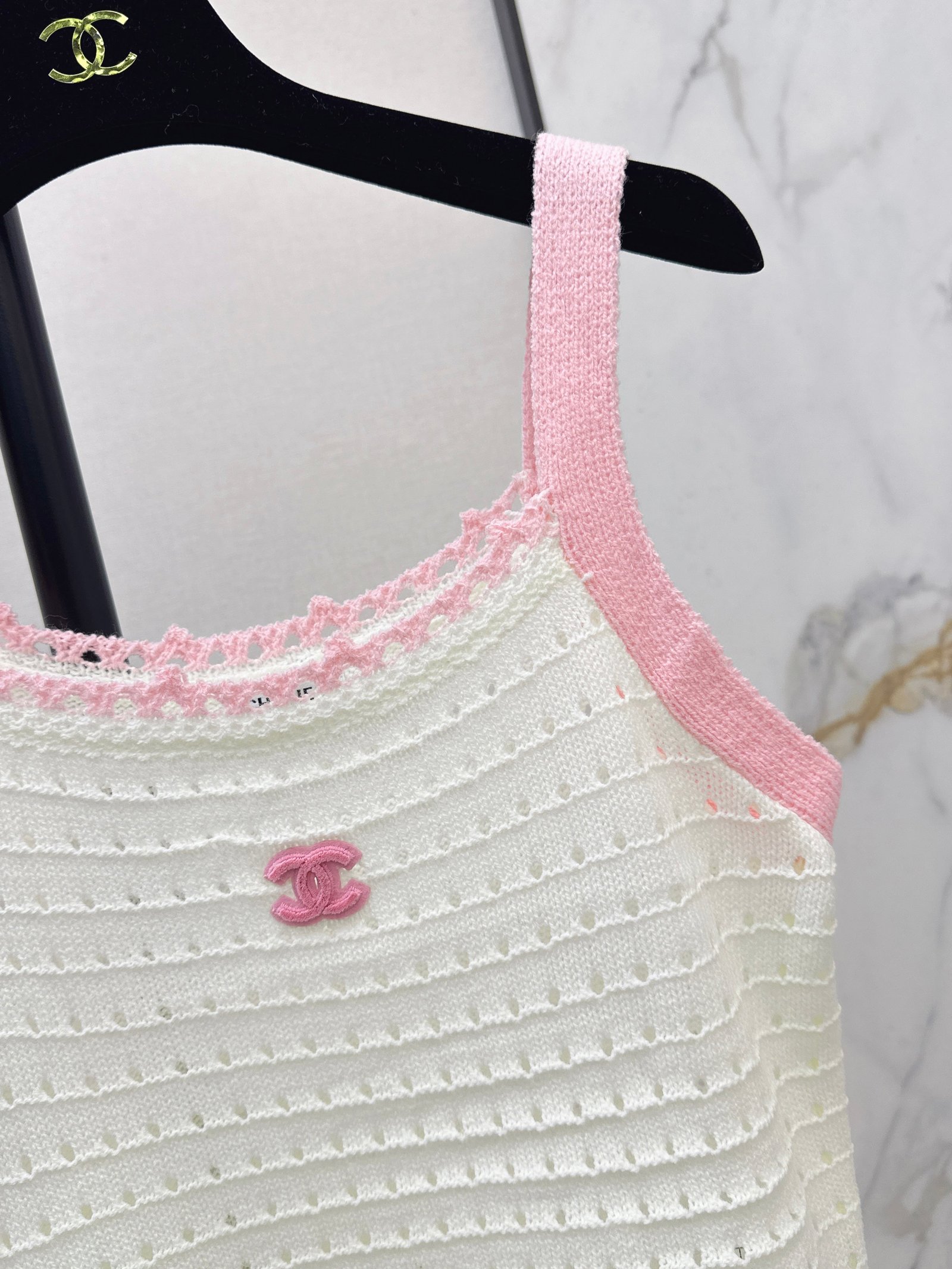 Made of soft, breathable, and comfortable knit fabric. Features a delicate openwork texture and lace trim for exquisite details. The double C logo on the chest is highly recognizable. The sleeveless design makes it versatile for summer wear, whether worn alone or as a layering piece. Effortlessly create a fresh and elegant style, perfect for everyday outings or vacations.