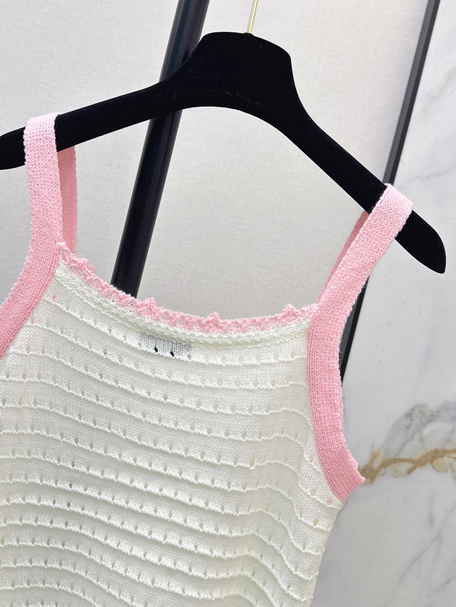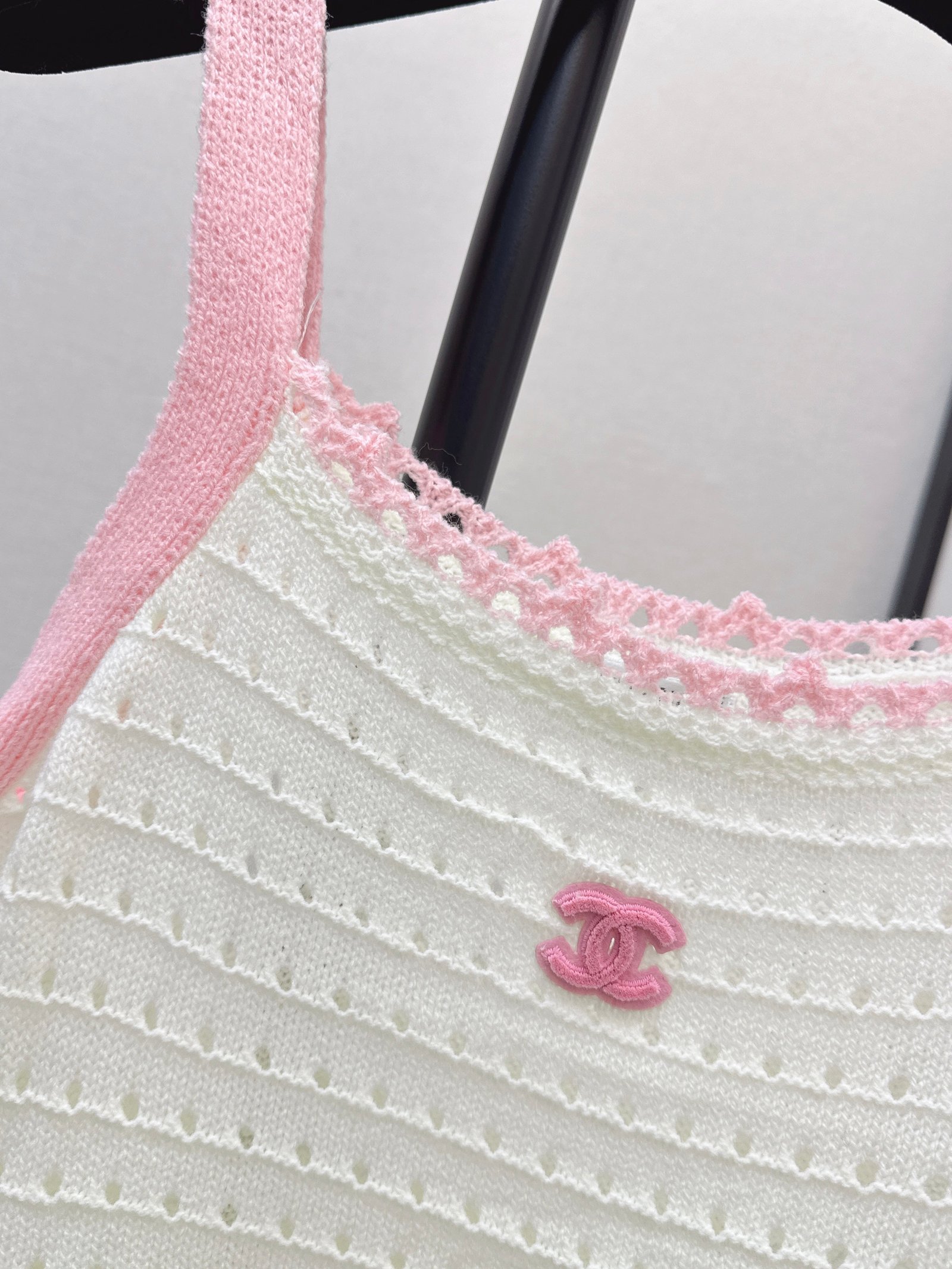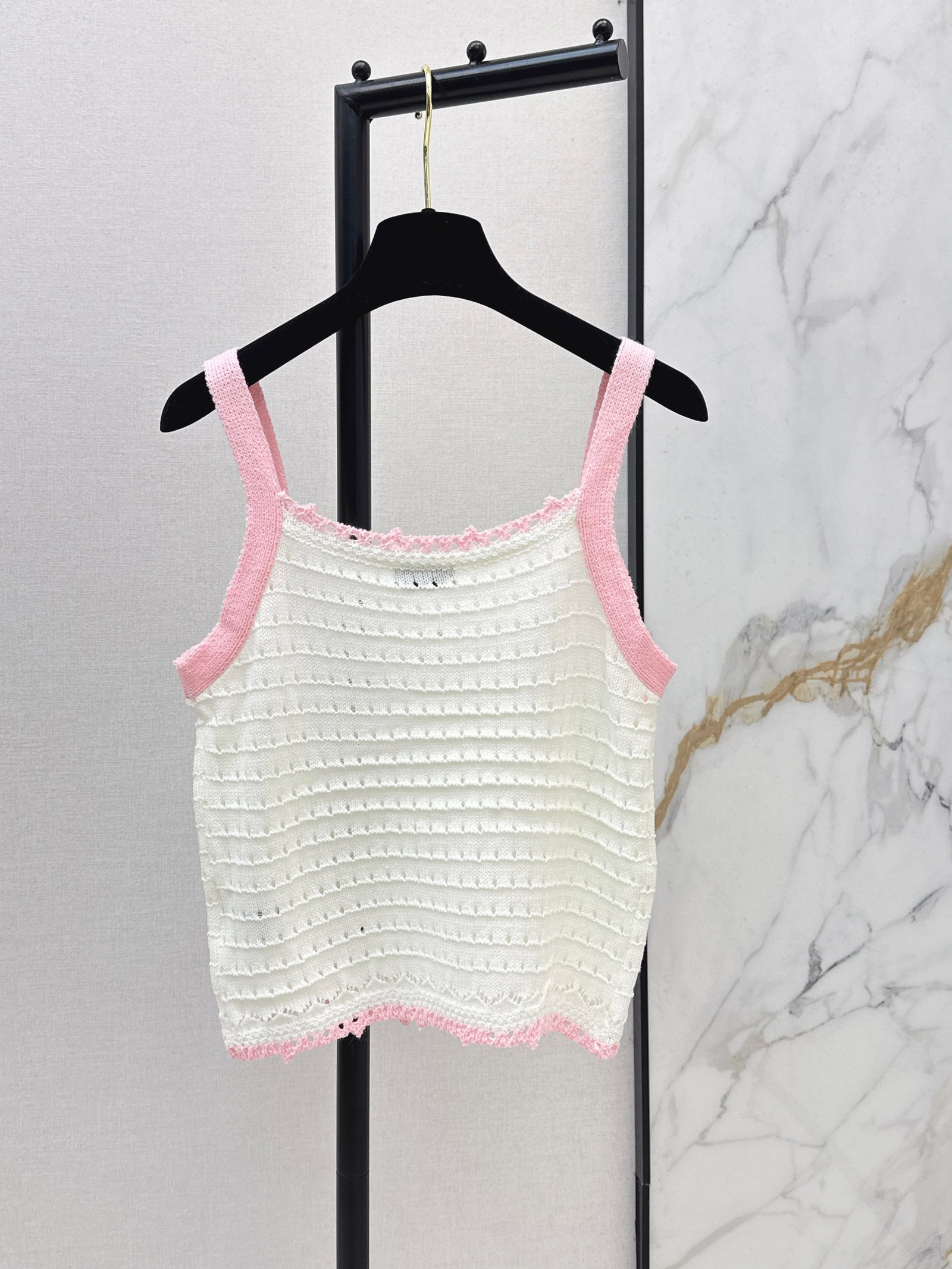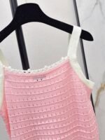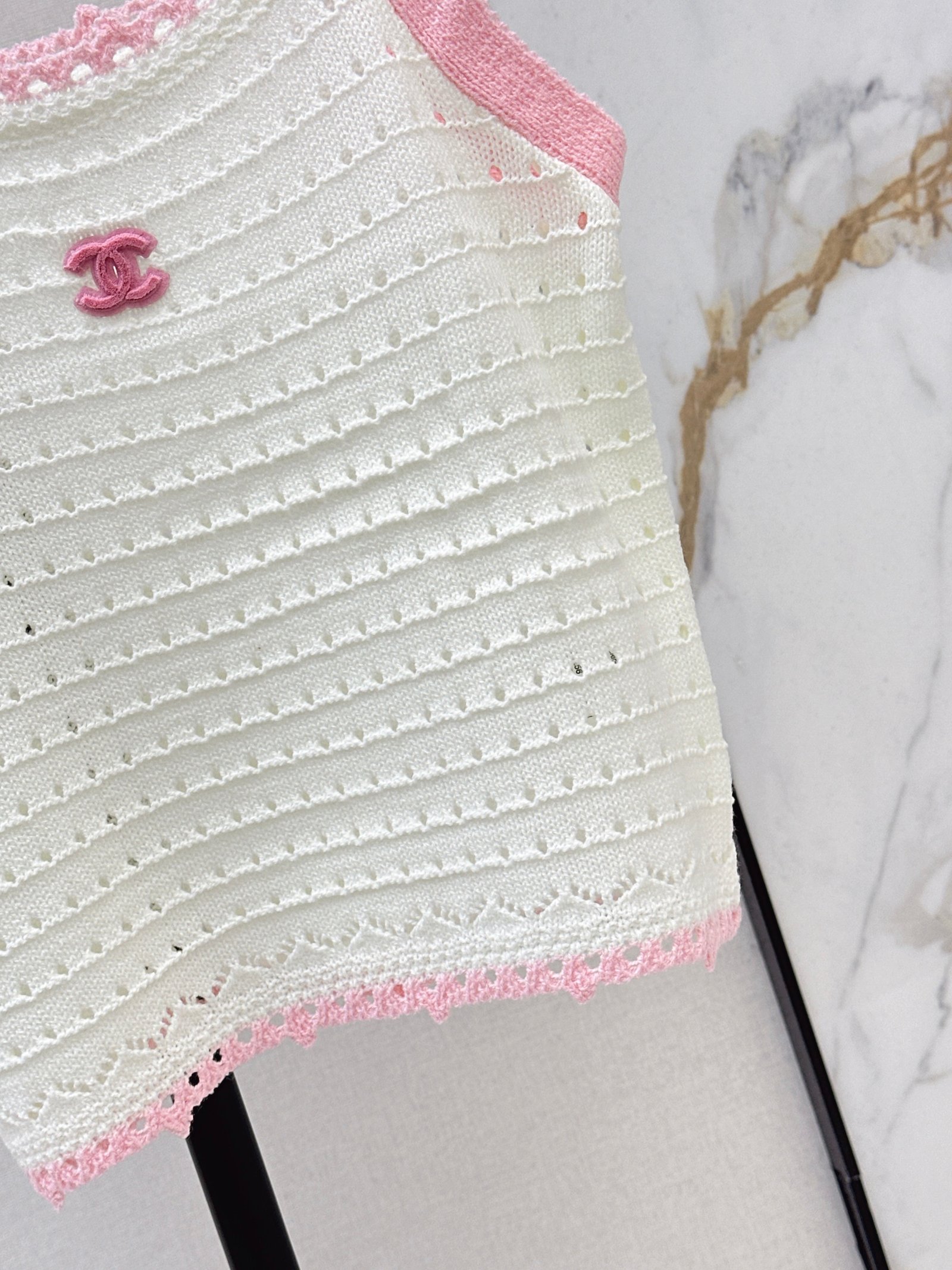 Made of soft, breathable, and comfortable knit fabric. Features a delicate openwork texture and lace trim for exquisite details. The double C logo on the chest is highly recognizable. The sleeveless design makes it versatile for summer wear, whether worn alone or as a layering piece. Effortlessly create a fresh and elegant style, perfect for everyday outings or vacations.
