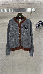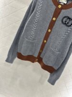 Crafted from wool yarn with a fine knit, this cardigan boasts a soft, comfortable feel against the skin. Featuring a round neck, button-down shoulders, and a design with gold double-G buttons adorning the front, it reflects light and exudes a relaxed, minimalist style. The three-dimensional double-G logo on the chest echoes the design, while contrasting trim extends from the collar and front to the hem and cuffs. The main body features a striking combination of cable knit and crochet details, adding depth and visual interest to the design.