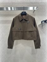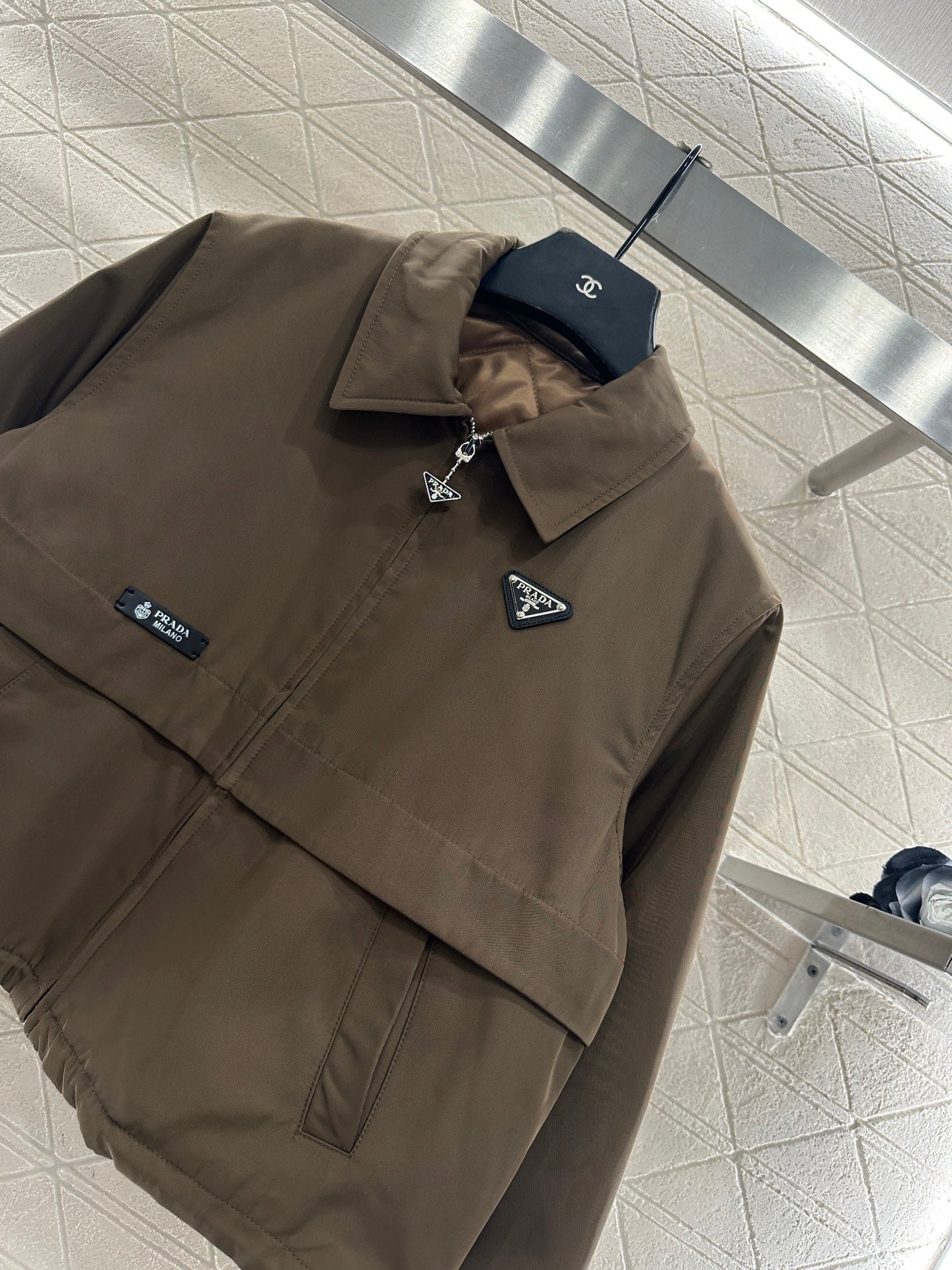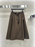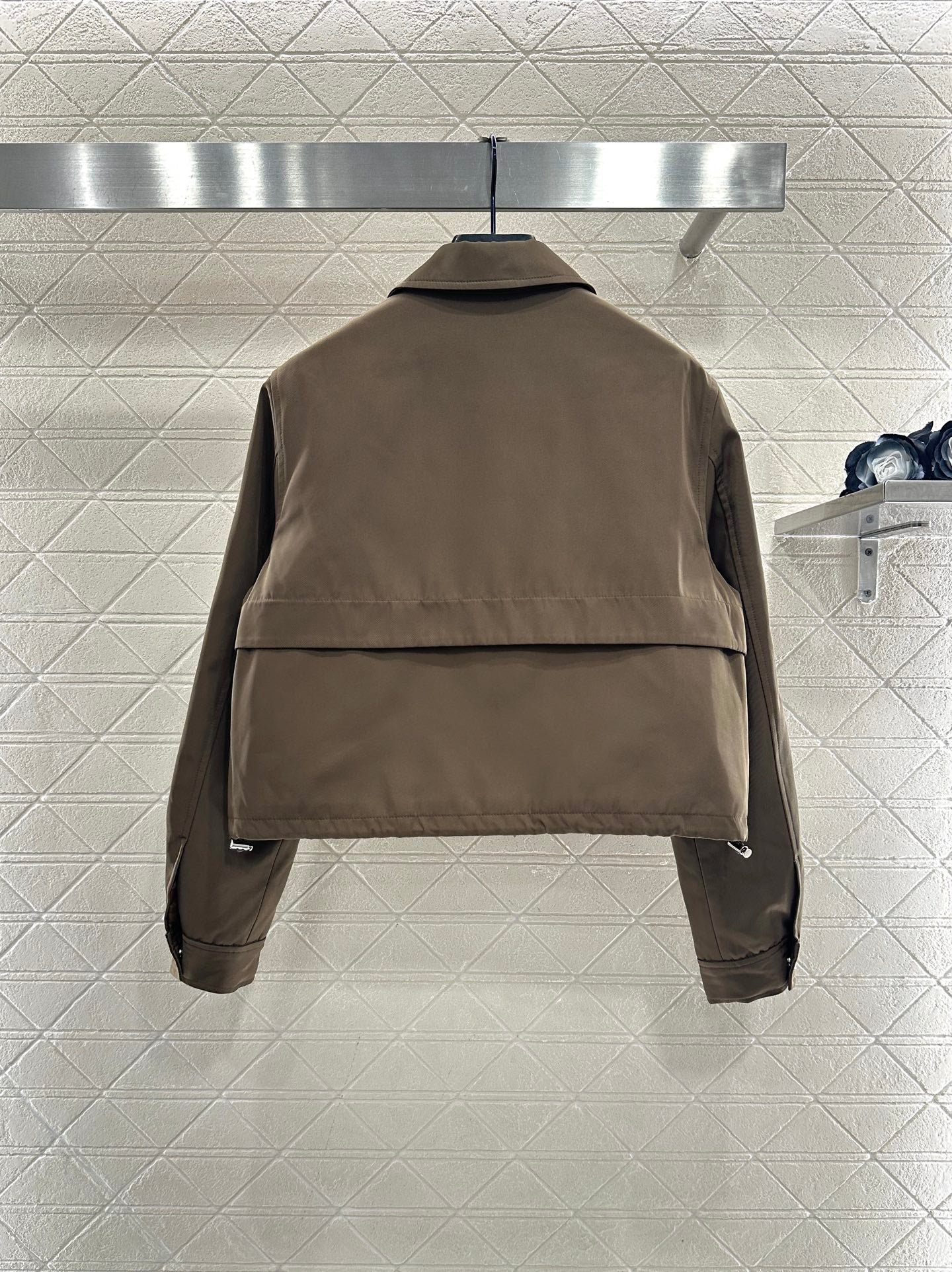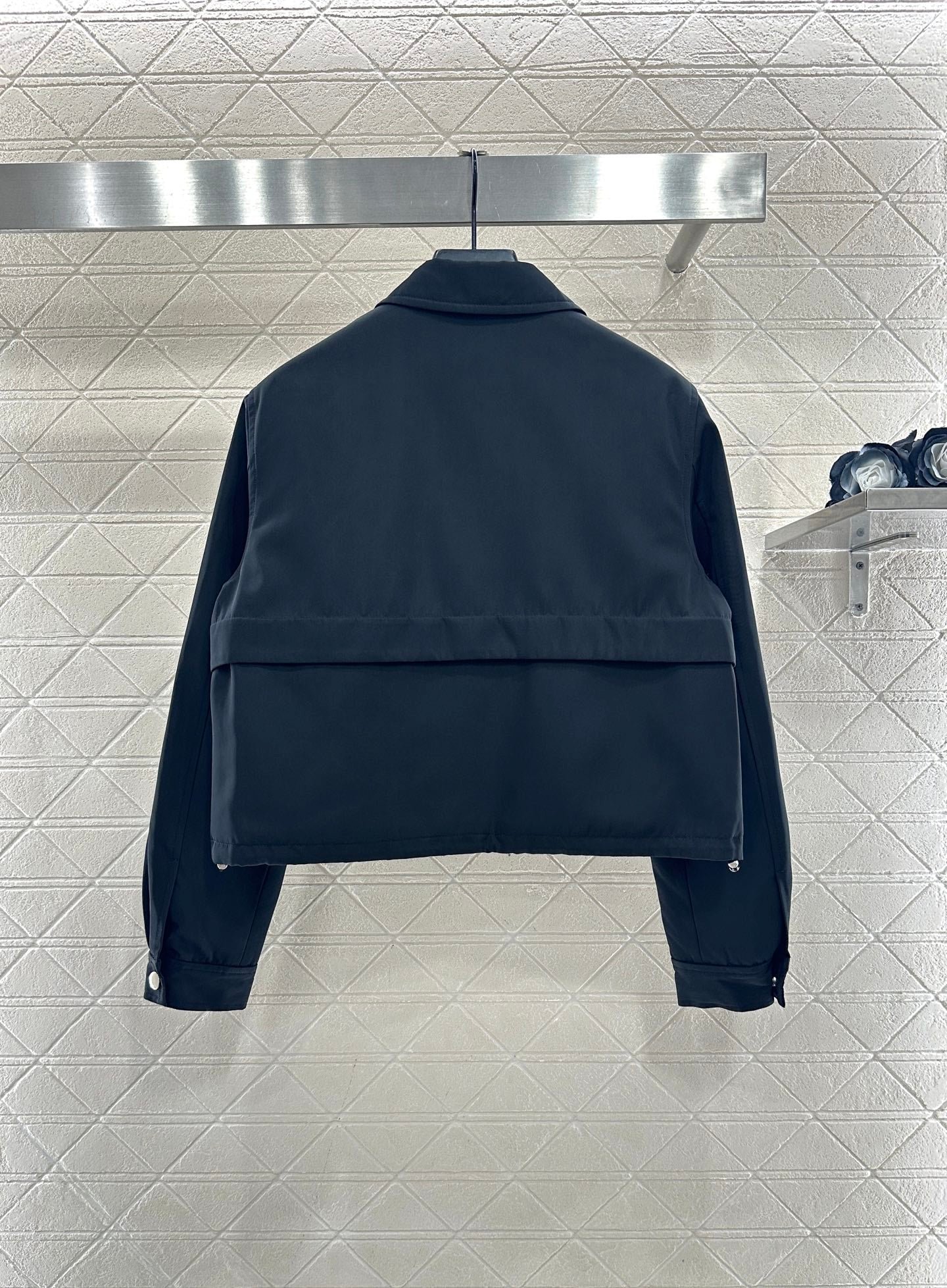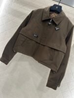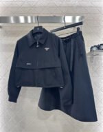 Nylon material, glossy texture, windproof and comfortable, lapel zipper jacket, cotton jacket ➕ A high waisted umbrella shaped skirt set, a fashionable workwear and casual style for the upper body. Front shoulder loose long sleeved jacket with layered waist fabric ➕ Metal triangle logo pattern on the chest, drawstring design at the hem, low-key and fashionable, highlighting the overall brand tone. High waisted umbrella shaped skirt with slightly flared hem ➕ Elastic buckle waistband treatment at the waist, easy to match, trendy and fashionable