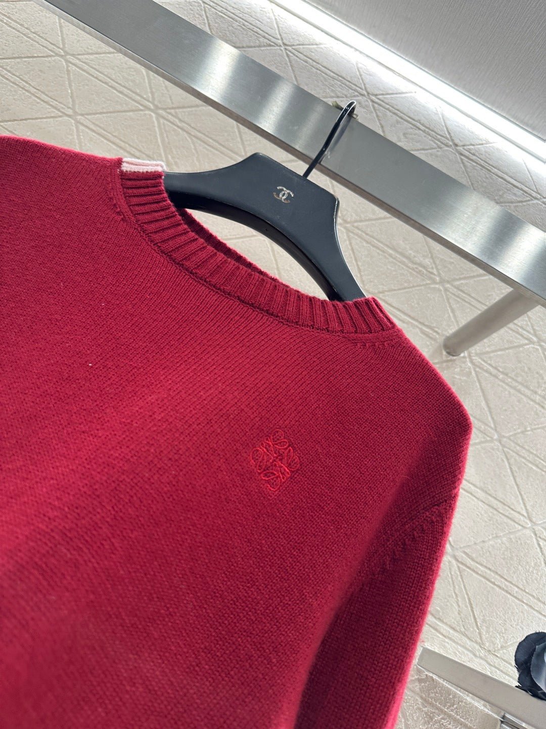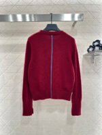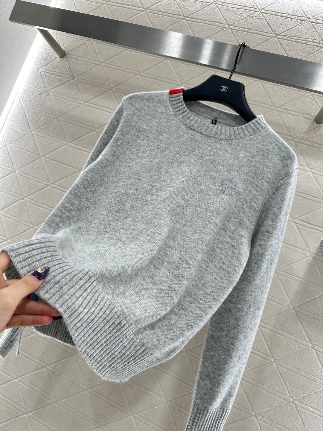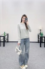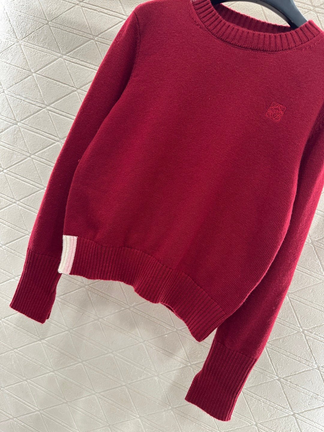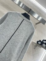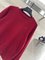Crafted from wool yarn, this high-quality, soft, and comfortable round-neck pullover sweater features a delicate vertical ribbed knit texture that flatters the shoulders and neck for a slimming effect. Contrasting ribbed detailing on one side of the neckline and hem adds a touch of refined detail, while a single-sided chest logo embodies a sophisticated and artistic style, enhancing the wearer’s overall charm and elegance.