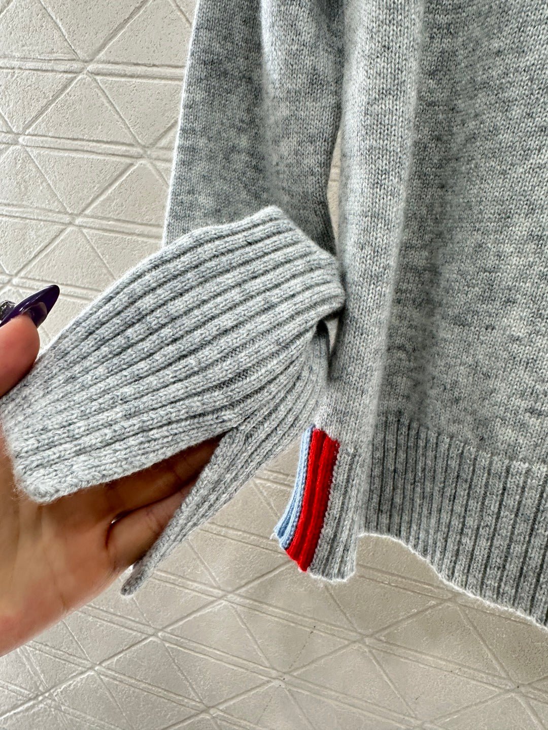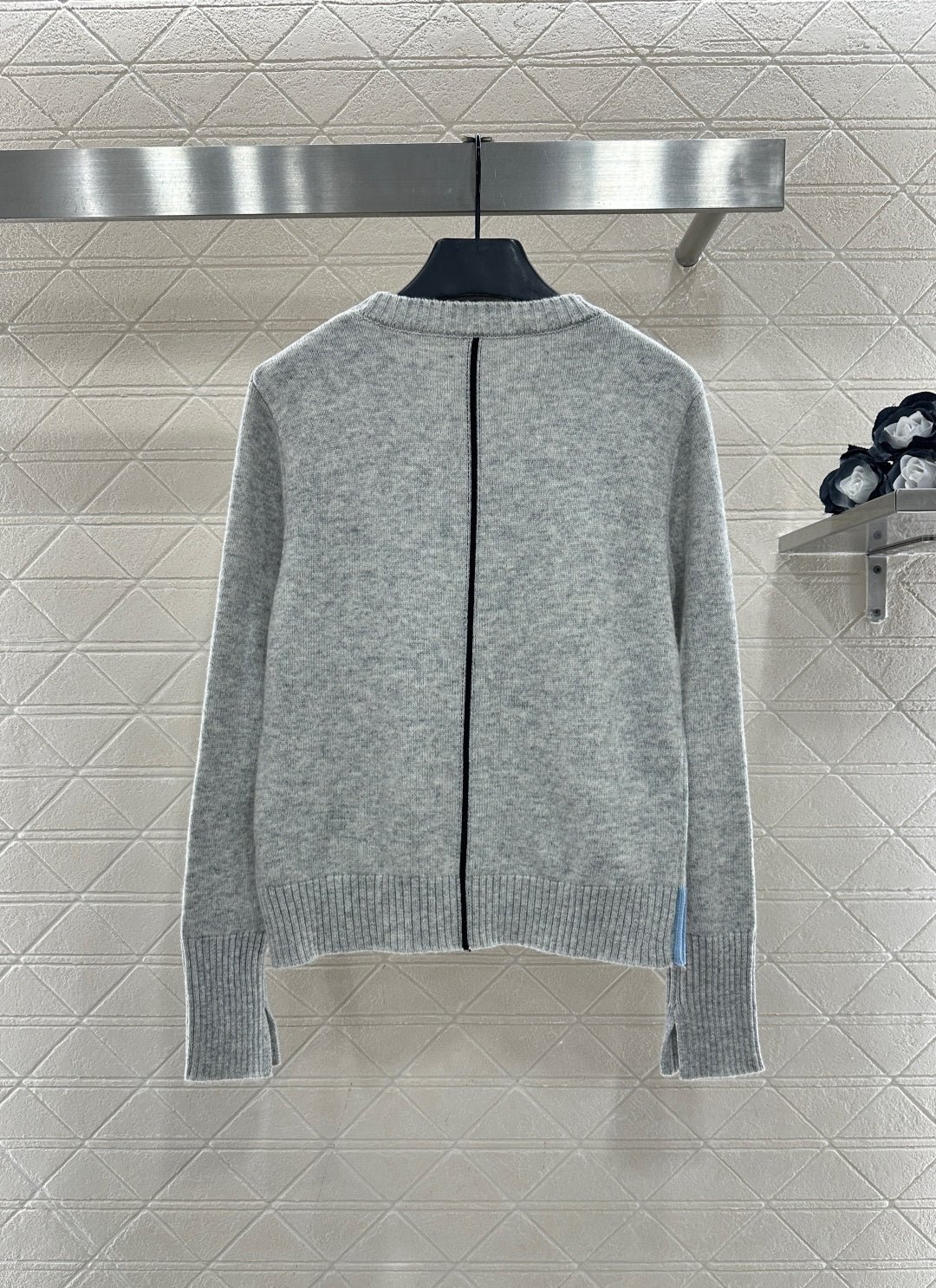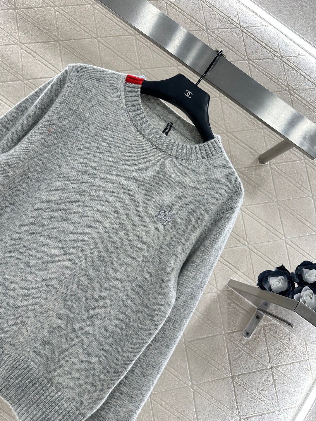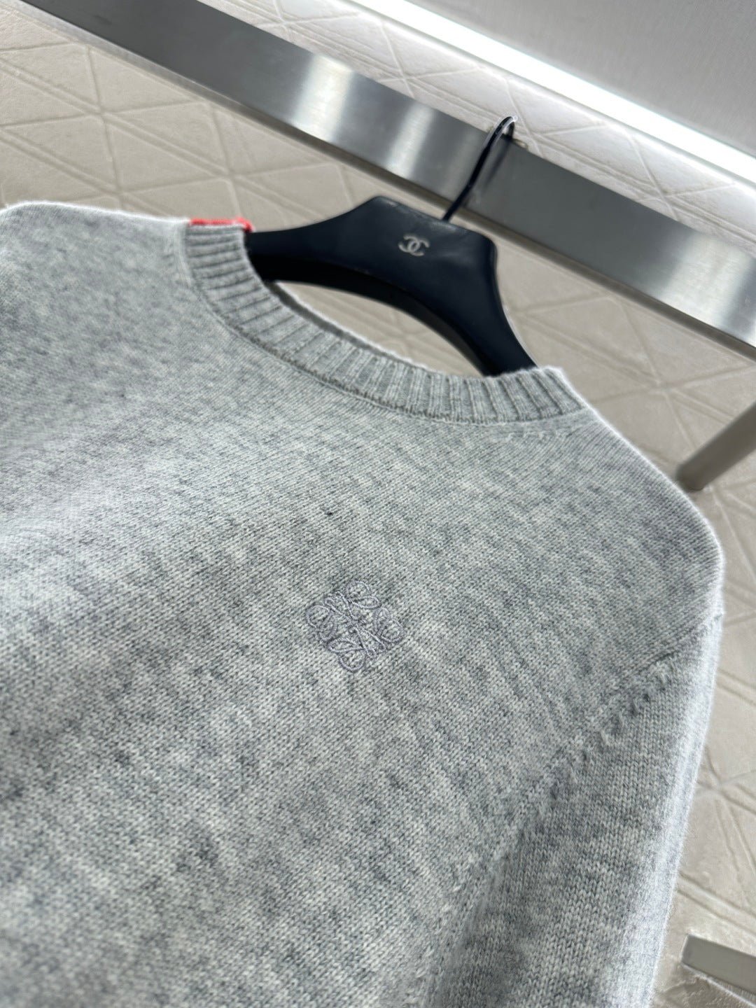 Crafted from wool yarn, this high-quality, soft, and comfortable round-neck pullover sweater features a delicate vertical ribbed knit texture that flatters the shoulders and neck for a slimming effect. Contrasting ribbed detailing on one side of the neckline and hem adds a touch of refined detail, while a single-sided chest logo embodies a sophisticated and artistic style, enhancing the wearer’s overall charm and elegance.