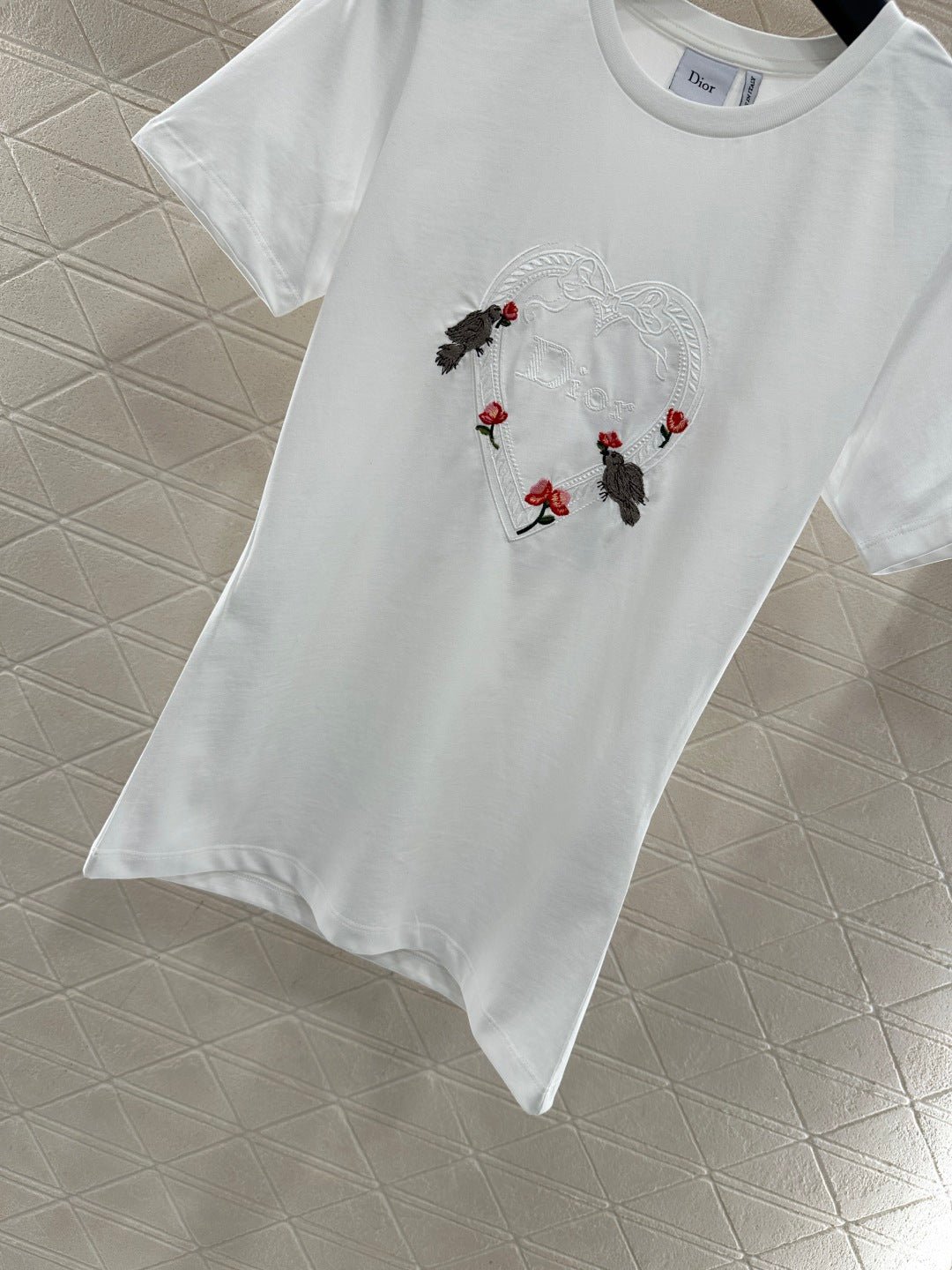 Made of 100% cotton, this breathable and comfortable white T-shirt boasts a premium feel. The fitted short-sleeved design and heart-embroidered details are incredibly sweet! The pure white base is adorned with delicate heart embroidery, while details like red roses and birds add a touch of romance and liveliness. The small label subtly hints at the brand’s understated quality. The soft cotton fabric is gentle on the skin and breathable, and the fitted silhouette accentuates clean lines. Whether worn alone with jeans for a fresh look or layered under a blazer for a sweet and cool style, it effortlessly becomes the perfect finishing touch to any outfit, a romantic treasure in your summer wardrobe.