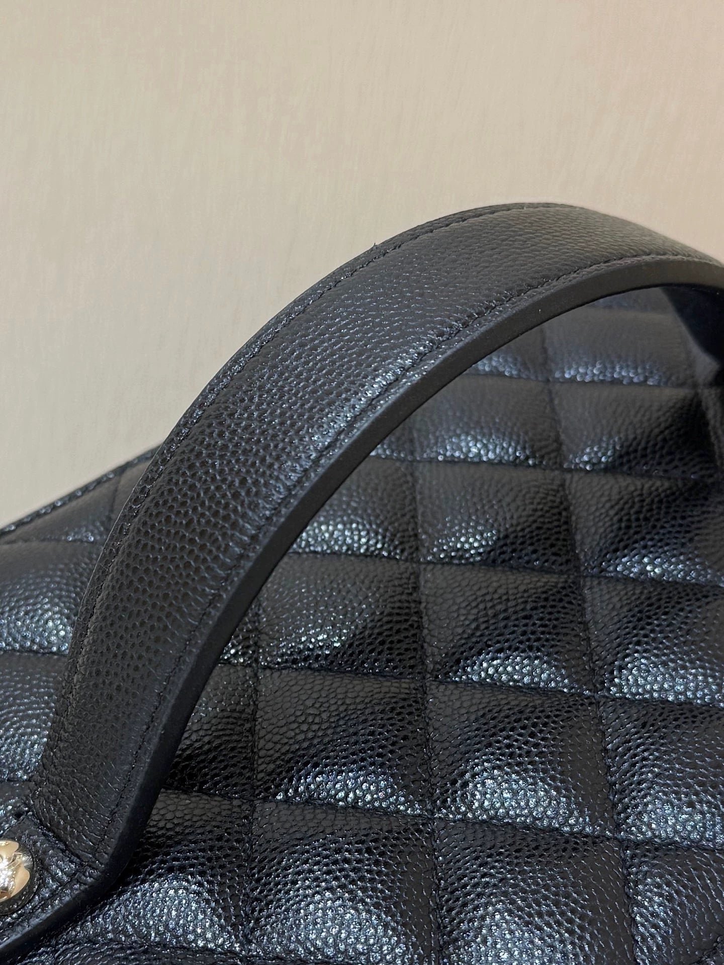 Classic diamond quilted design, black pebbled leather, gold hardware. Large capacity, well-organized compartments, suitable for everyday makeup organization.